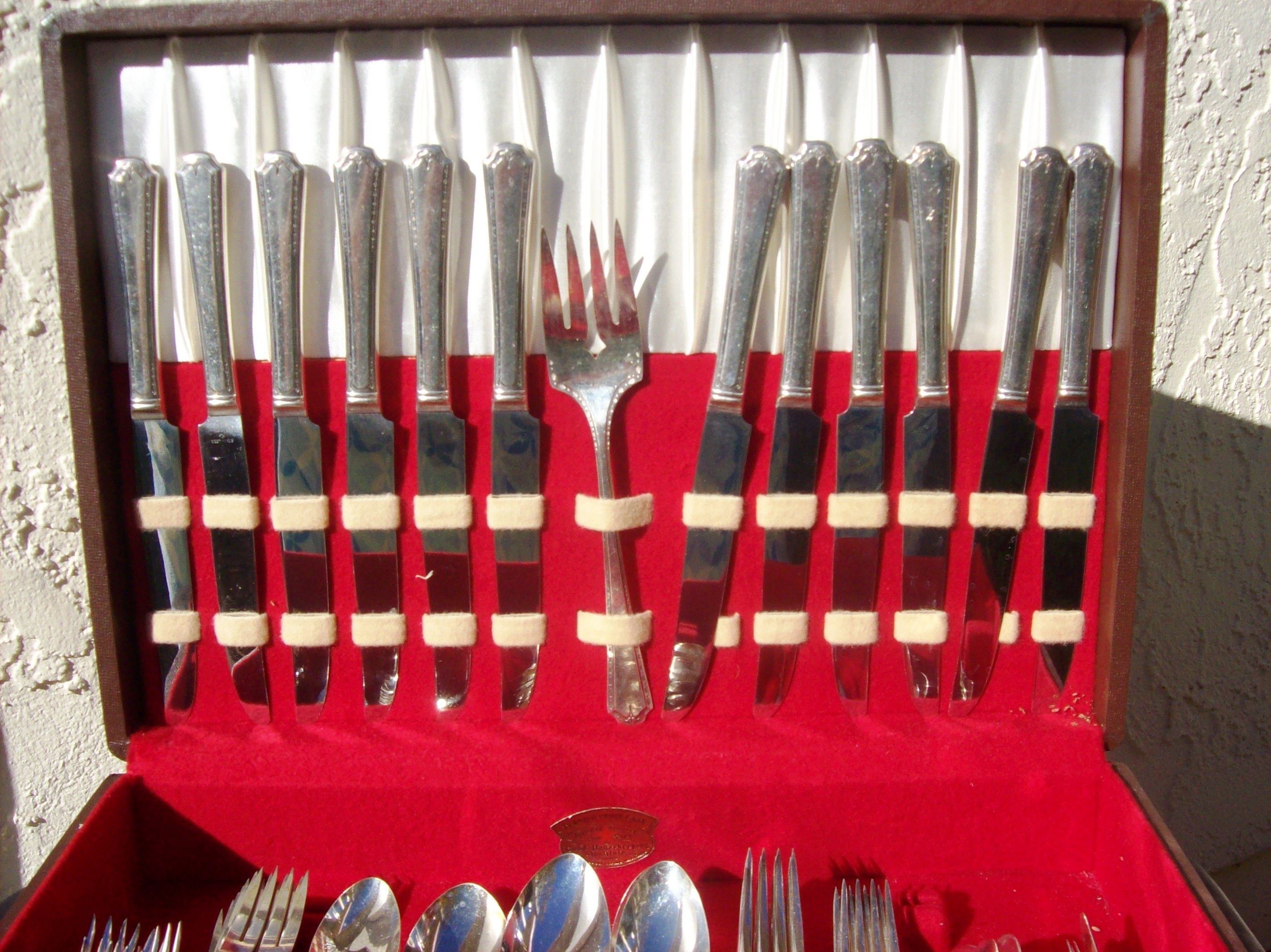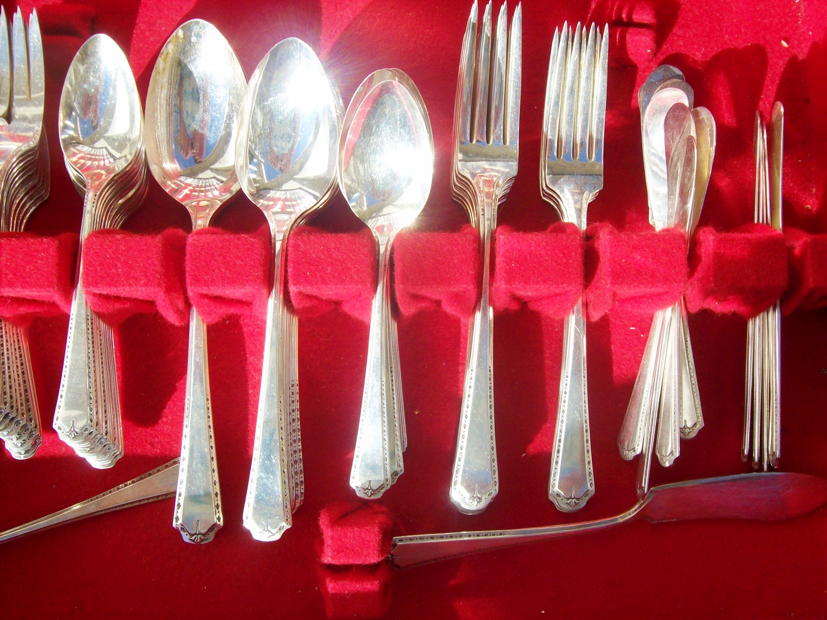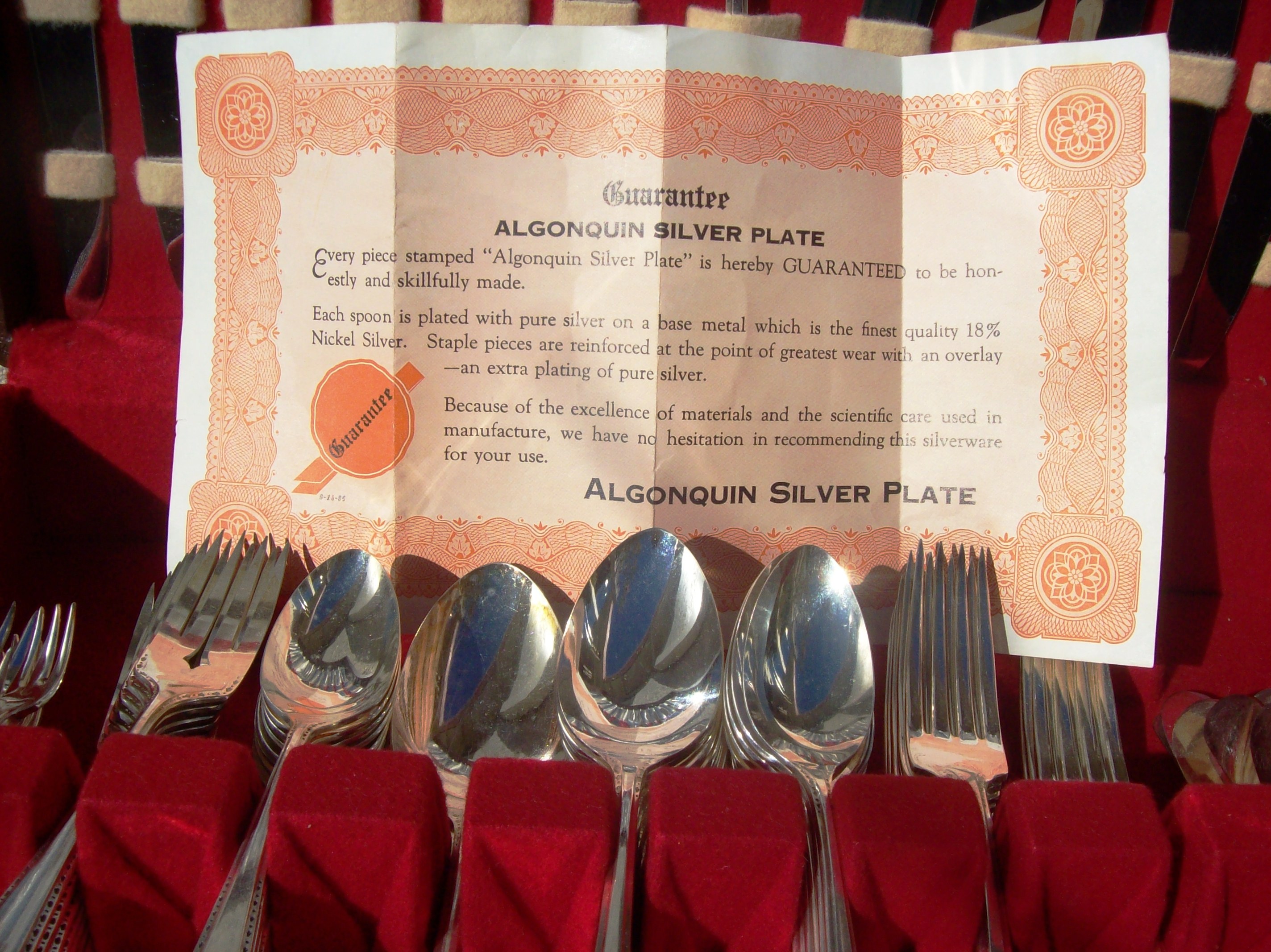 THIS 1923 ALGONQUIN BARONET TUDOR PLATE (ONENIDA COMMUNITY)SERVICE FOR 12 IS PRISTINE AND HAS NEVER BEEN USED BY MY GREAT AUNT WHO PASSED AWAY RECENTLY IT HAS BEEN IN STORAGE.THE SERVICE FOR 12 PLUS ADDITIONA PIECES COMES IN THE ORIGINAL STORAGE BOX IN BROWN LEATHER WITH A SMALL WHITE WOODEN HANDLE TO USE TO OPEN. THE INTERIOR OF THE BOX IS RED VELVET AND WHITE SATIN. IN SIDE THE CASE IS THE ORIGINAL GOOD HOUSEKEEPING SEAL, AS WELL AS A PRINTED .GUARANTEE; DESCRIBED AS FOLLOWS (ALGINQUIN SILVER PLATE.EACH PIECE STAMPED ALGONQUIN SILVER PLATE IS HEARBY GUARANTEED TO BE HONESTLY AND SKILLFULLY MADE .EACH PIECE IS PLATED WITH PURESILVER ON A BASE METAL WHICH IS 18% NICKLE SILVER.STAPLE PIECES ARE REINFORCED AT THE POINT OF GREATEST WEAR WITH AN OVERLAY - AN EXTRA PLATING OF PURE SILVER. "ALGONQUIN SILVER PLATE")