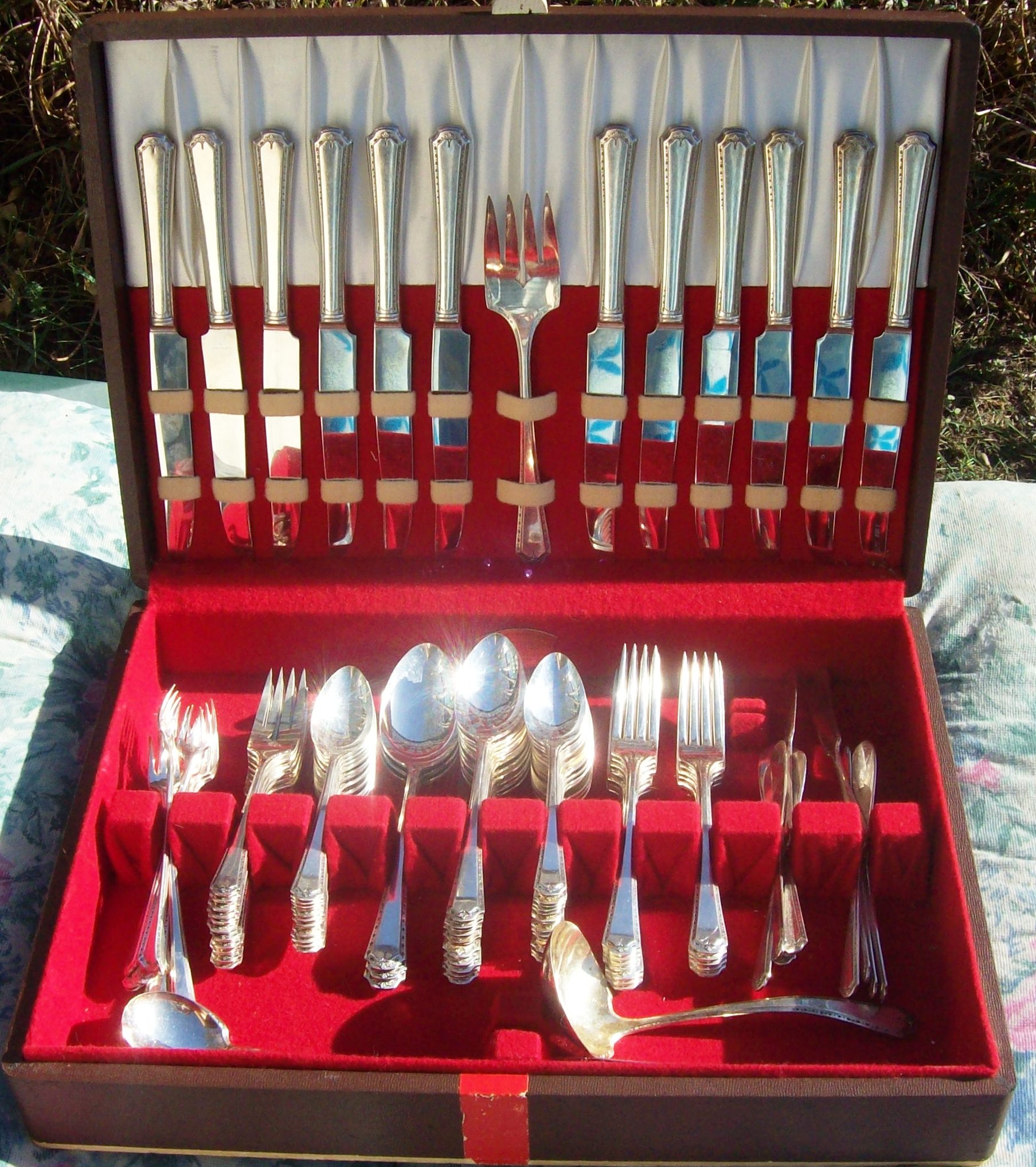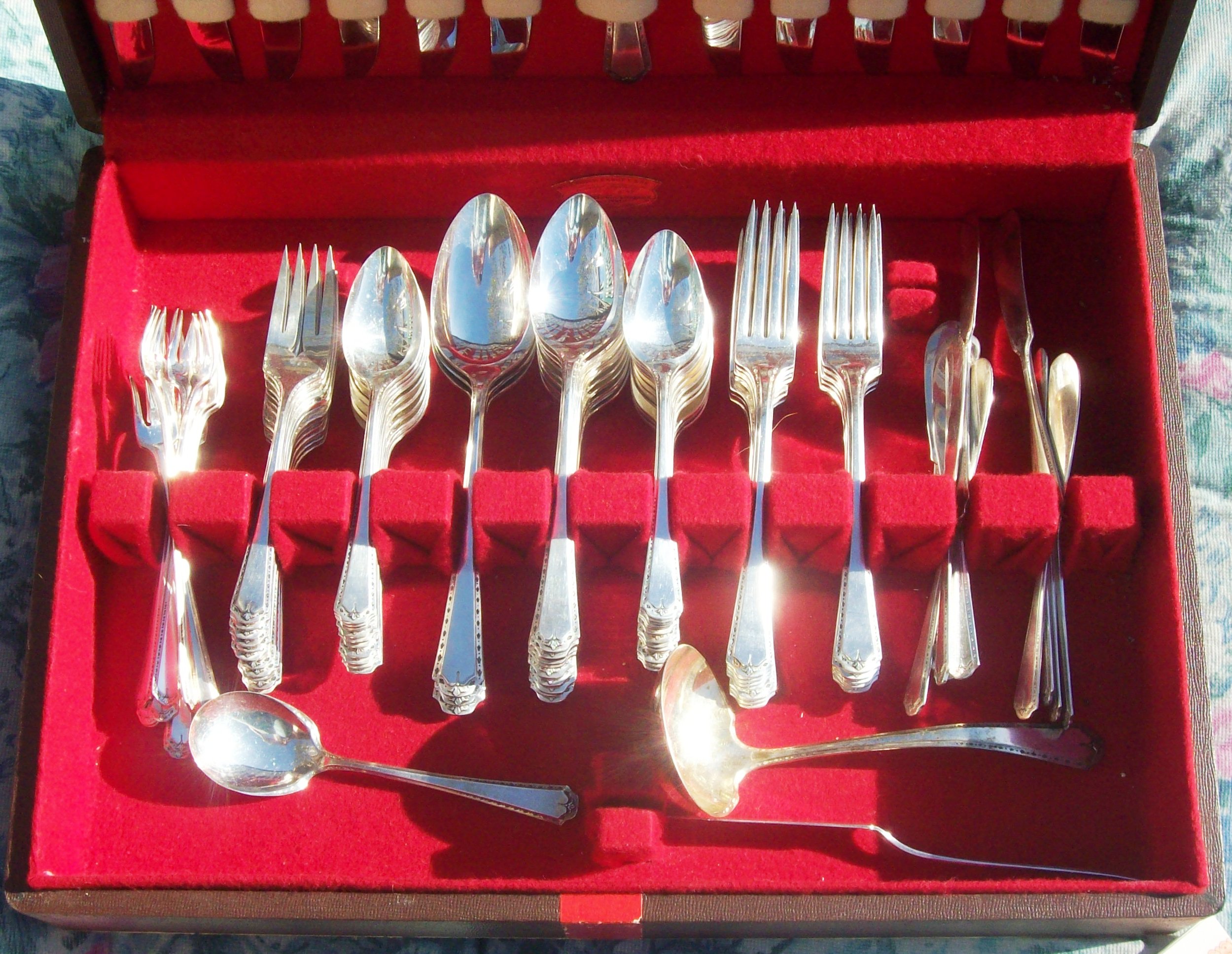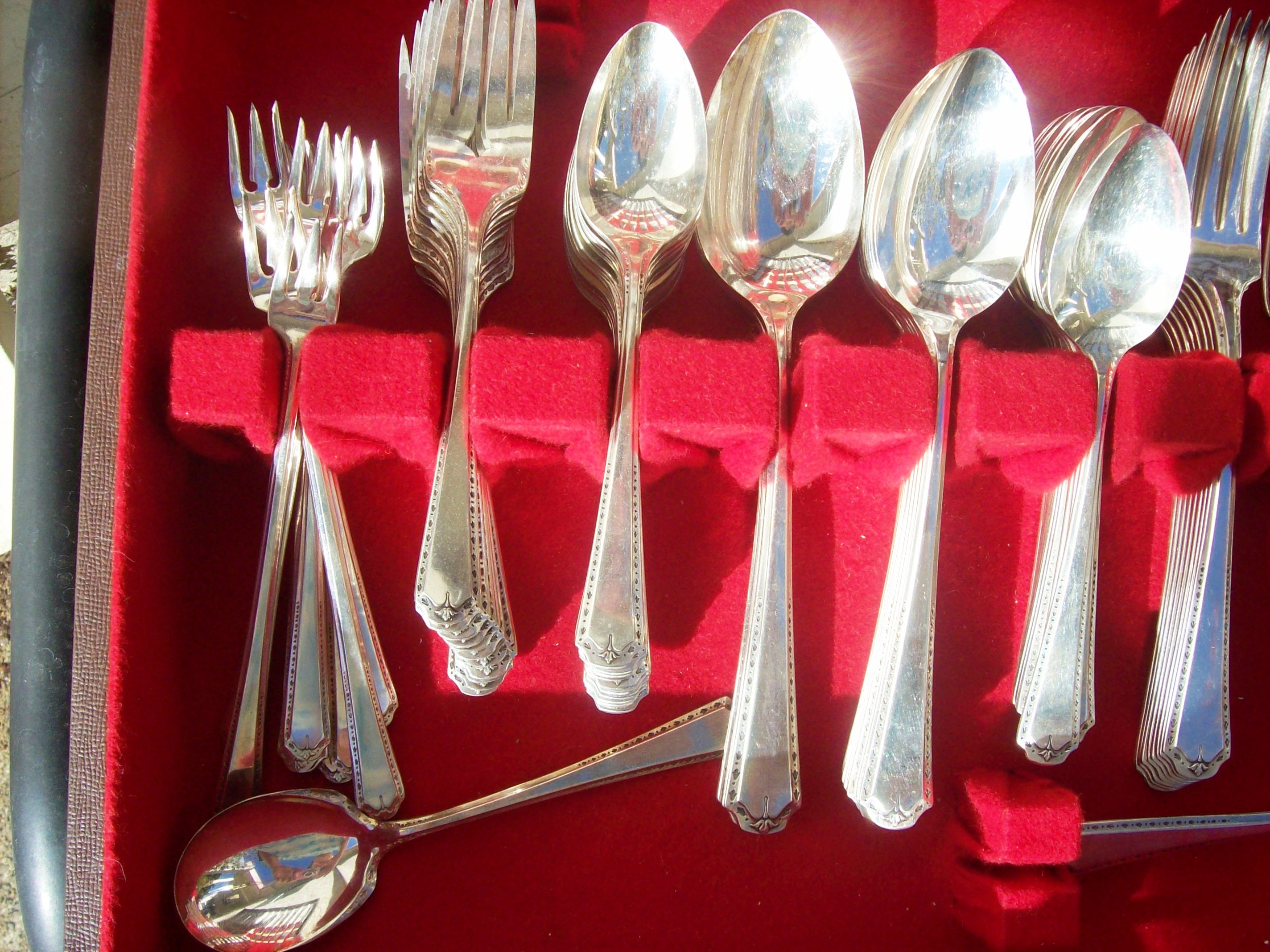 THIS 1923 ALGONQUIN BARONET TUDOR PLATE (ONENIDA COMMUNITY)SERVICE FOR 12 IS PRISTINE AND HAS NEVER BEEN USED BY MY GREAT AUNT WHO PASSED AWAY RECENTLY IT HAS BEEN IN STORAGE.THE SERVICE FOR 12 PLUS ADDITIONA PIECES COMES IN THE ORIGINAL STORAGE BOX IN BROWN LEATHER WITH A SMALL WHITE WOODEN HANDLE TO USE TO OPEN. THE INTERIOR OF THE BOX IS RED VELVET AND WHITE SATIN. IN SIDE THE CASE IS THE ORIGINAL GOOD HOUSEKEEPING SEAL, AS WELL AS A PRINTED .GUARANTEE; DESCRIBED AS FOLLOWS (ALGINQUIN SILVER PLATE.EACH PIECE STAMPED ALGONQUIN SILVER PLATE IS HEARBY GUARANTEED TO BE HONESTLY AND SKILLFULLY MADE .EACH PIECE IS PLATED WITH PURESILVER ON A BASE METAL WHICH IS 18% NICKLE SILVER.STAPLE PIECES ARE REINFORCED AT THE POINT OF GREATEST WEAR WITH AN OVERLAY - AN EXTRA PLATING OF PURE SILVER. "ALGONQUIN SILVER PLATE")