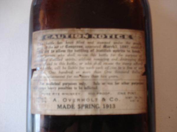 Very Rare Prohibition Pint Bottle of Pure 100 Proof OLD OVERHOLT RYE WHISKEY. Original Bottle. Original Whiskey (stored)