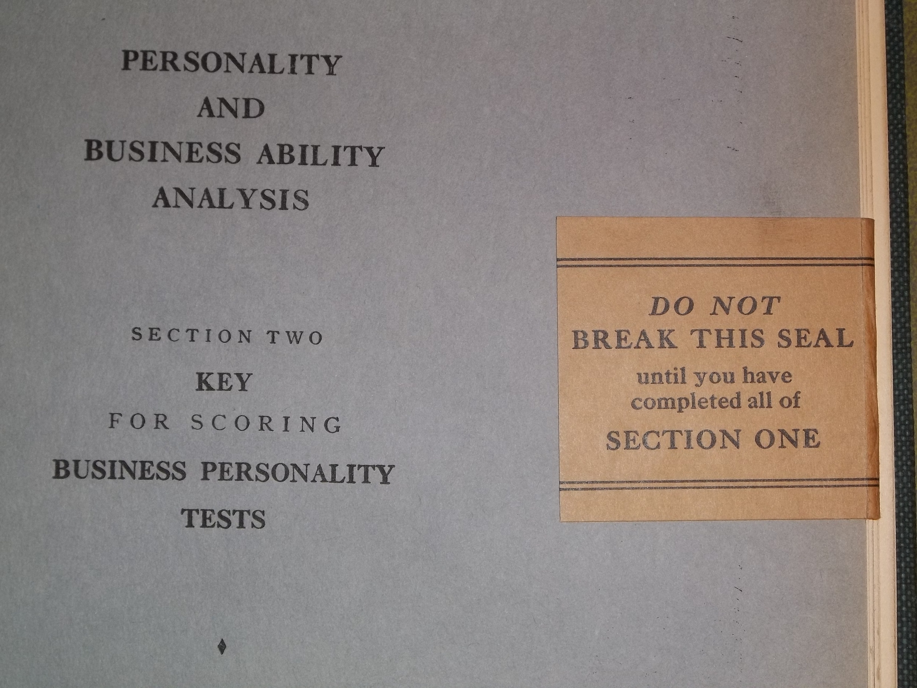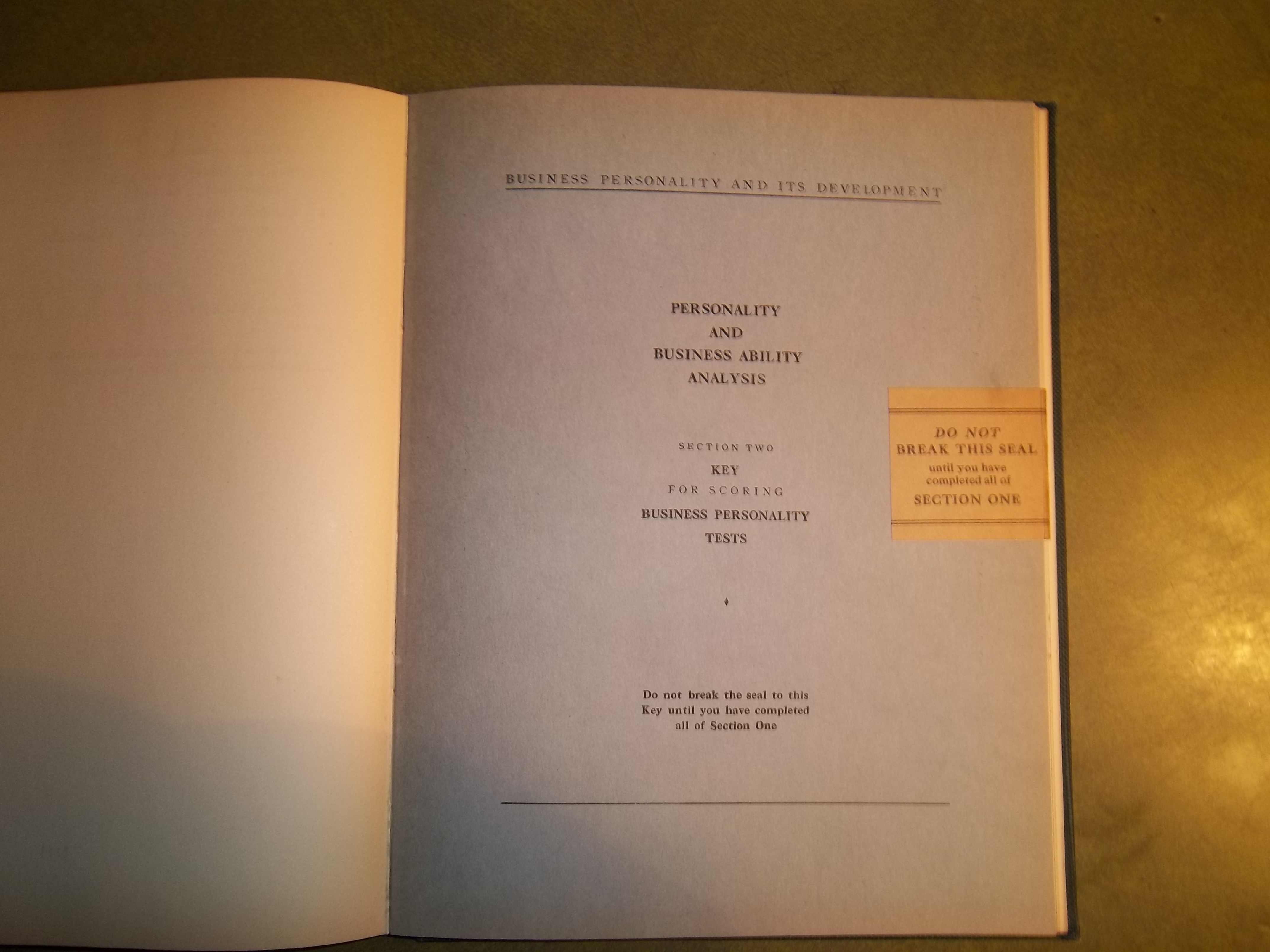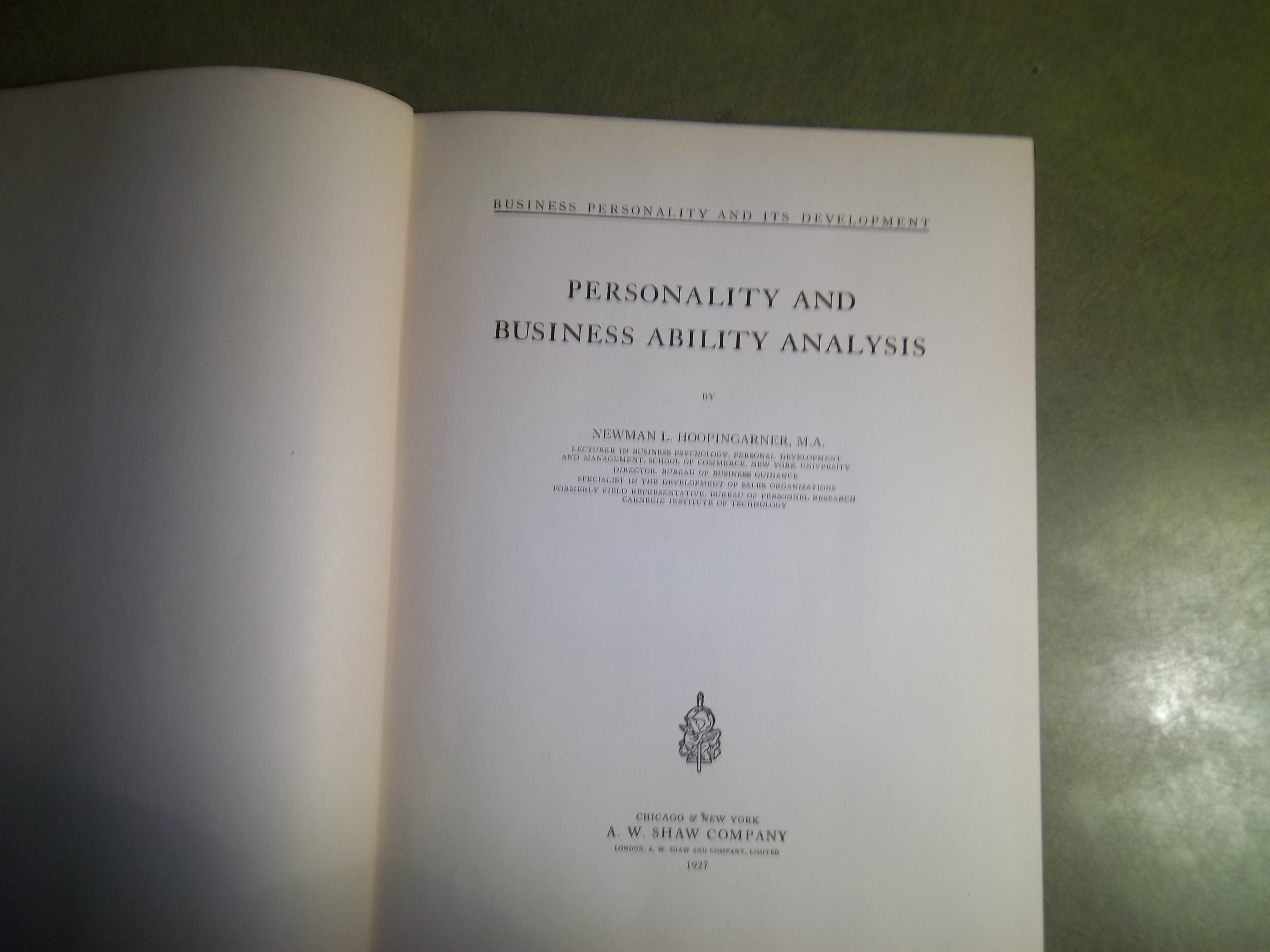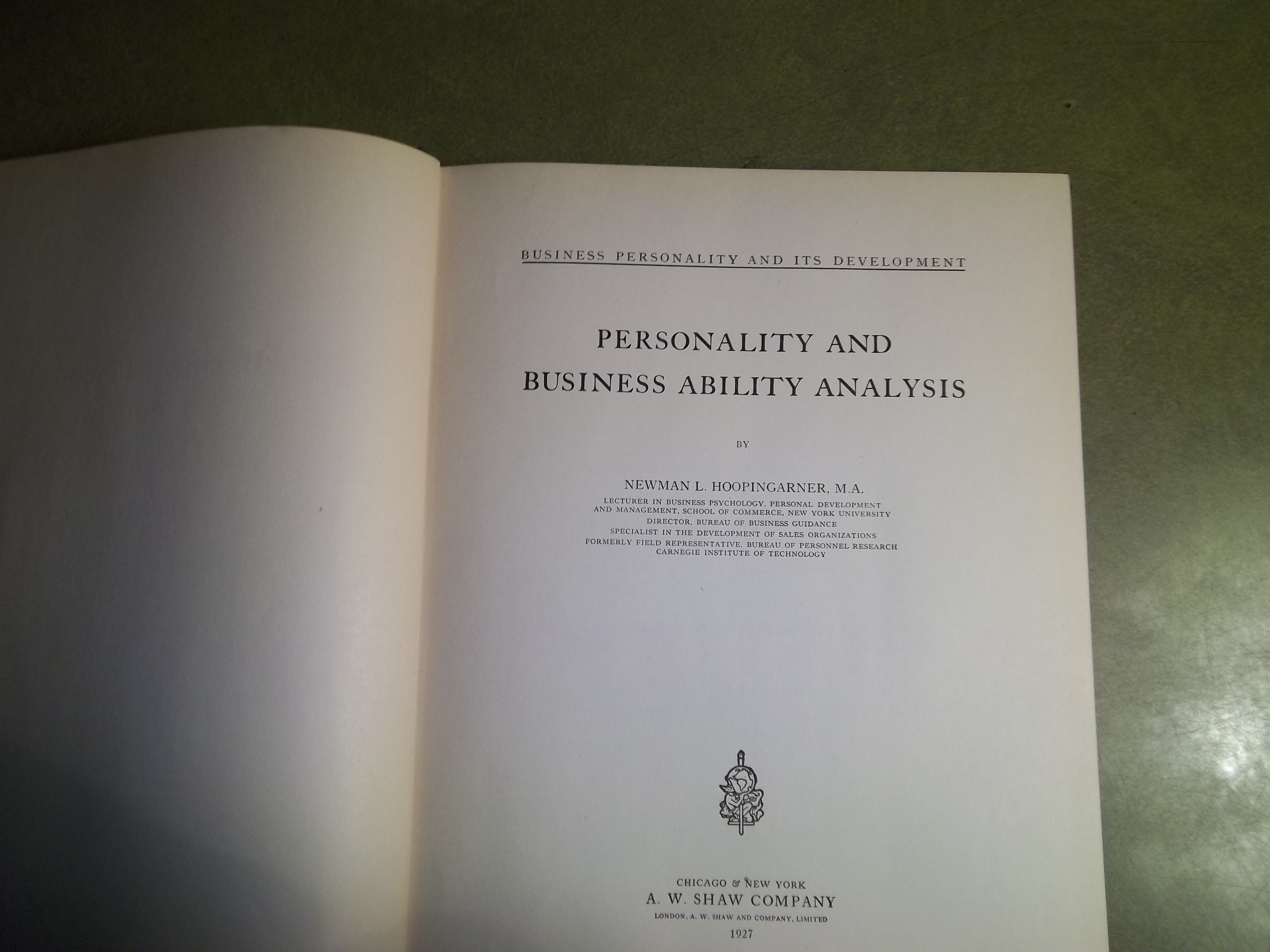 1927 book called Personality and Business Analysis. Book by; Newman L. Hoopingarner, M.A. and from A.W. Shaw Company, Chicago & New York. Book has green plain cover with red on the spine that says: Newman L. Hoopingarner, Personality and Business Ability Analysis, A.W. Shaw Company. Looks like it was never actually used. There is a section of test answers that is still sealed and never opened. The book has 89 pages and looks like its a first print (1927)