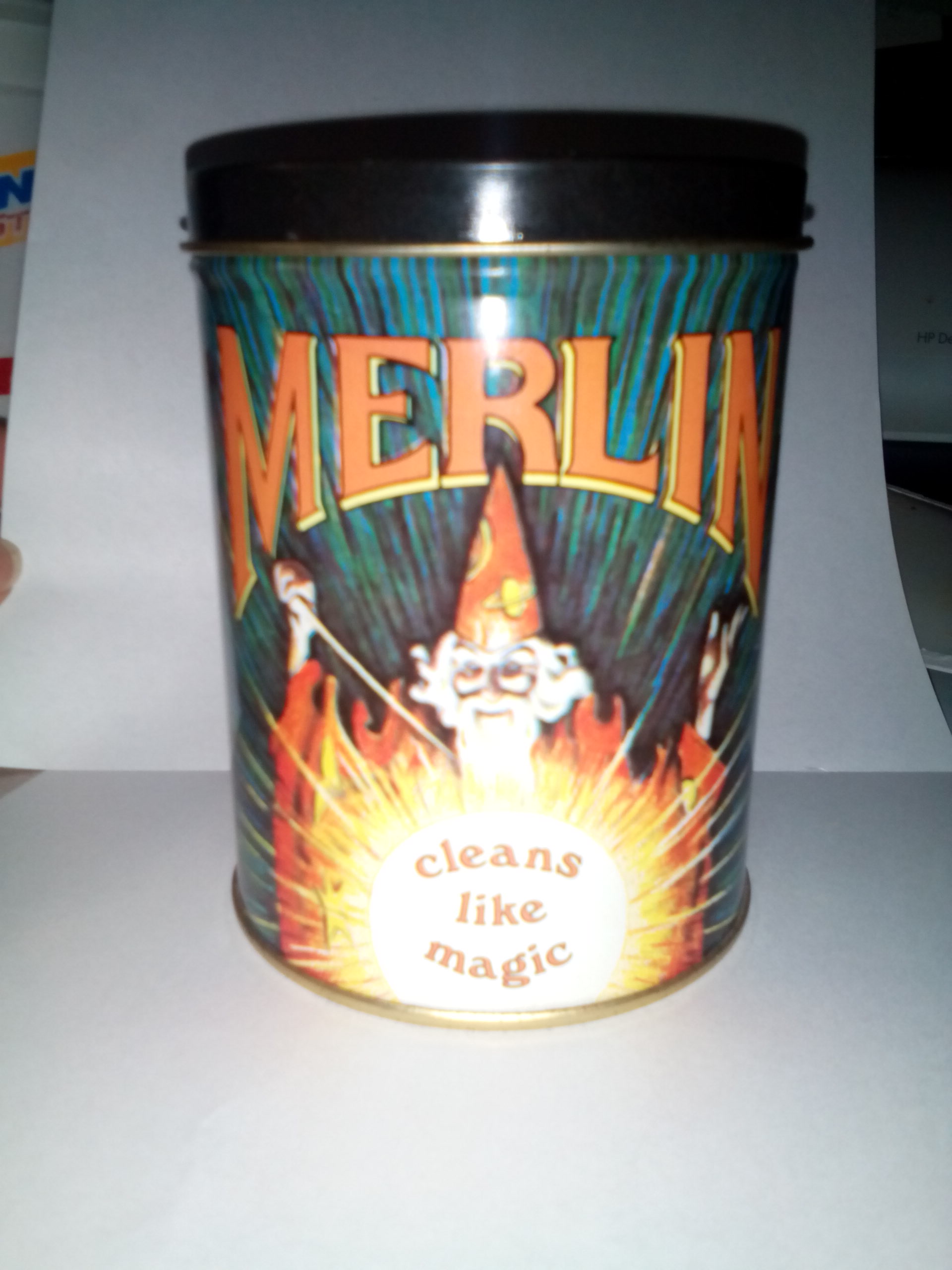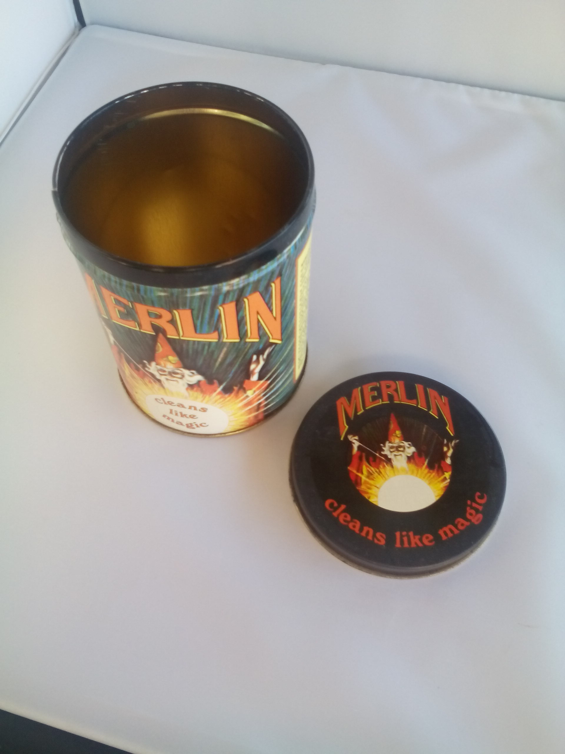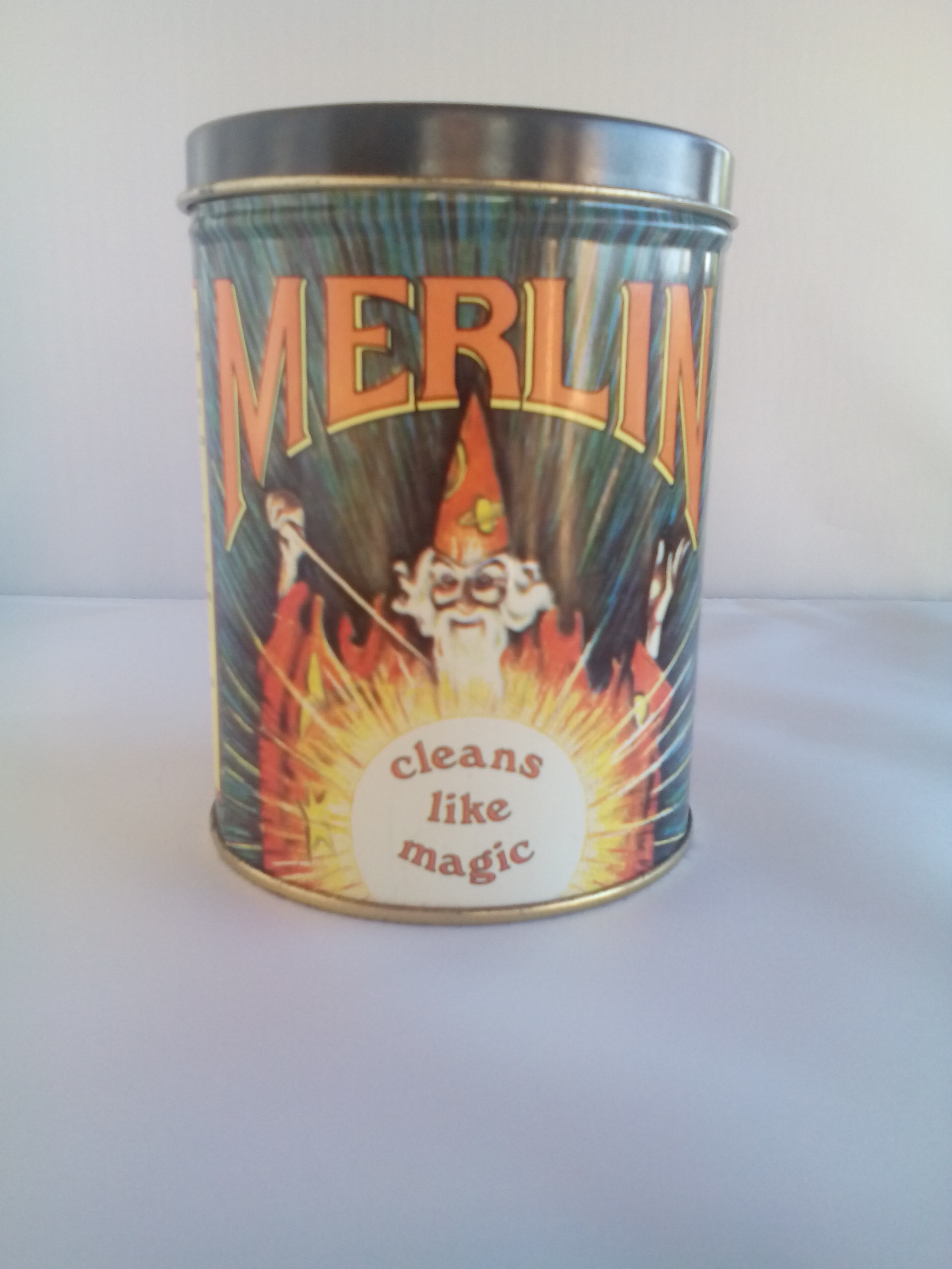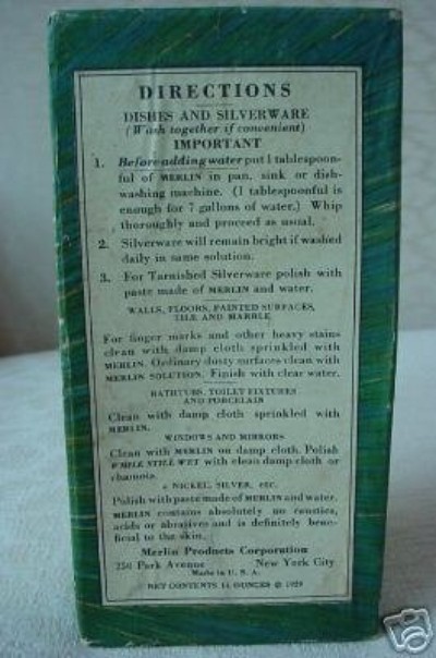 1929, the Merlin Products Corporation in New York made a powdered detergent that was sold in a box with paper labeling. I have found that this box has sold at several Ebay online auctions, but I cannot find much reference of a product sold in a tin. The tin that I have has very similar graphics as the boxed product.