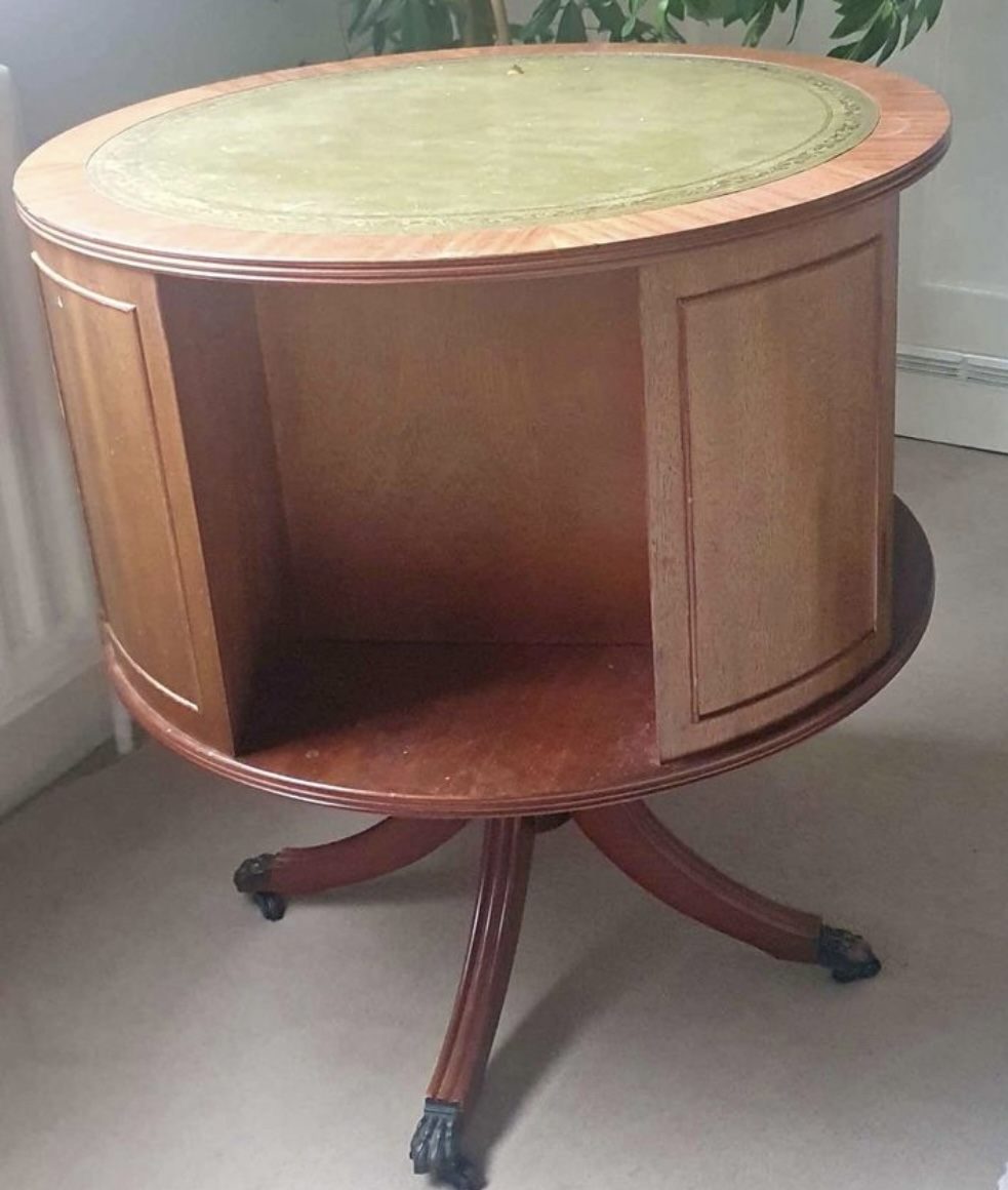 I am unsure exactly on origins of this or value. Can anyone point me in the right direction? Believed 1930s-1950s rotating drum table made from mahogany with green leather top