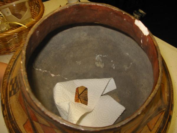 1930 acoma jug I sent a picture to Lens in calif.they said it was by the acoma because of the color and geometric design on the jug.I believe it to be a water jug.It has some damage and the rim is cracked and it has a piece out but I do have the piece.It has a hairline crack also in it is in one piece.