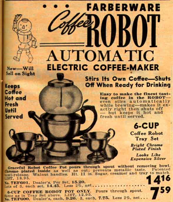 I have a S.W. Farber farberware model 600 automatic coffee maker also called the coffee robot.It has chrome bottom,single walnut handle,and a dunbar glass globe missing lid