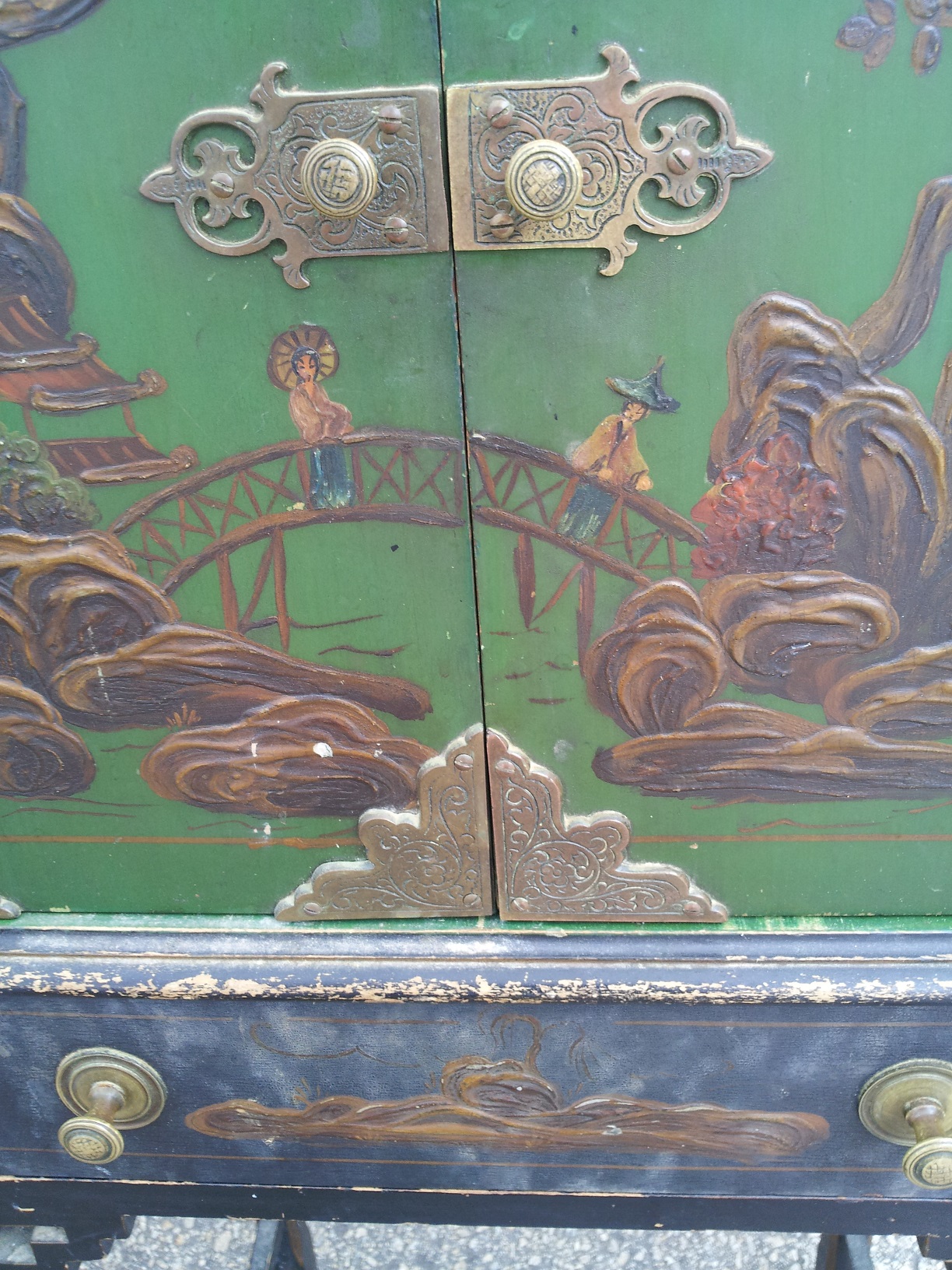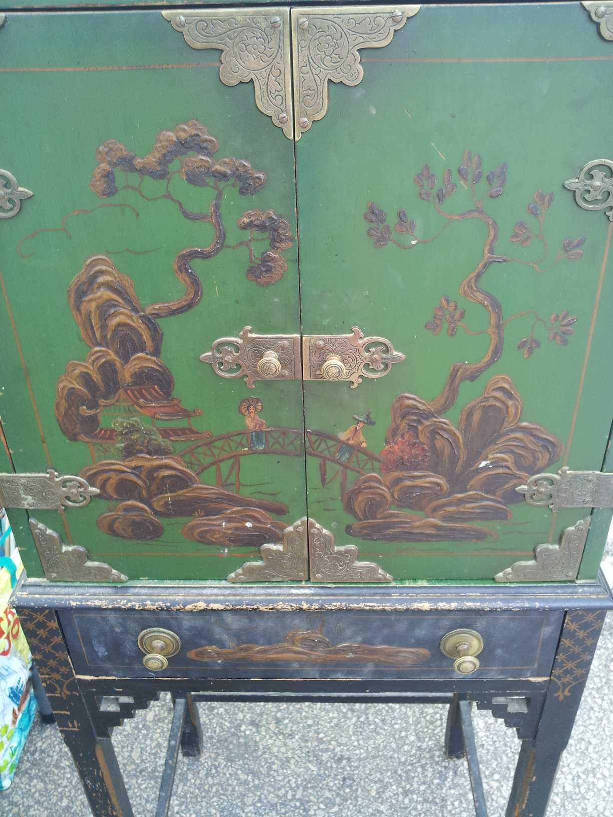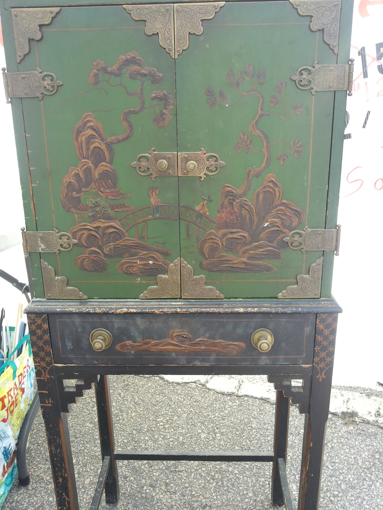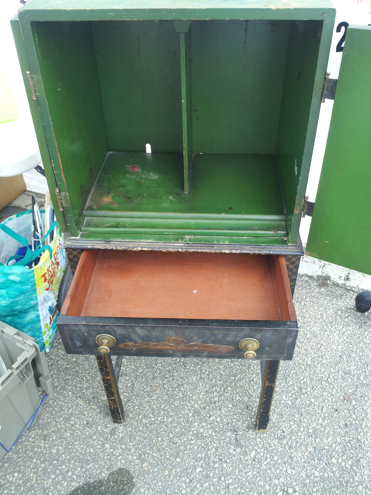 From what I have learned through research is that it's a Telephone Cabinet/Stand from the 1930's. It's handpainted, which is raised like a 3D effect painting. It's in pretty good shape, except for the top needs a little attention, otherwise would make a great decorative peice. Does anyone have anymore info on this peice as to it's history or value?