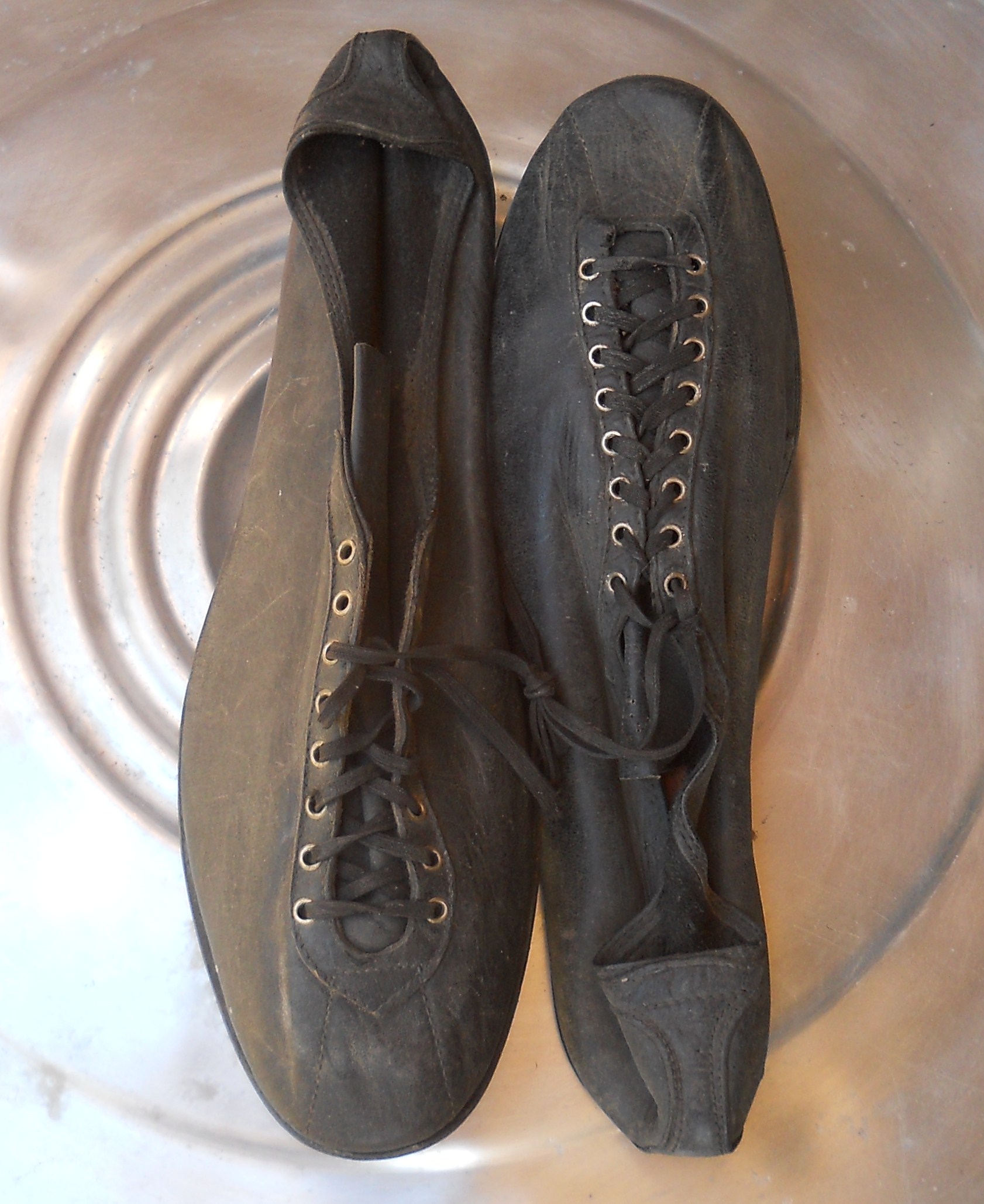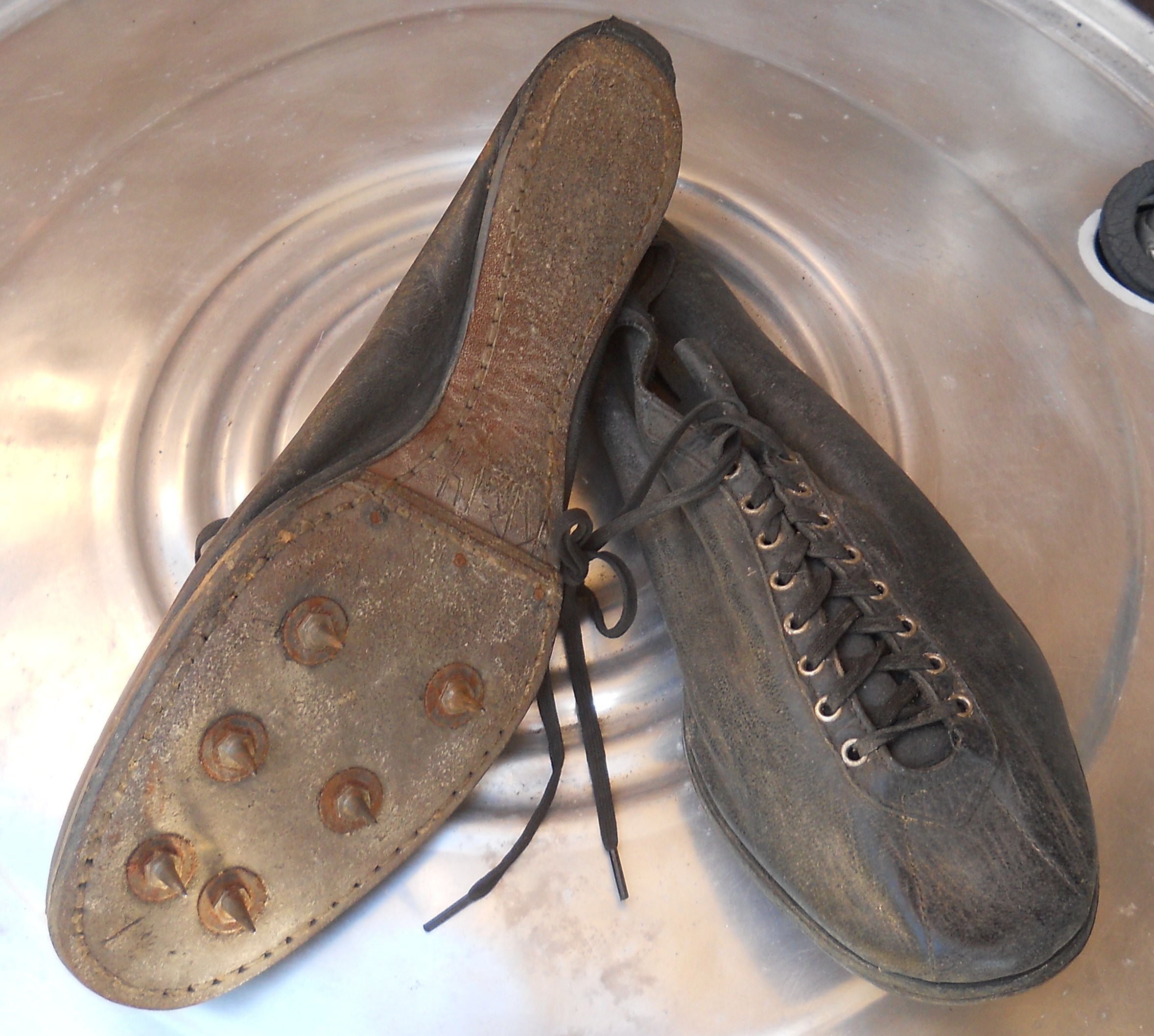 What I have here is a pair of 1930's Adolf Dassler Sprint Shoes. I was told by a family member they are original and from what I gleen from the limited information on line they are correct. They are a size 9 1/2 men's with six 5/8 " spikes on each.