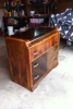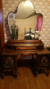 It has been well-kept up and polished over the years. However, as with any used furniture, there are a few scratches from normal wear and tear. Notably there is some oil/grease damage to the bottom of the vanity and moving scratches on the left side of the dresser.