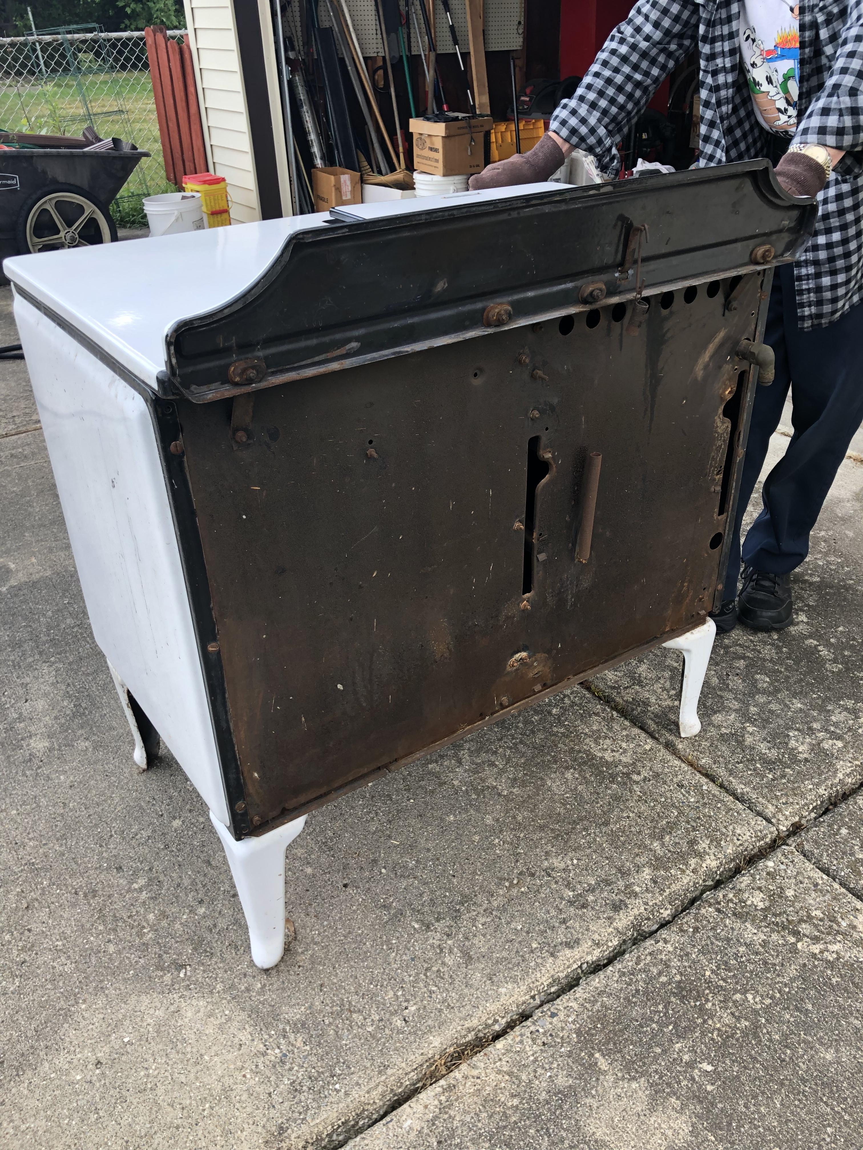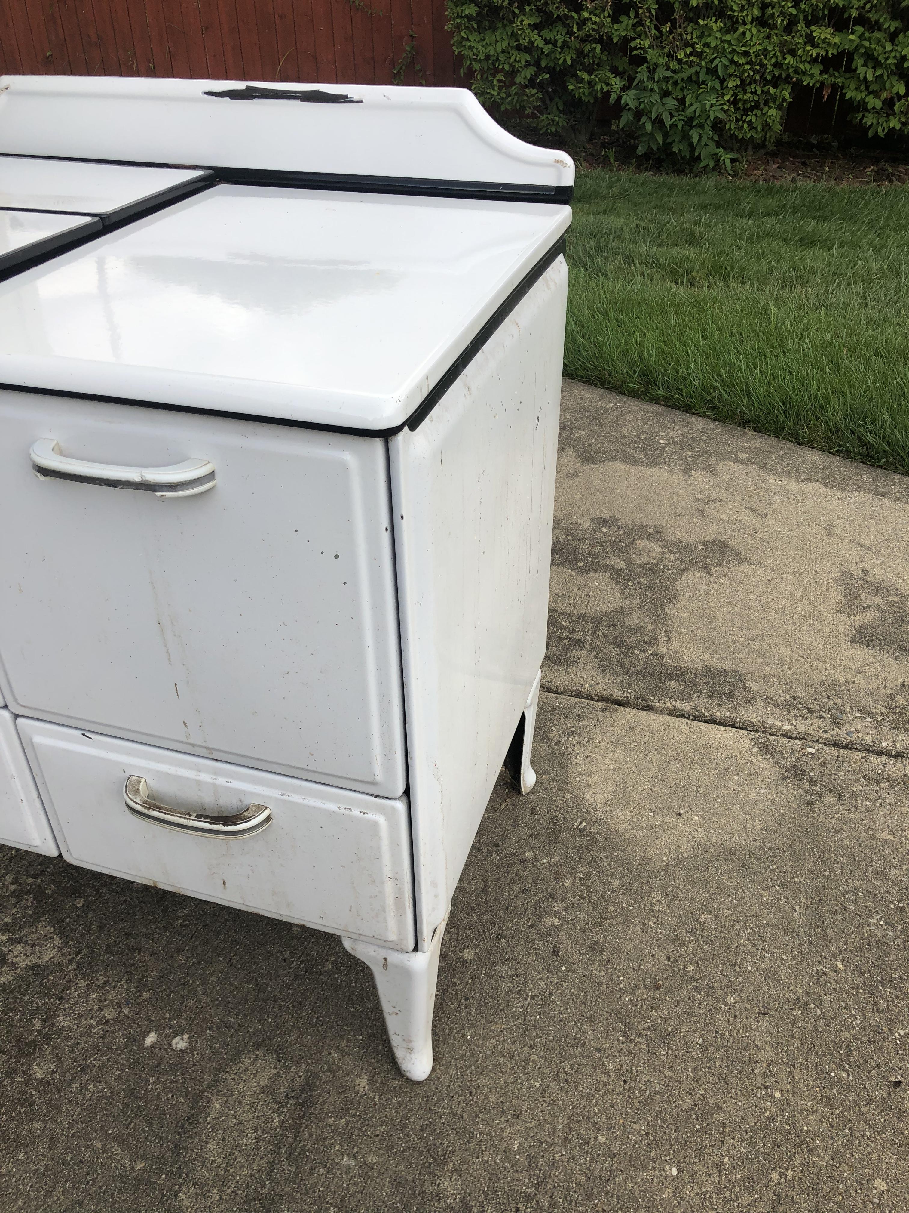 History Purchased by my Great Aunt sometime in the 1930’s. It was used for sometime and then retired to her basement. In the 1990’s my Uncle took the stove and has stored it in his garage since that time.