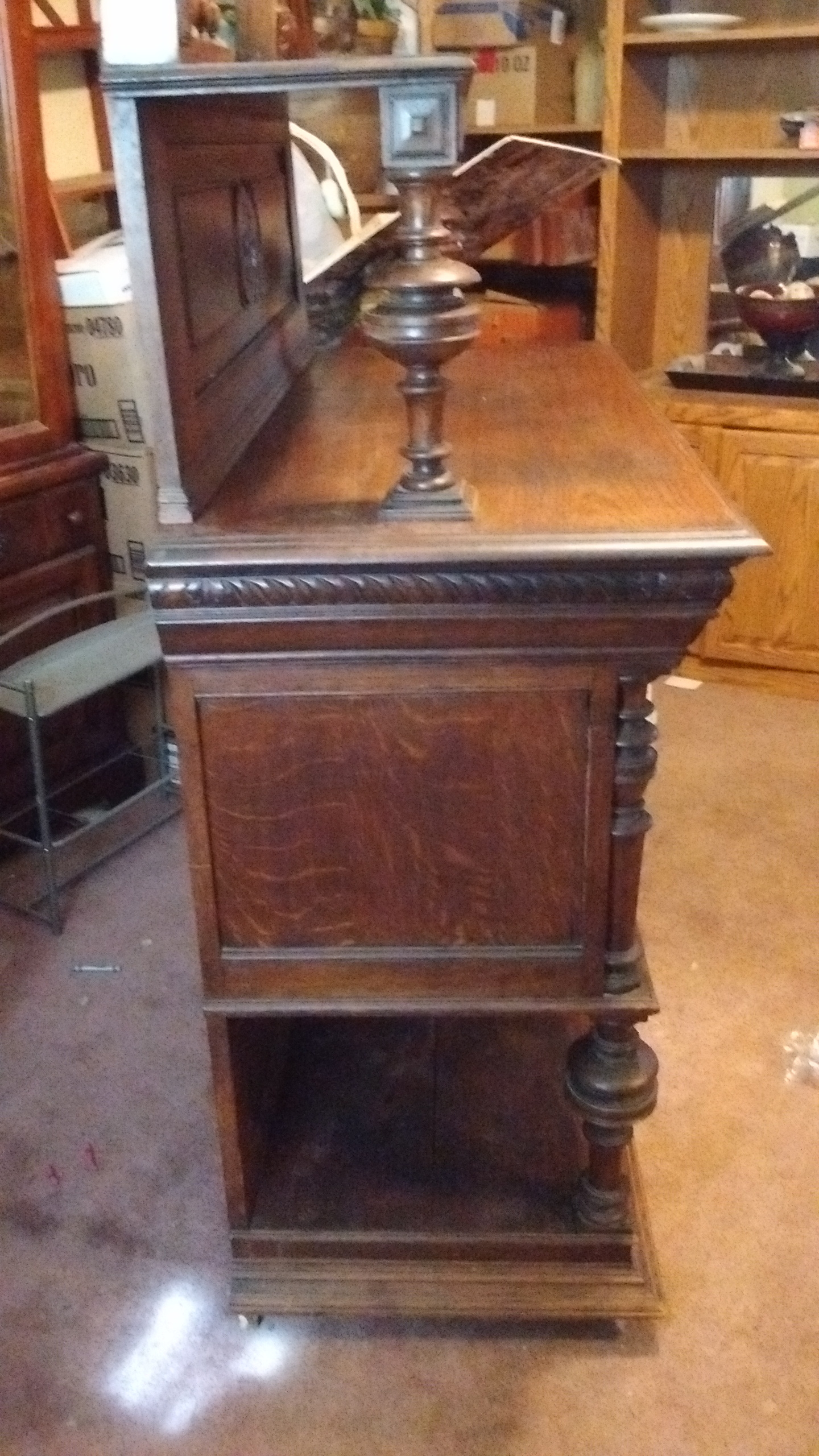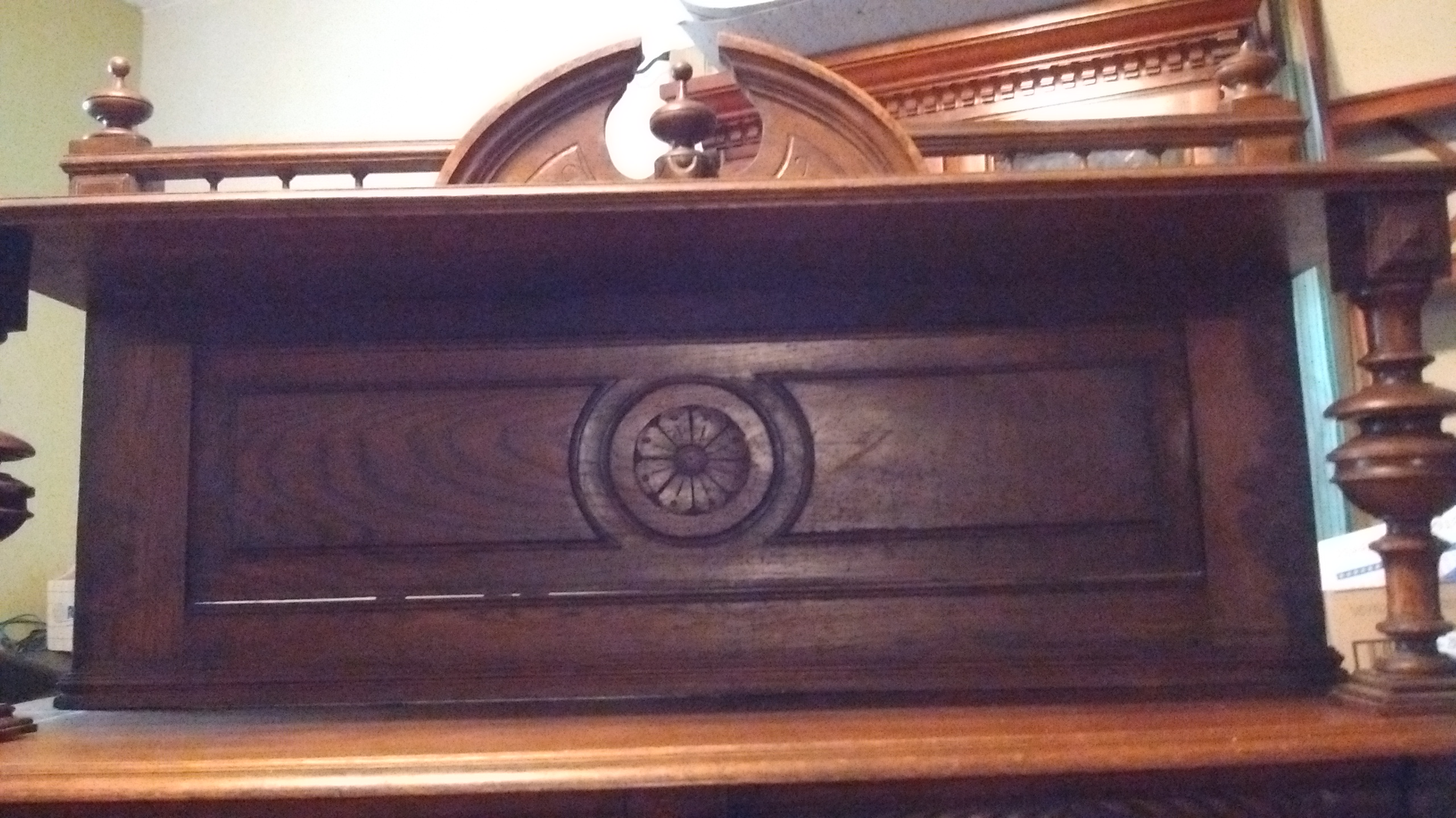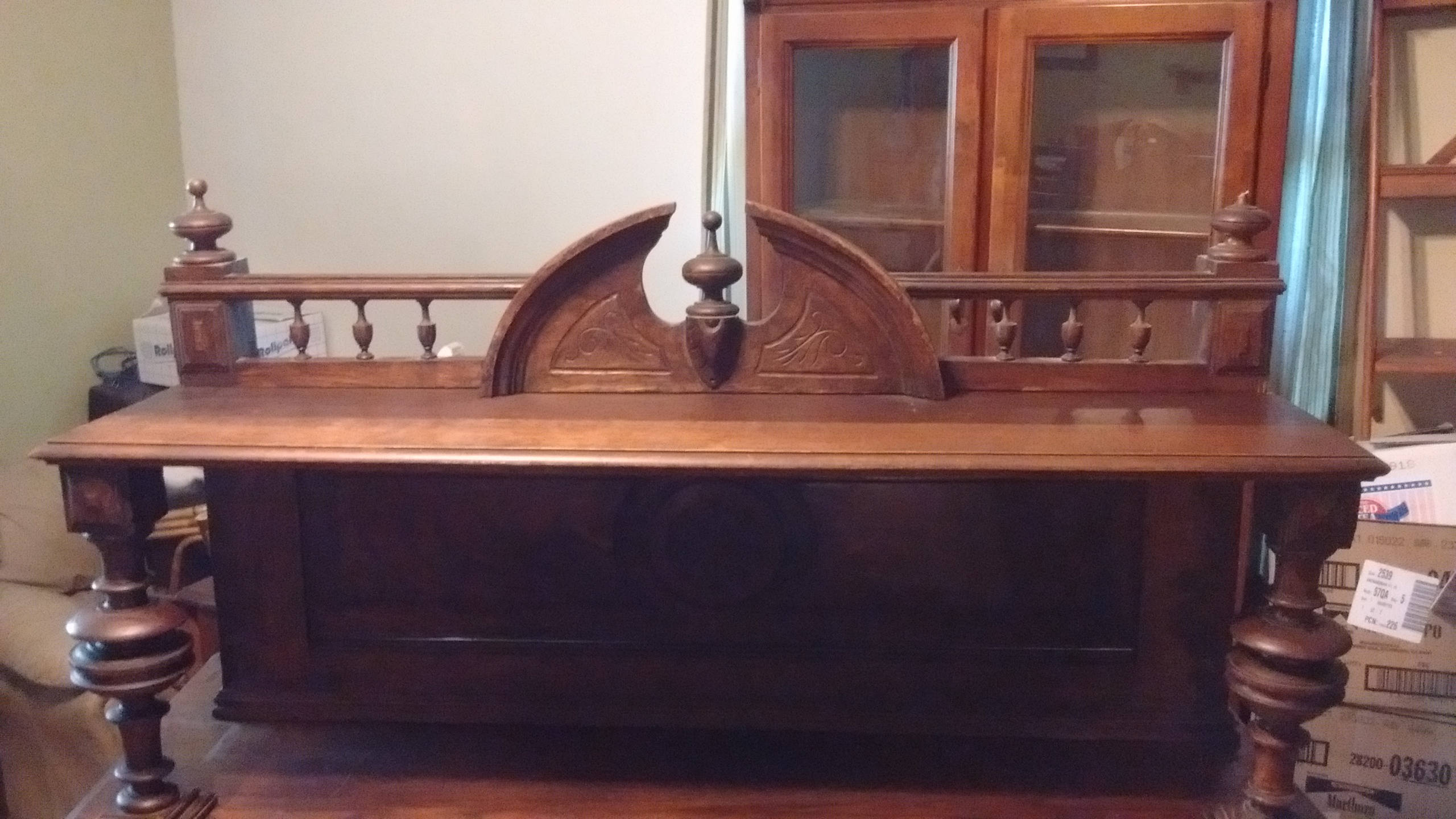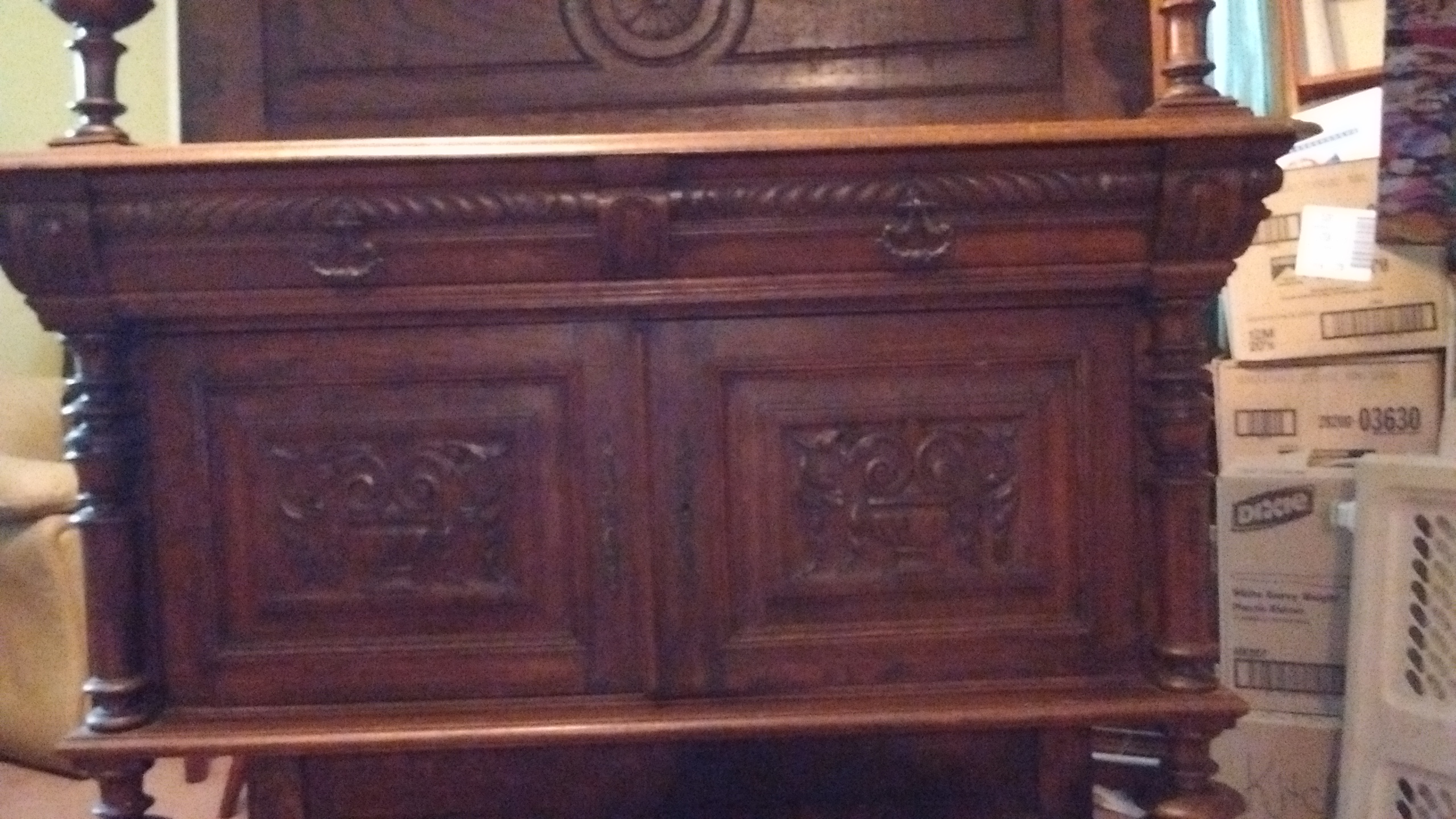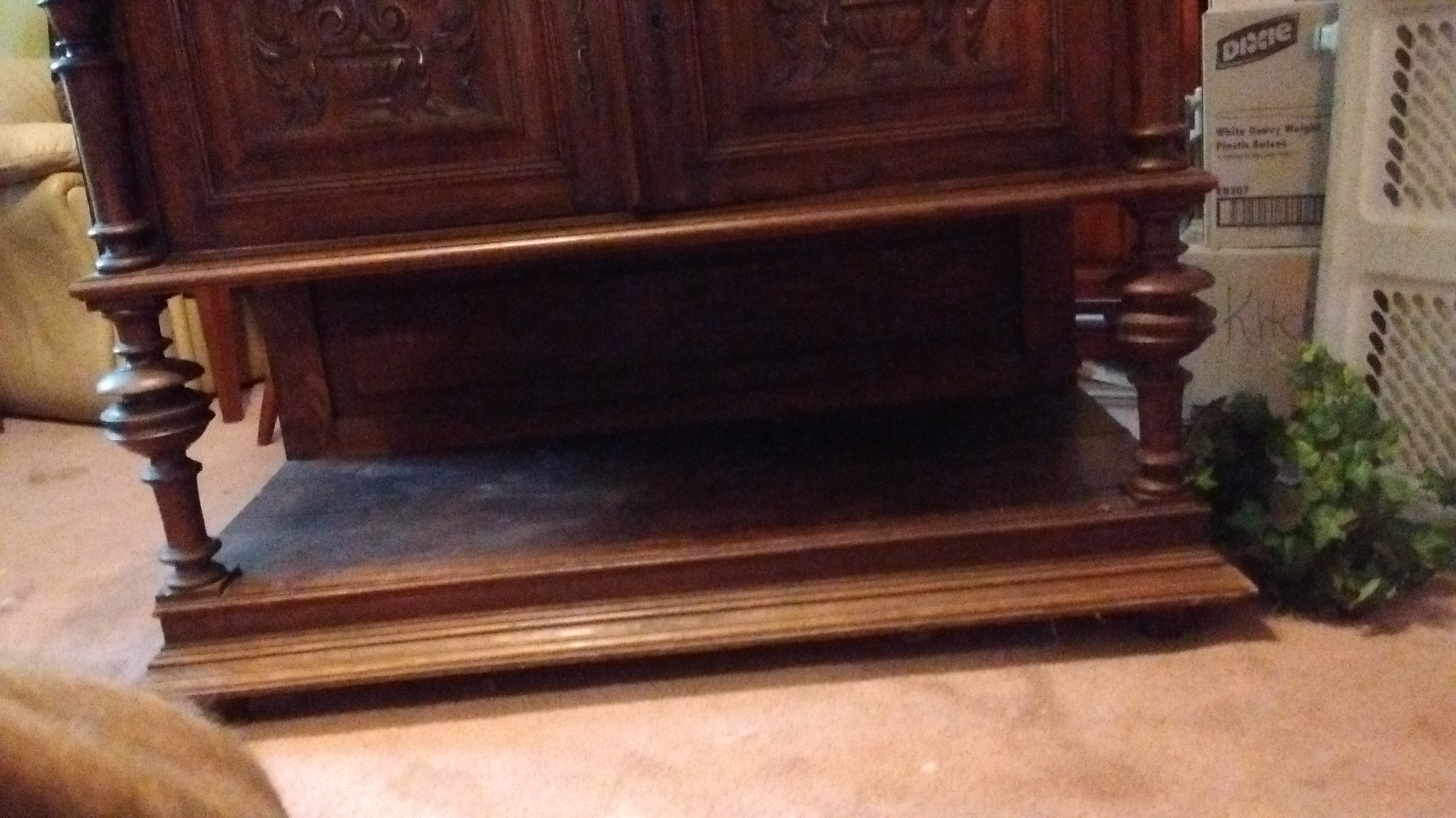 Bought from family member stating it was 1930s German made furniture 2 Doors That Swing open to drawers that slide open with a table-top that has a decorative shelf stabilized by pillars that come apart to move open bottom real wood photos this is what we need