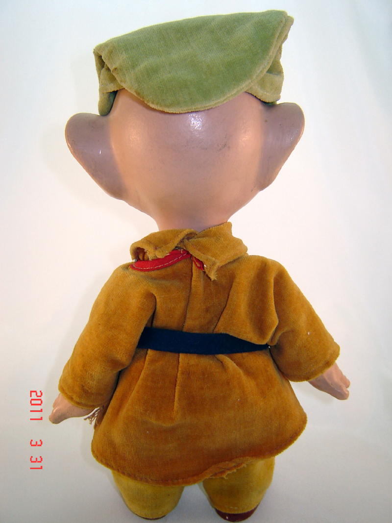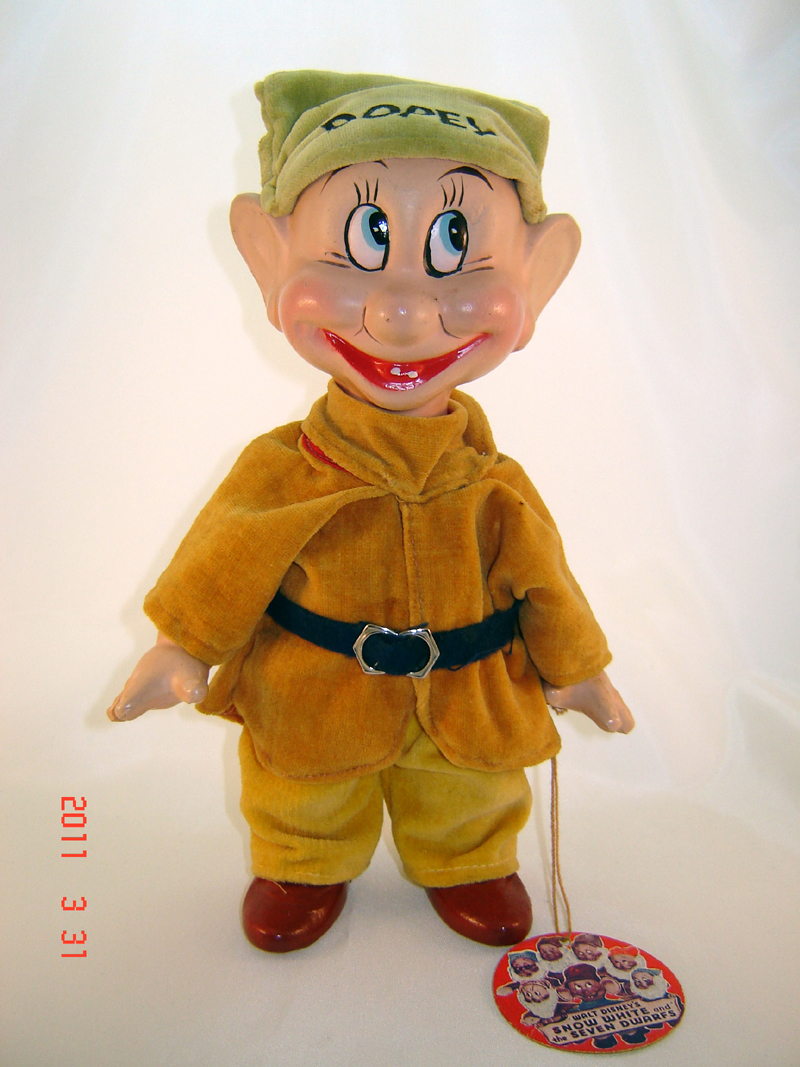 When I was sixteen I found this doll in a brown paper bag between the floor joists in my great-aunt's attic. My aunt said she bought it for her daughter but the daughter hated it and shoved it in the bag and hid it in the attic.  She gave it to me and it's been in my mother's curio cabinet ever since 1992.  It has absolutely no damage to the body or clothing, other than being a bit dirty from being under floor boards for 60 years.