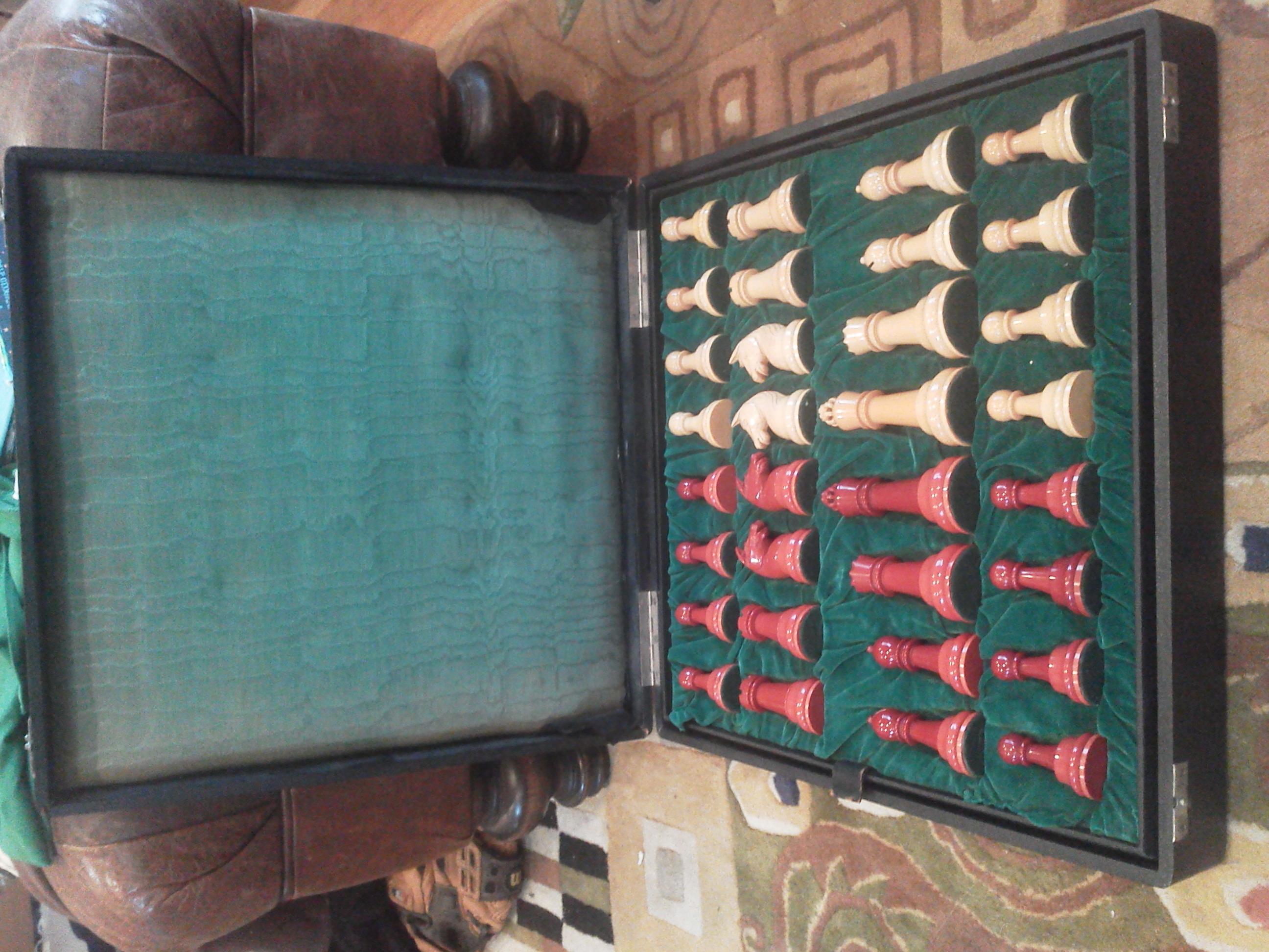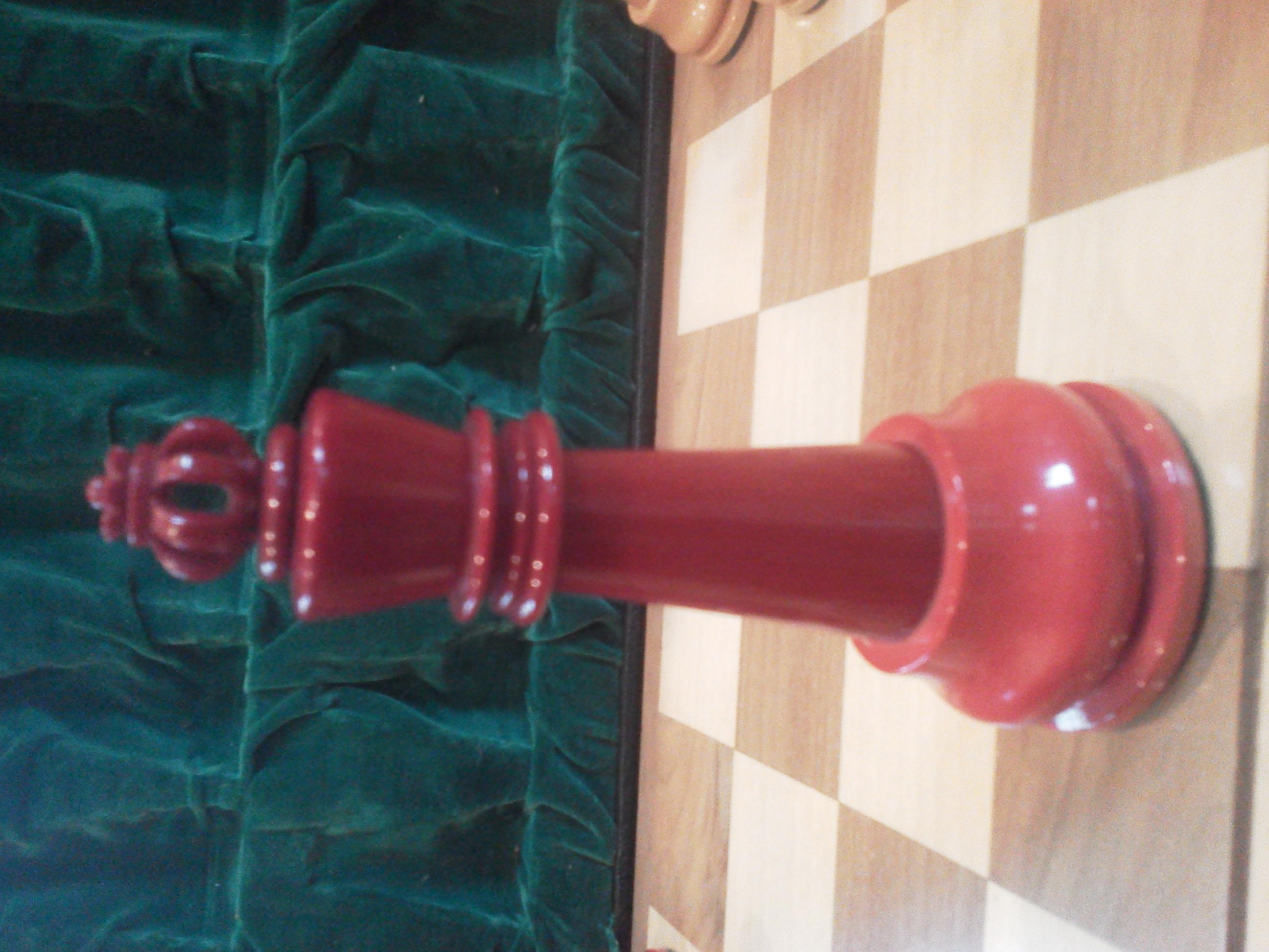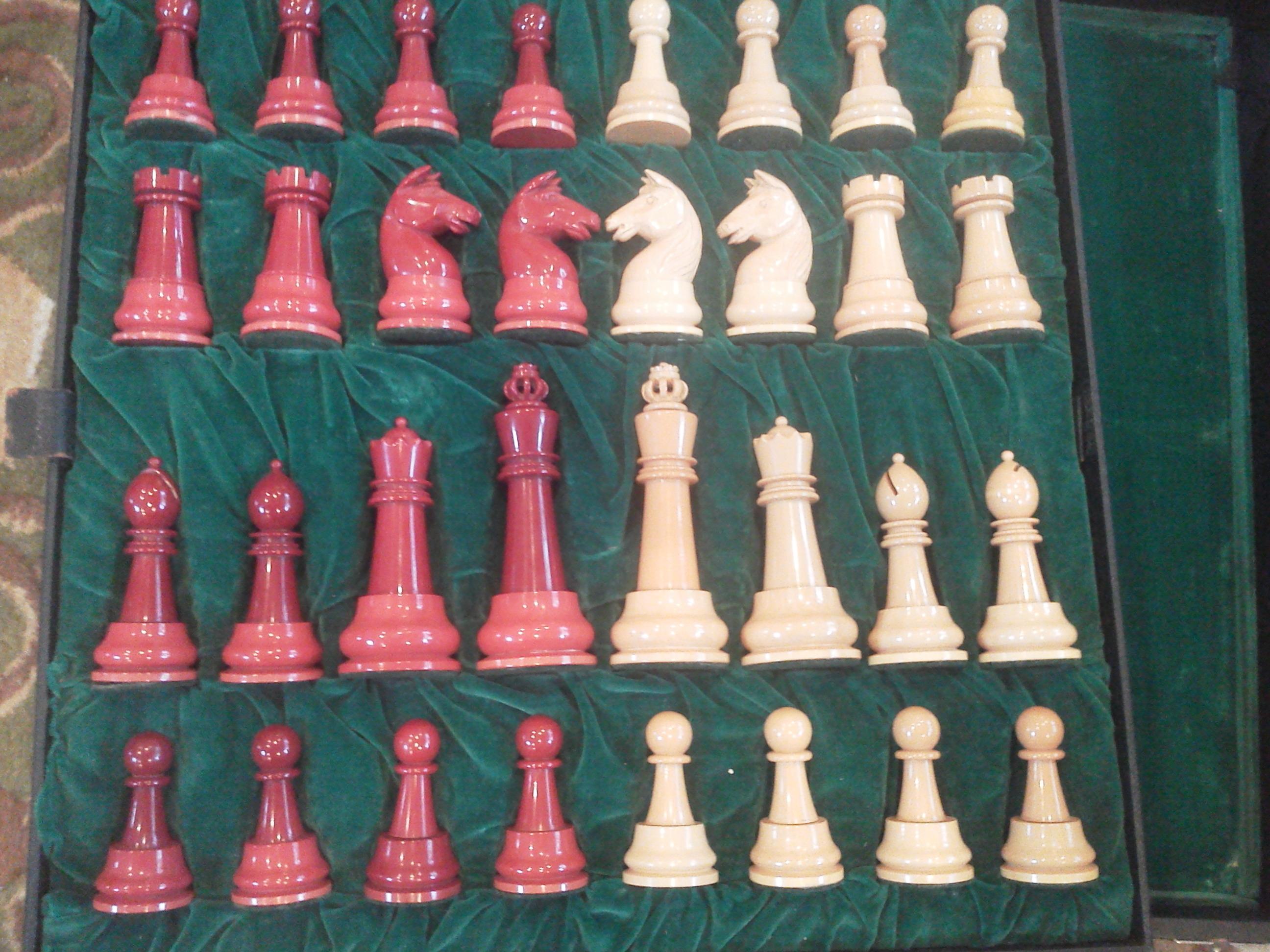 I purchased this chess set at a yard sale this past weekend. The woman I bought it from said her parents had purchased it in Germany many years ago. The pieces are big - the king is about 5 inches, I'd say - and they have a nice heft/substantial feel to them. Shiny deep red and yellowish colors. I believe they're bakelite. The set is complete with case and board, and is in excellent condition, with the exception of a chip on one of the castles. I would like to know more about the set (I can't find ine like it online) and a truer value than what I paid. Thanks!Thanksgivings