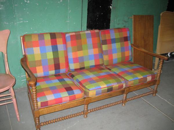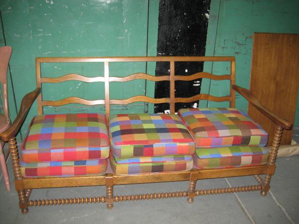 This solid walnut frame, hand spooled (probably) sofa is full size. Sturdy and comfortable casual cushions are available as you see in the photos.