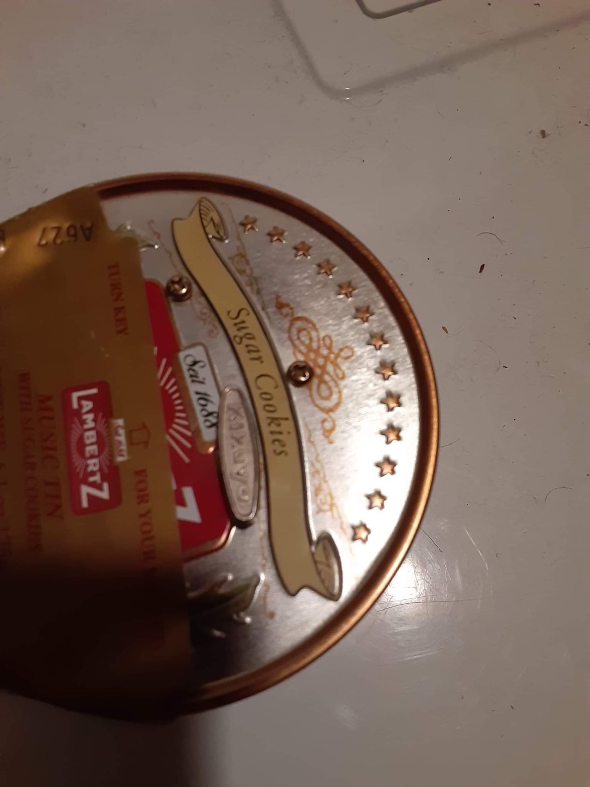 Sugar cookie tin with a music box lid. Unopened with cookies still inside. A barely visible 1in - 1.5in tarnish spot on lid. No dents. Music lid does work! Lid plays 3 songs