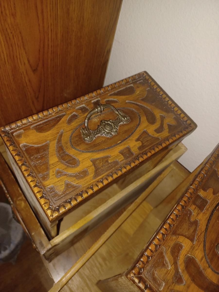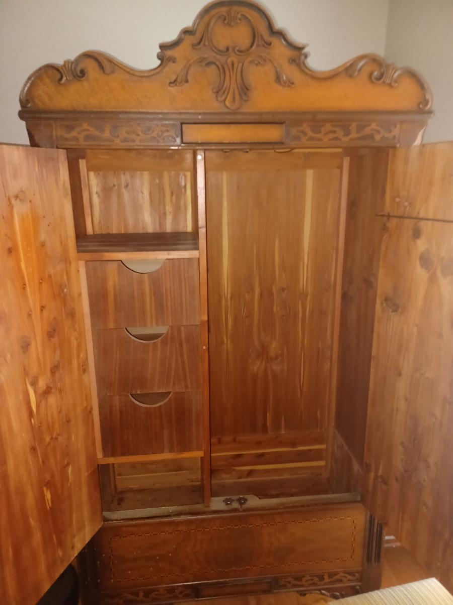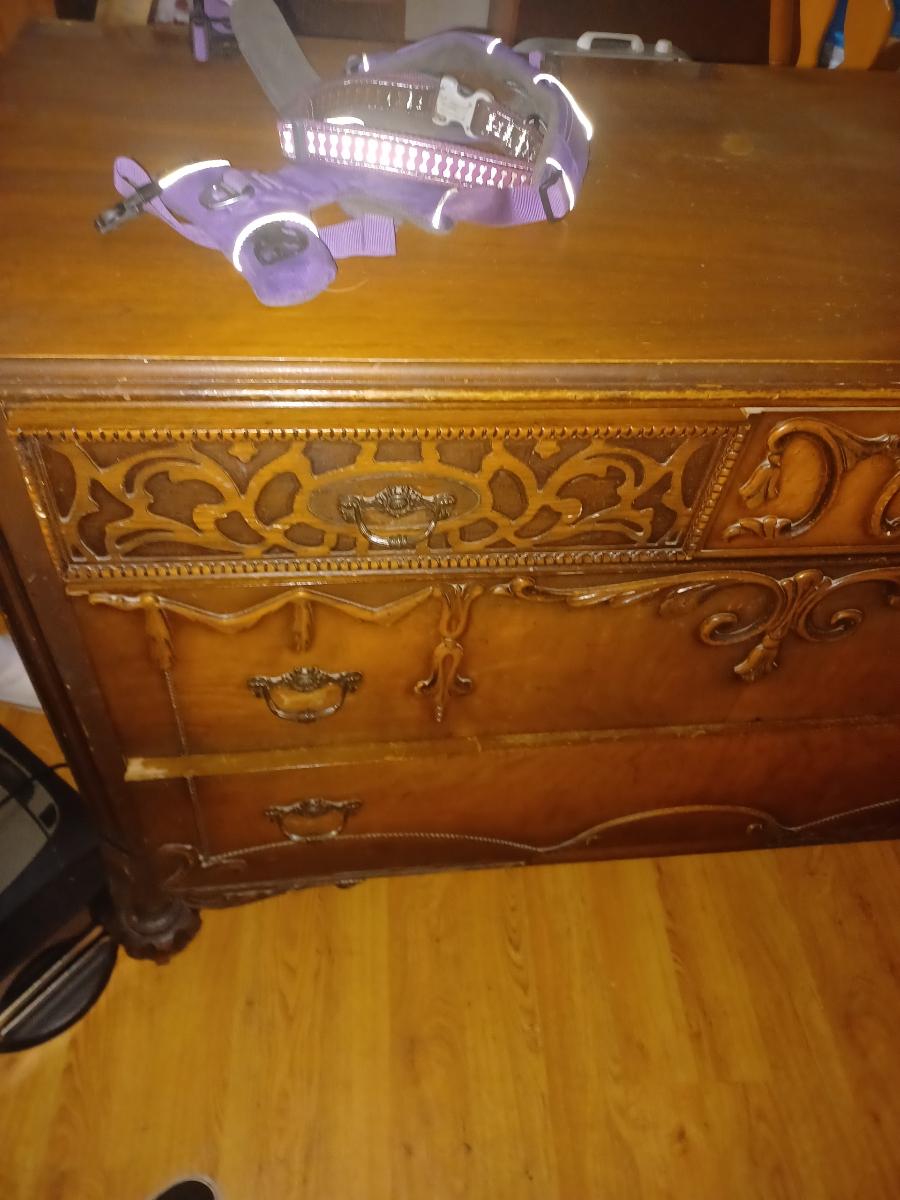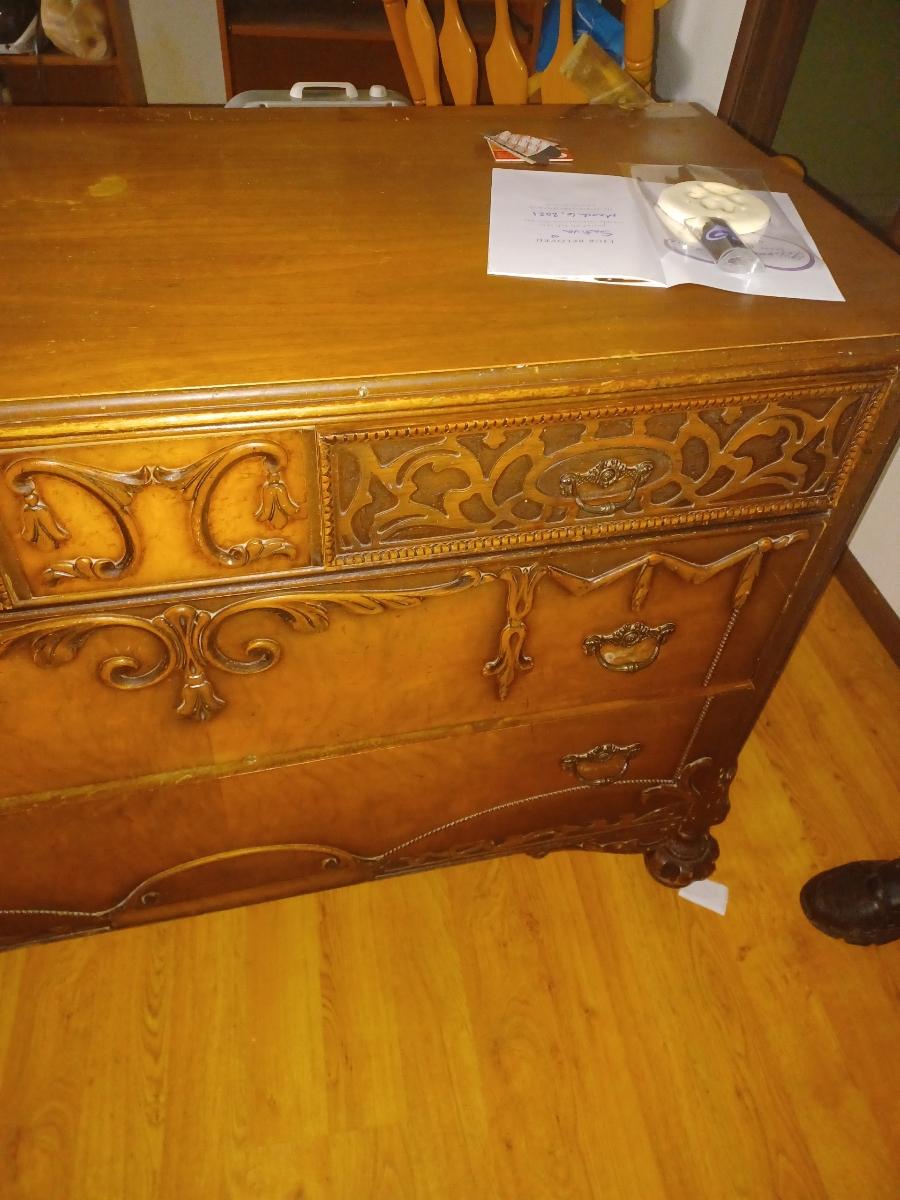 Hi there! My father inherited my aunt's bedroom set when she passed. We are hoping to get some help identifying the furniture and a very rough estimated value as we are trying to determine if we should donate or try to sell it. Unfortunately we just don't have room to keep this in combining households. My grandfather bought this set as a wedding present for my grandmother in 1936, they were living in St. Louis MO at the time. We should have taken a better photo before we had to move the furniture so I am hoping this may be enough information as a neighbor had to help with these photos. There are no photos of the bed which is all original except for the mattress support slats. The lights on the dressing table have been rewired for safety reasons. I am unsure of the wood used, the furniture is surprisingly light but in incredibly good shape. The inside of the wardrobe does have a cedar smell to it. The bench is the only piece that is showing quite a bit of wear. Everything except for the bed is on wheels. There is a mirror that also attaches to the dresser that they didn't get a photo of. Any information is much appreciated. Thank you so much for your help! All Pictures: https://imgur.com/a/lr0uxm8