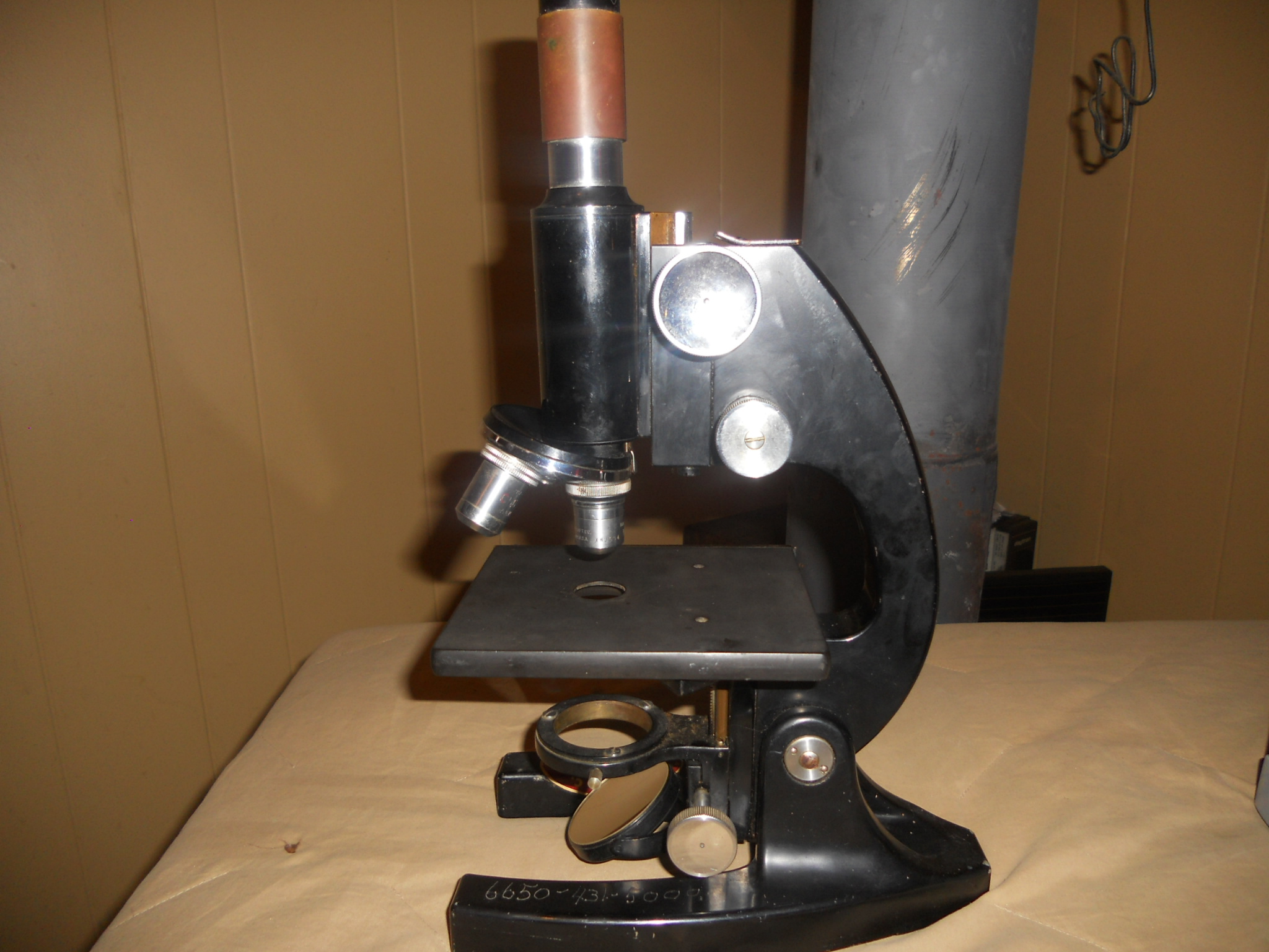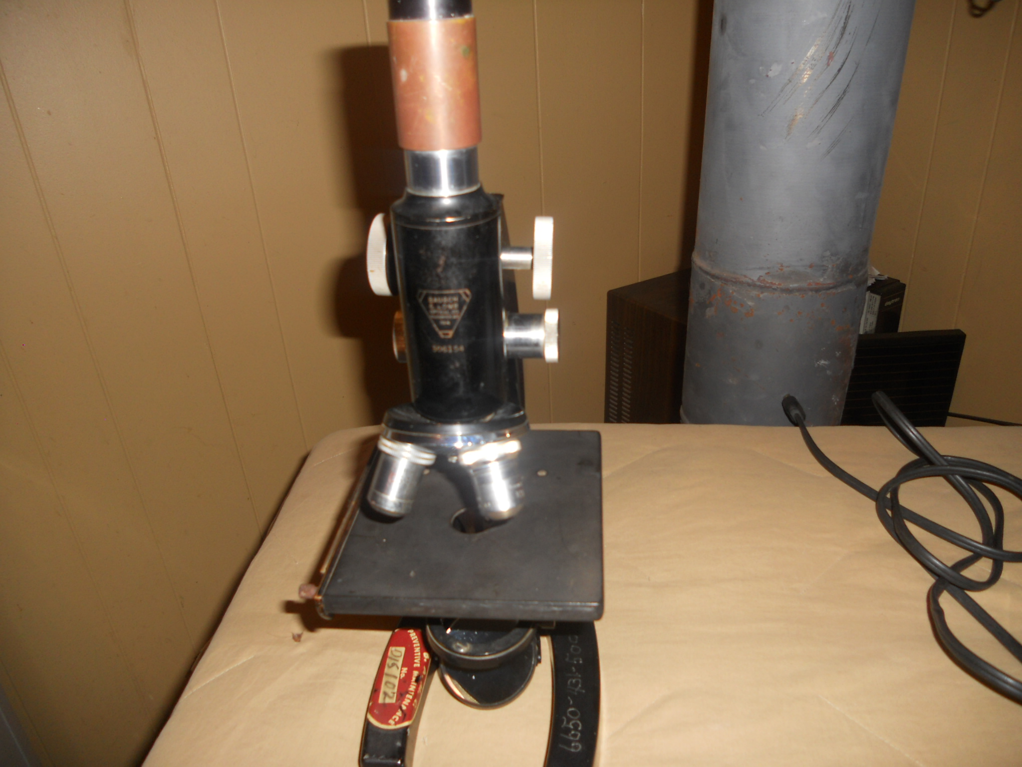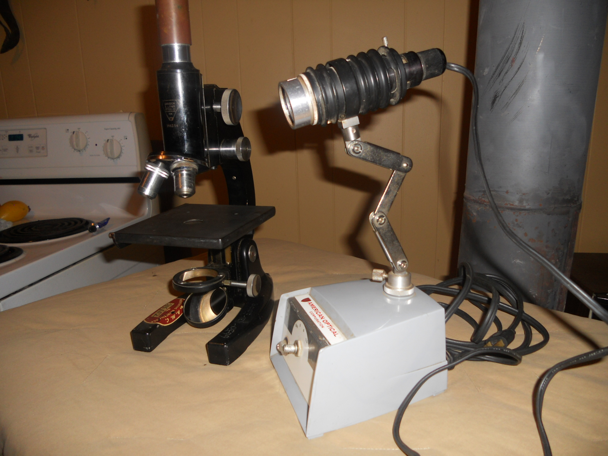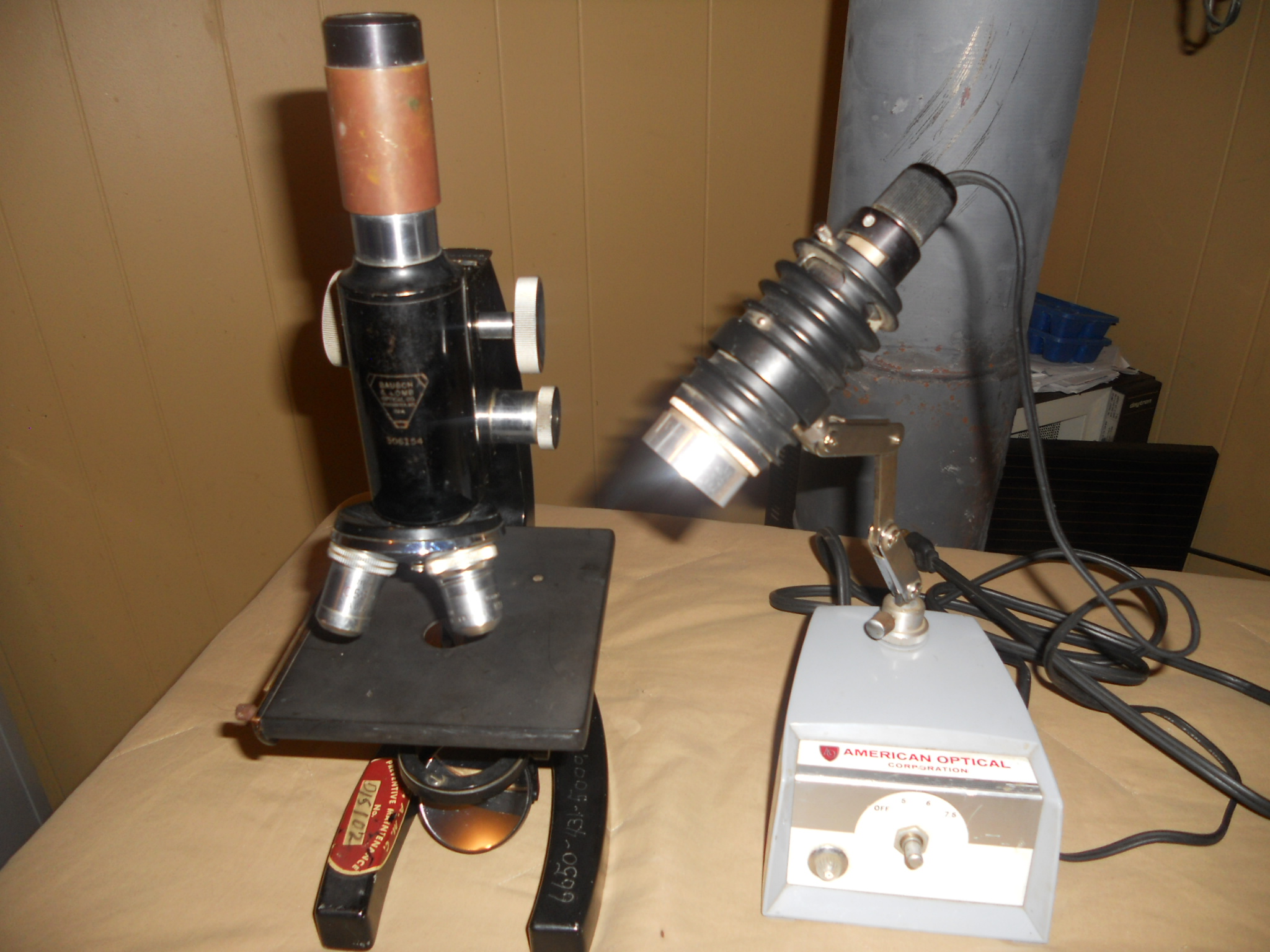American Optical light source would be in mint condition except the knob adjusting the lighting is missing. All else excellent condition. Microscope is very heavy brass, is missing one lens but other wise in good condition.