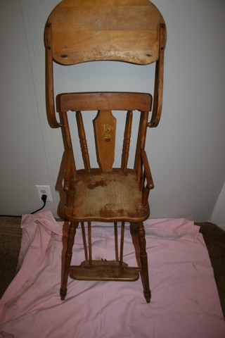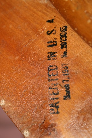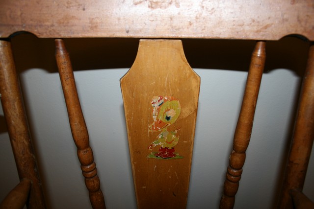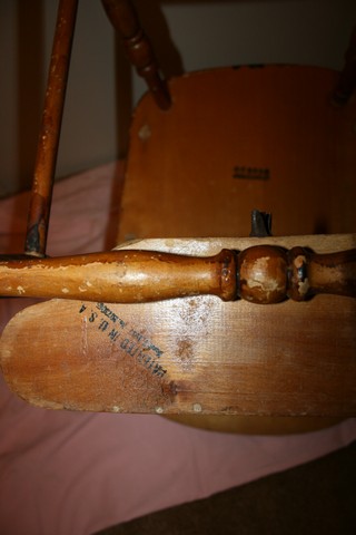 Patented in March 07,1937 with #2073065 stamped under foot rest. Another #-maybe Serial # 666606 is stamped under seat. Chair measures 37" tall from floor. Has 12" adjustable foot rest. Arms are 6" tall, seat is 11"x 11".Table swings over to the back. Table is 17" wide x 8.5" deep. Center chair rib is a painting of a Duckling with a R,W,& Blue Hat. Has a Blue Umbrella with a red handle under it's right wing. It's also wearing red Goulashes