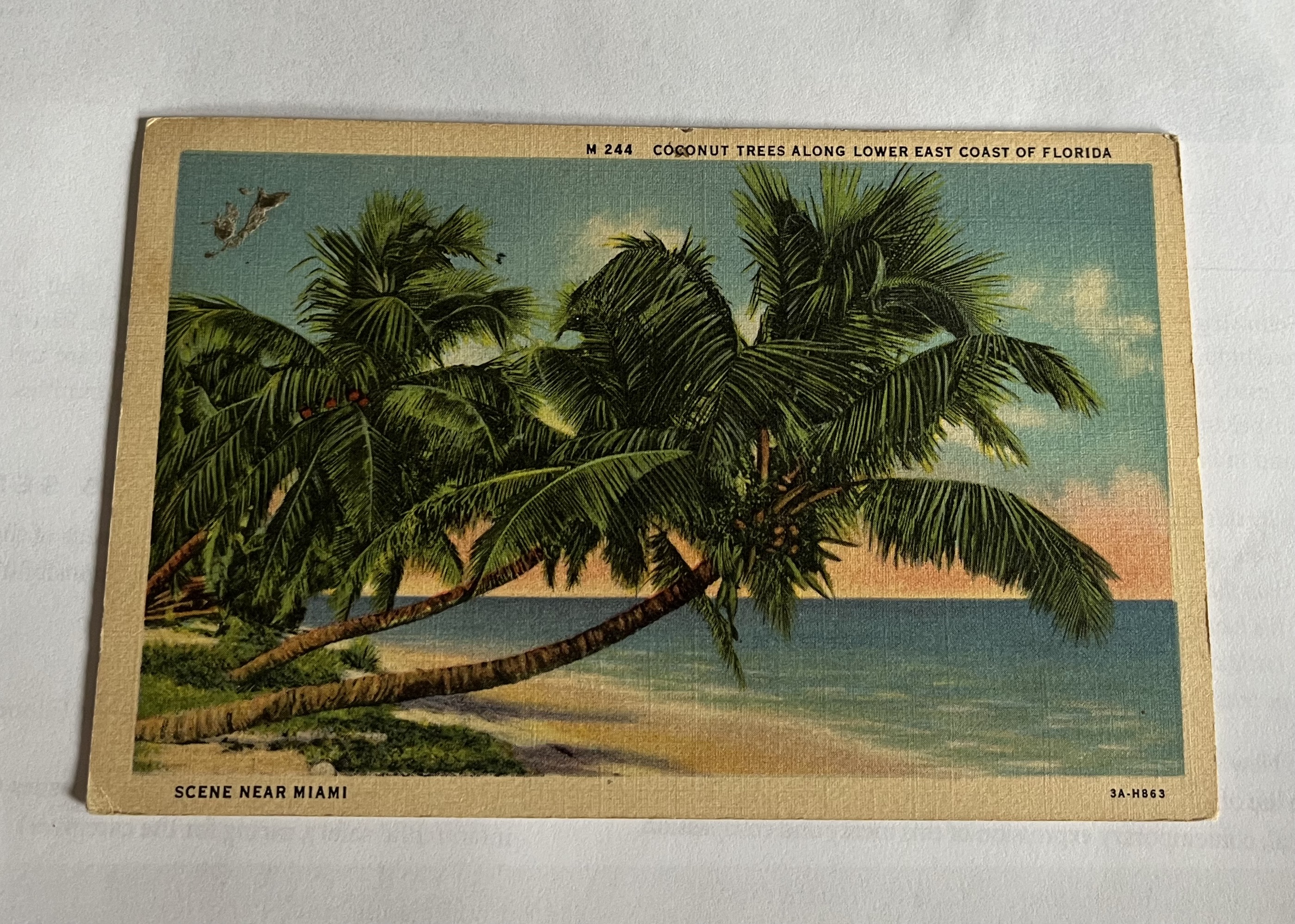 A friend in Miami, Florida sent this postcard to my Grandmother Vada in Macksville, Kansas in1937. Pictured is a lithograph "Scene Near Miami" "M 244 Coconut Trees Along Lower East Coast of Florida". 3A-H863