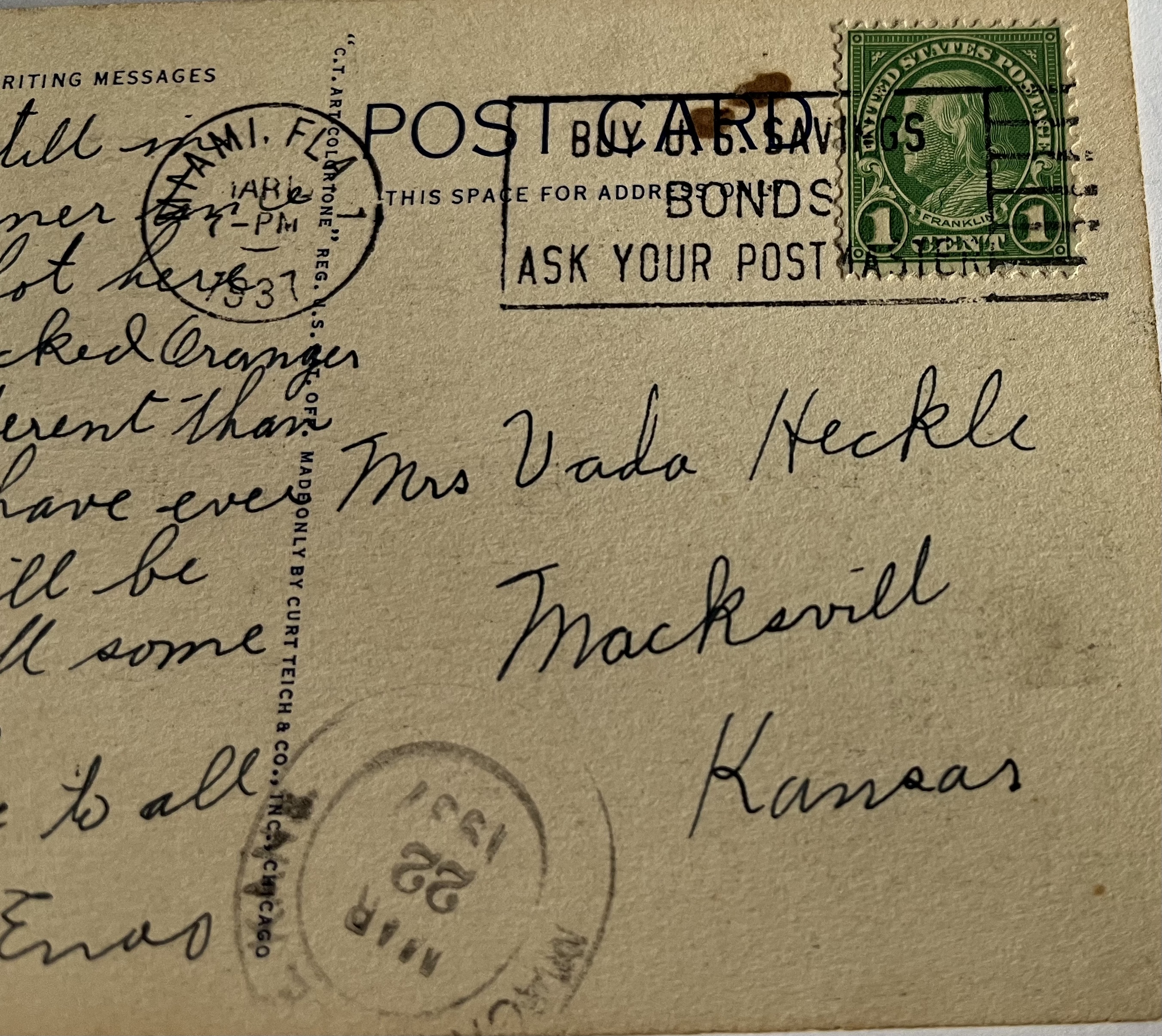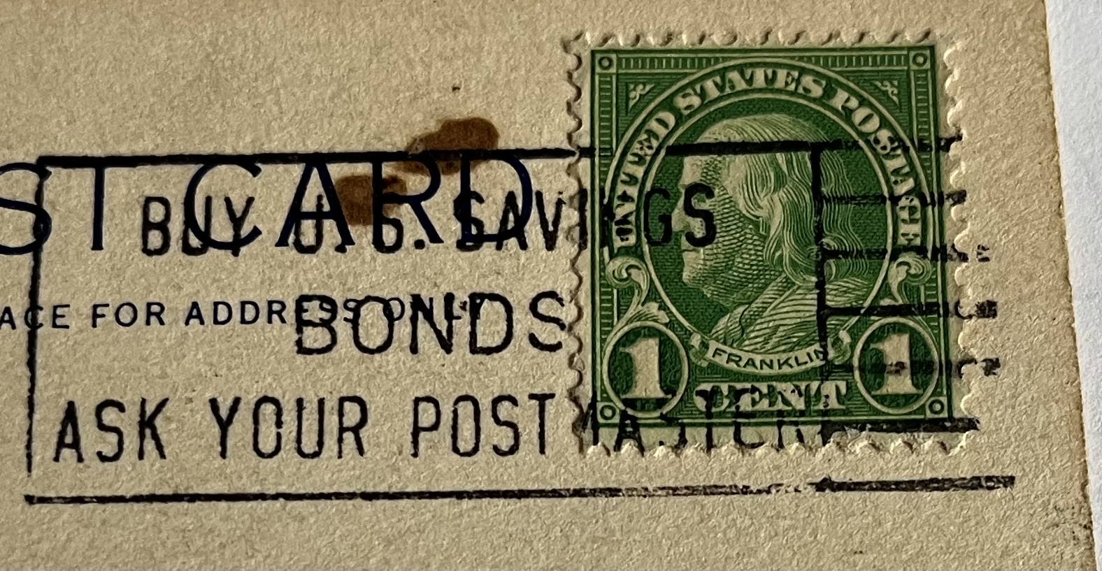 It is postmarked 1937 with a vibrant green 1 CENT 1 Benjamin Franklin stamp. It also contains an ad from the post office "BUY SAVINGS BONDS ASK YOUR POST MASTER