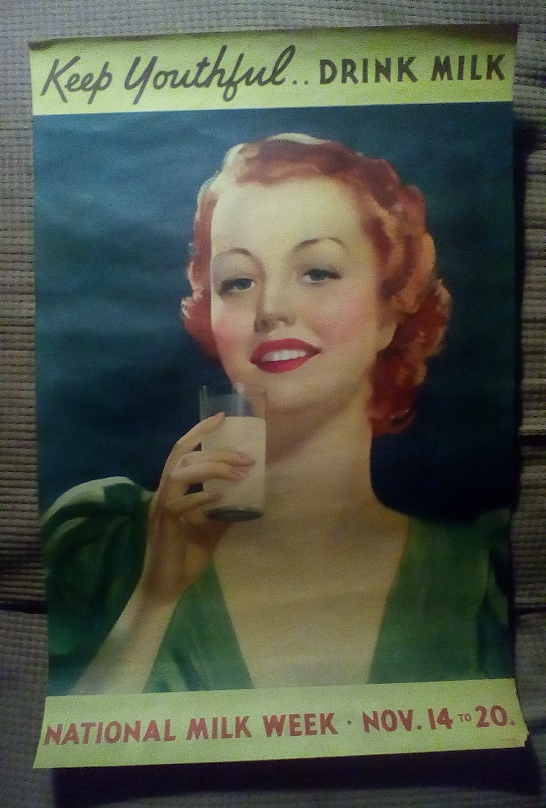 This is an original advertising poster from the first ever National Milk Week November 14-20, 1937, which became National Milk Month the following year. The only information I can find are newspaper articles about the campaign, but nothing in the way of any posters or pictures. The articles state that "moving picture" stars would be featured in the ads and list a few names, but I can't find anyone who looks like the lady in the poster. We found this in our barn at our previous home. It is in really great condition with just a little wear in the bottom corner. It does say "Litho in USA" in bottom corner. I'd love to know if anyone knows anything about it or the value. Thanks so much!