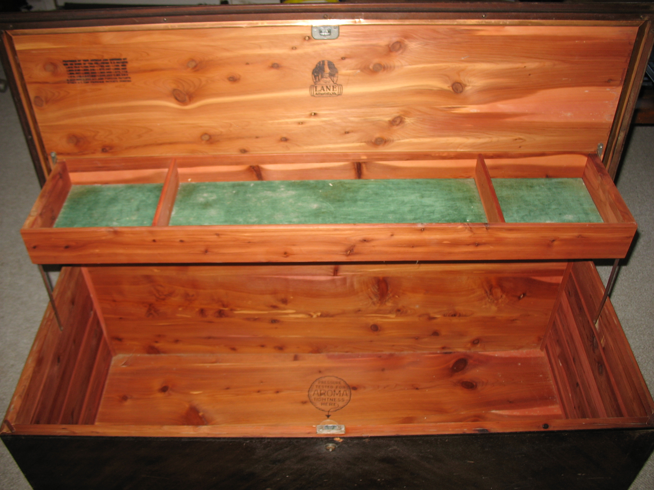 Serial & Model number branded on the bottom of Chest - Lane Altavista logo branded on the top inside of chest..
