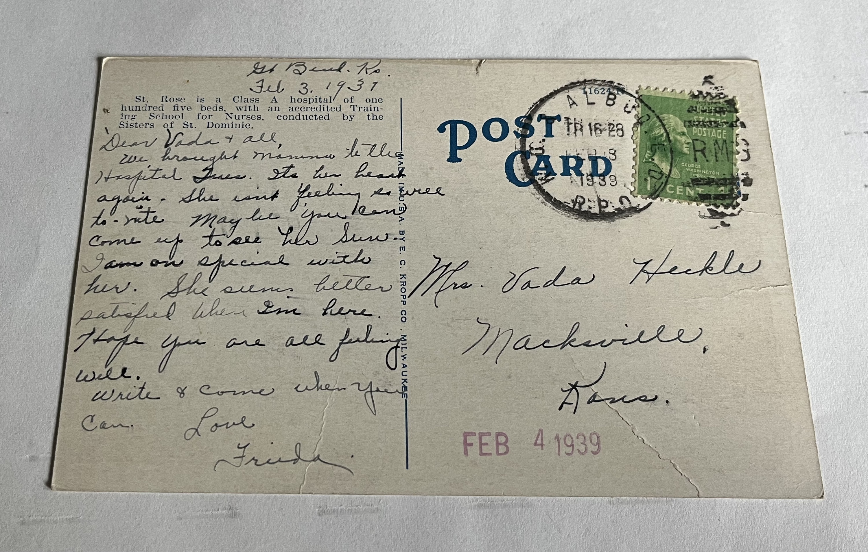 Physical Description: This vintage lithograph postcard features a vibrant depiction of St. Rose Hospital in Great Bend, Kansas. The postcard is postmarked February 4, 1939, and includes a 1 cent George Washington stamp, which adds historical significance. The postcard is made of paper and measures approximately 5.5 x 3.5 inches. The E. C. Kropp Co. of Milwaukee is identified as the maker, known for producing high-quality postcards during the early 20th century.