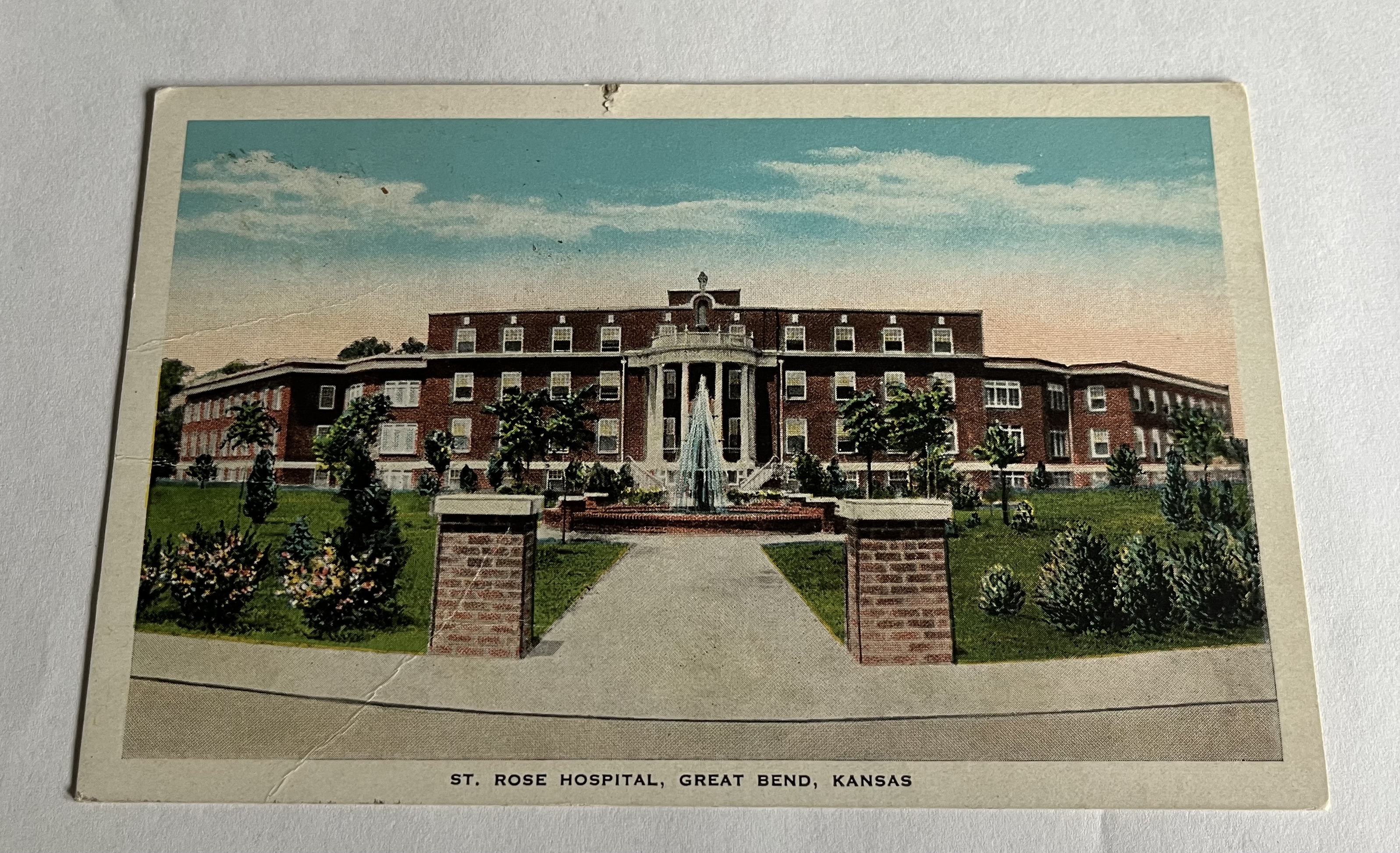 Sister-in-law Frieda Frink sent news a new baby to her sister-in-law Mrs. Vada Heckel with a lithograph of St. Rose Hospital in Great Bend, Kansas.