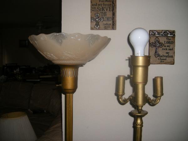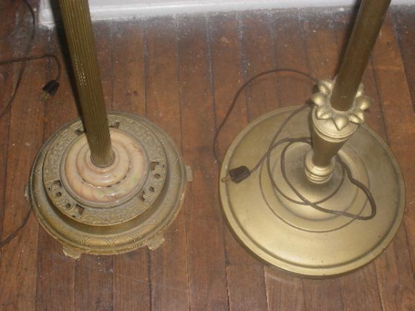 Both lamps work! One light lamp is all original with a beautiful glass ornate bowl covered leaf and flower impressions. 4 light lamp originally had a glass bowl in the largest light socket, covered by a lamp shade over all four lights. Does need some wiring fixed on it, but thats an easy fix.