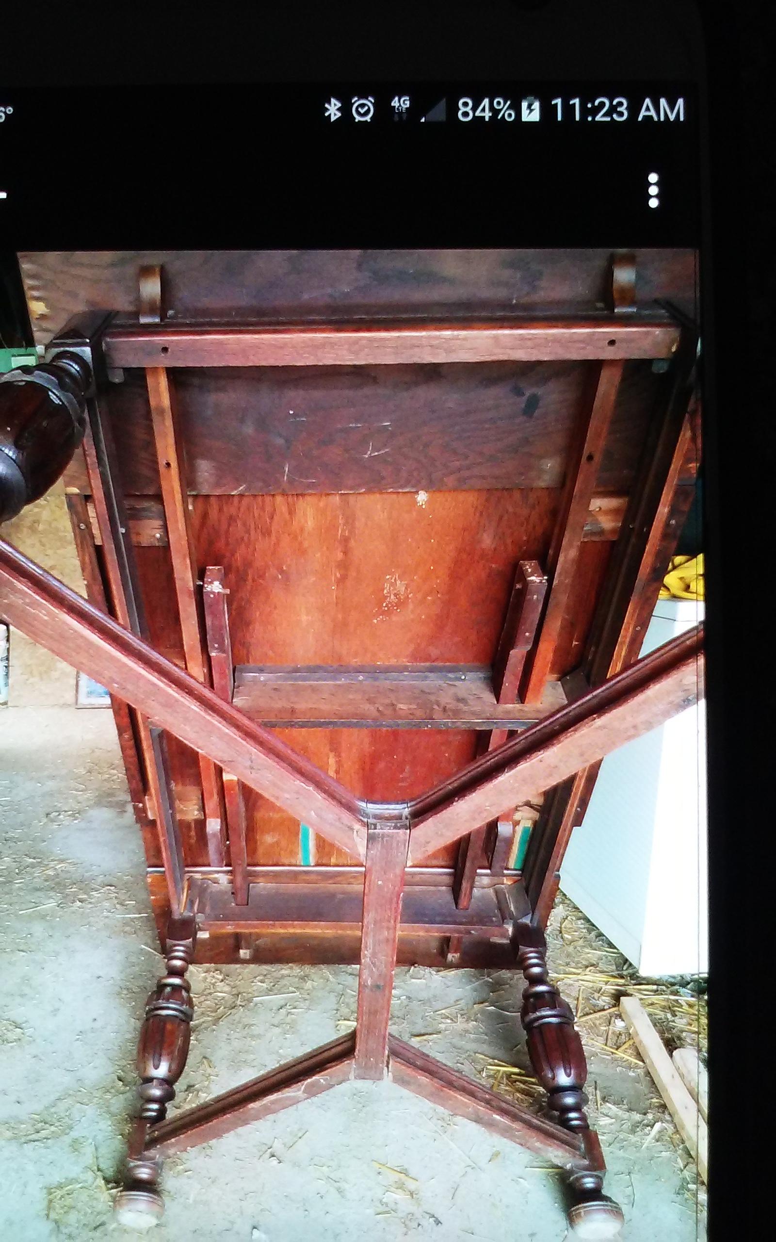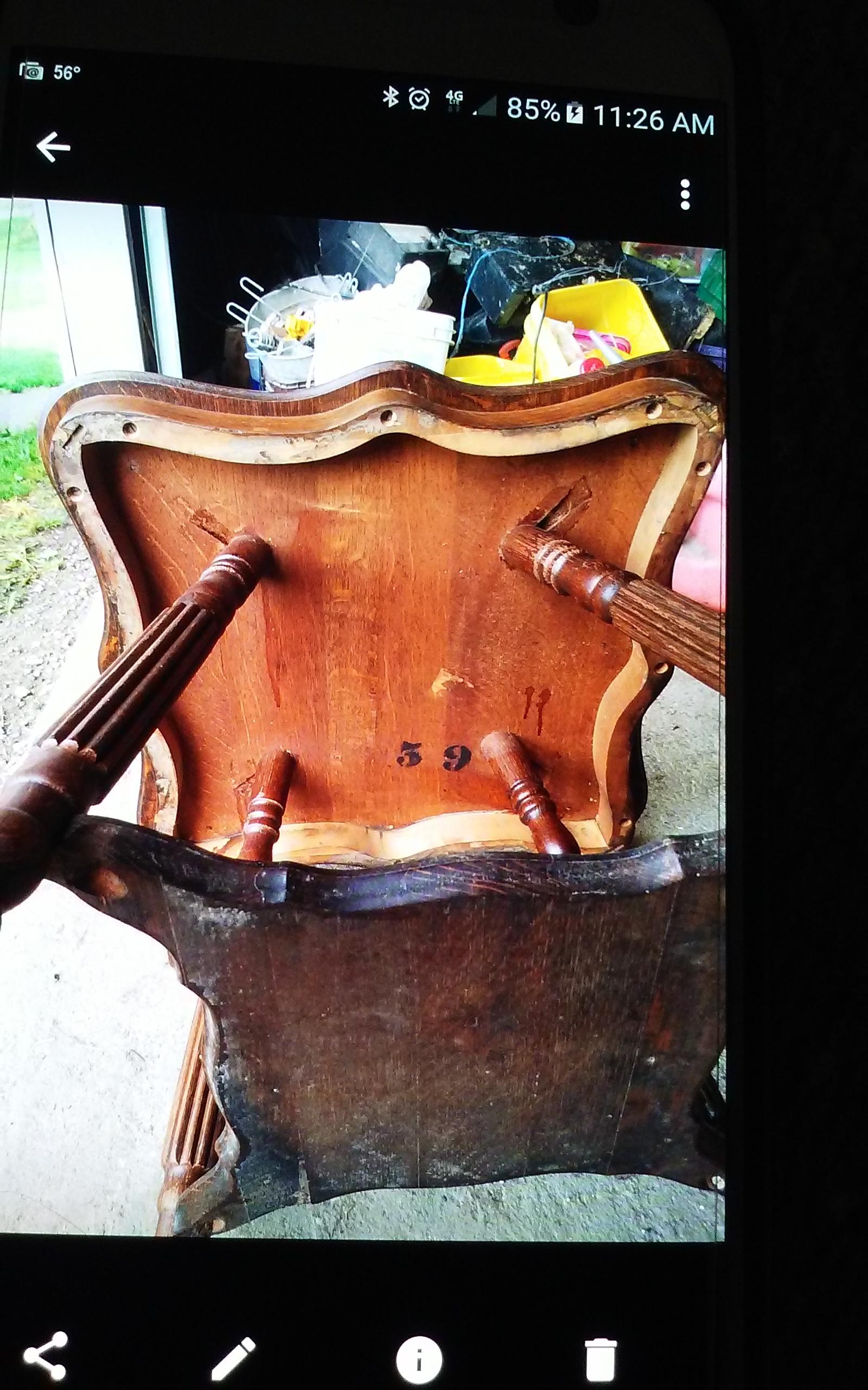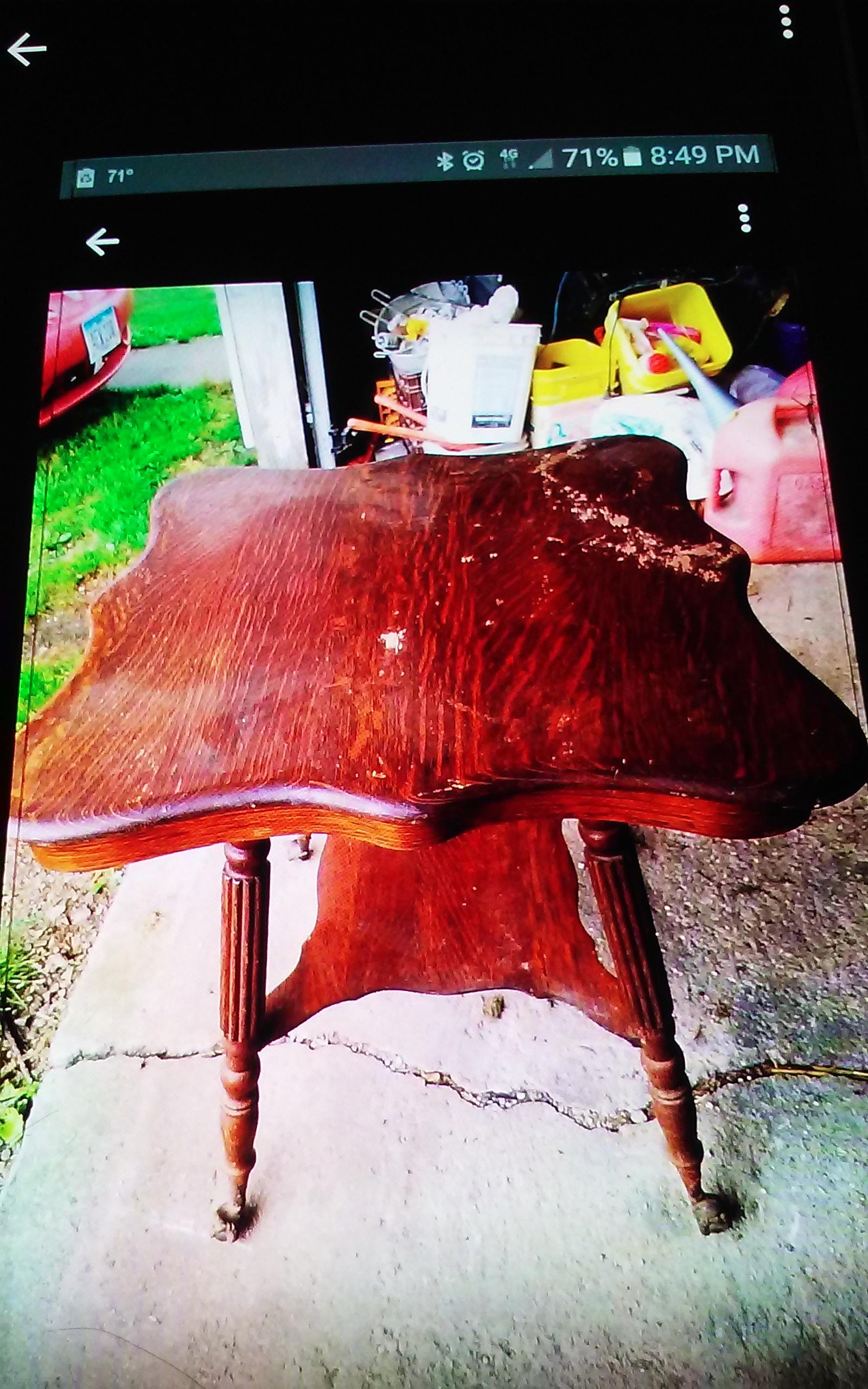 1910s side table and chairs. 3 chairs with cane seats. 2 of the cane seats need to be redone. Side table has mildew and stains on the top.