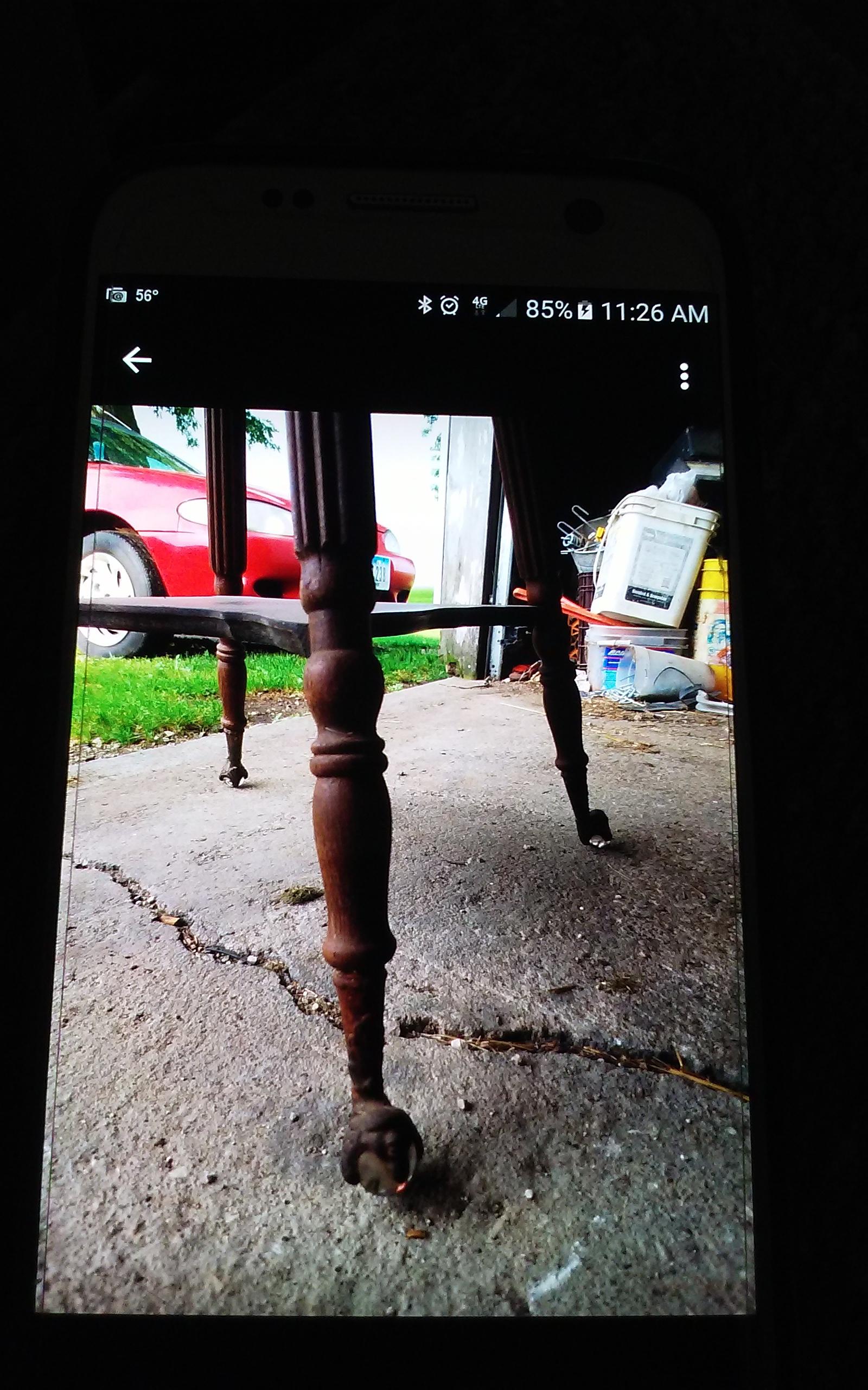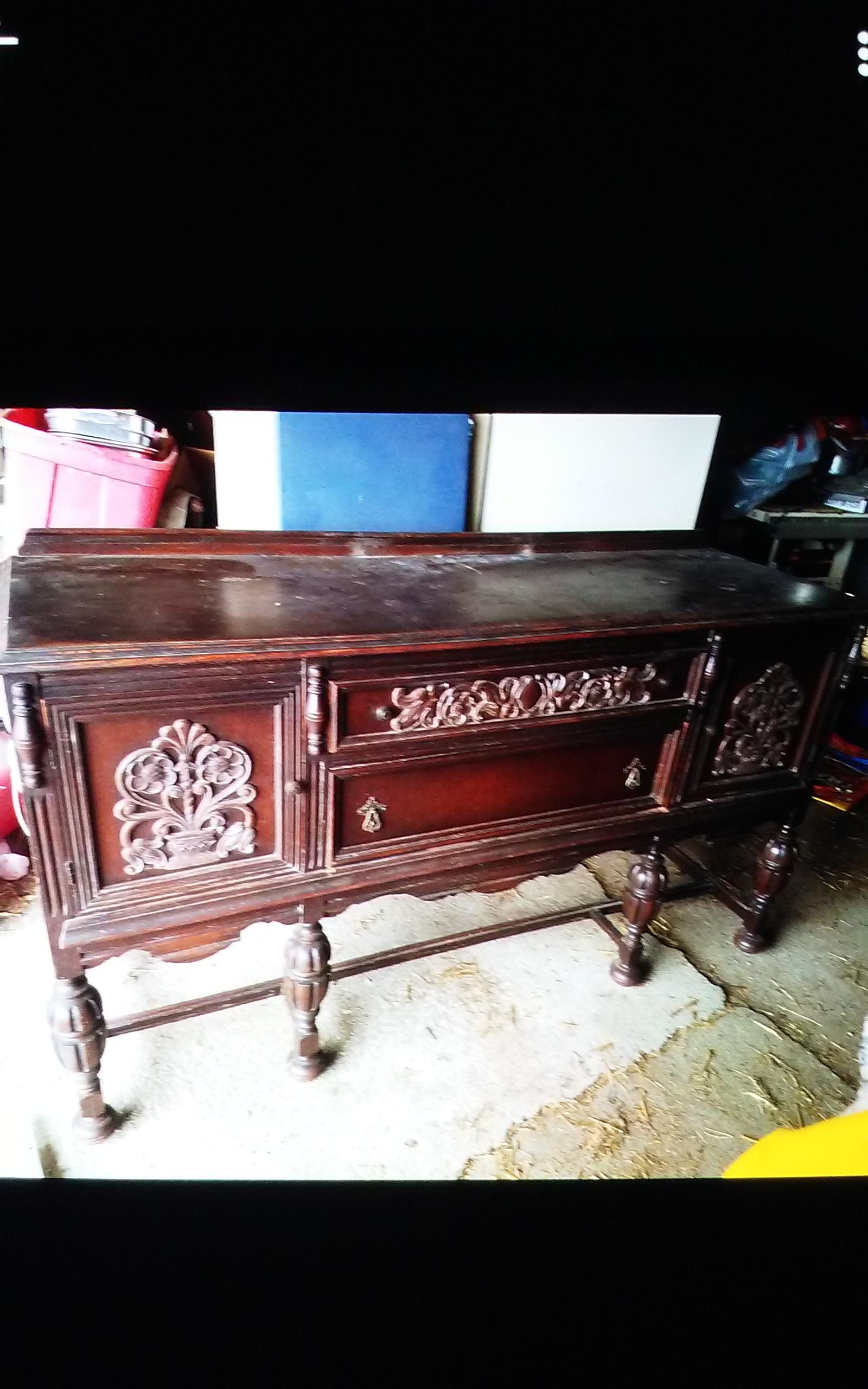 1940s dining room table and buffet. Both are structurally and mechanically sound. Surfaces have stains, rings and scratches.
