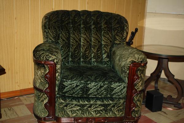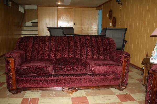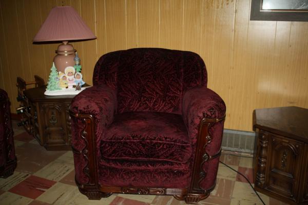 We are trying to determine the year and make of furniture we have in our possession in order to determine its value. The upholostery is in burgundy chenille/brocade(?) in a leaf pattern. Wood going up the front of the arms, across the bottom and 3 strips on each of the sides. The set sits very low to the ground. Steel coils.  Also have green chair that goes with set.  See pictures.