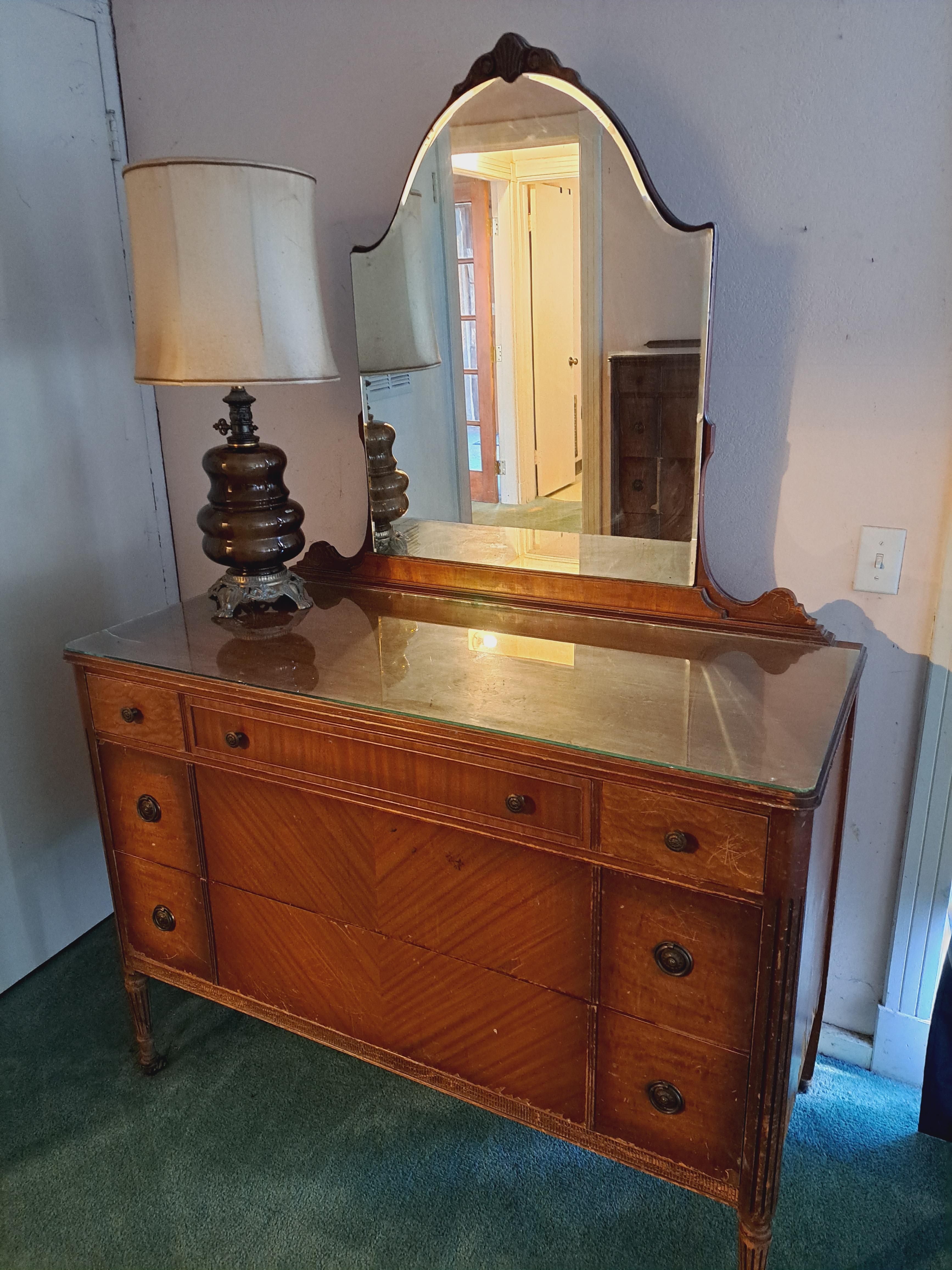 Dresser with mirror. Multiple woods and on wheels.