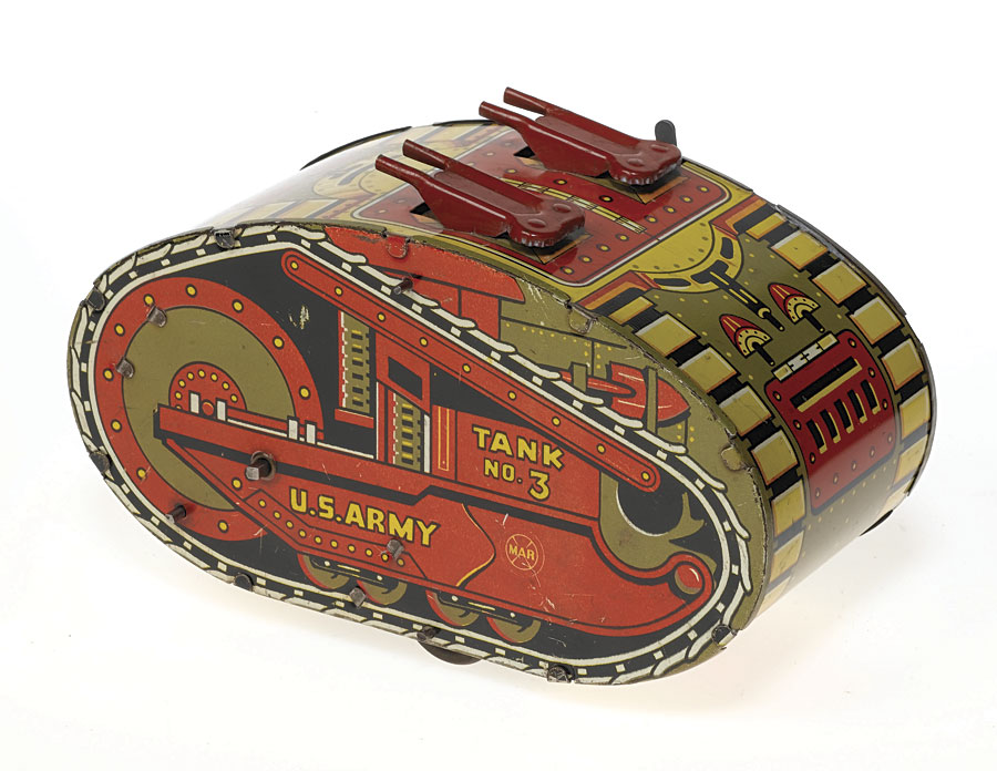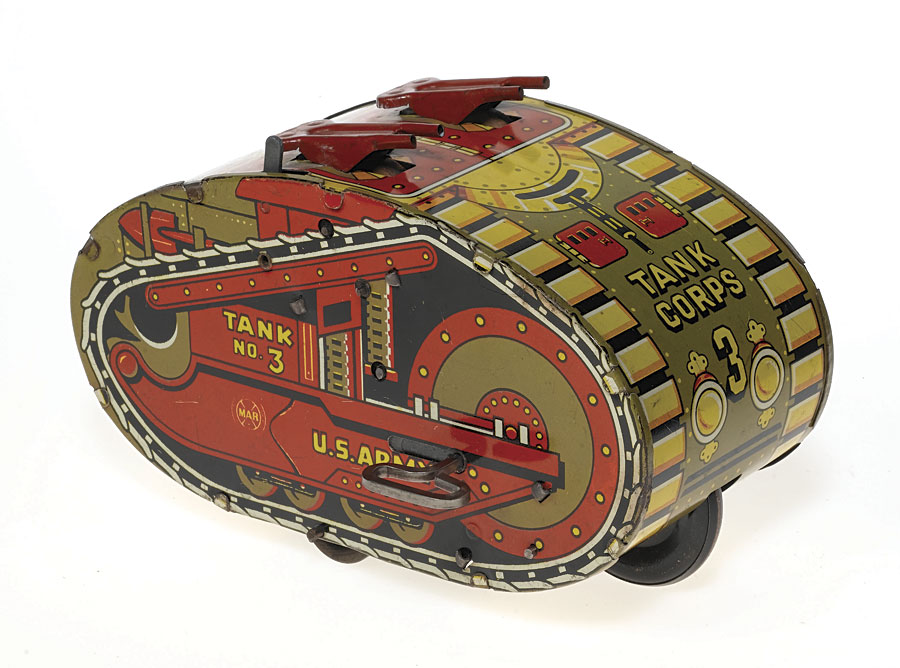 Measuring roughly 7-3/4"-long, this little juggernaut was designed to just roll on a straight course with its twin roof-mounted machine guns vibrating up and down with the motion while sparks fly from underneath their little barrels.