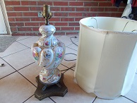 white Ceramic lamp with multi-color and gold floral motif mounted to brass? quad base