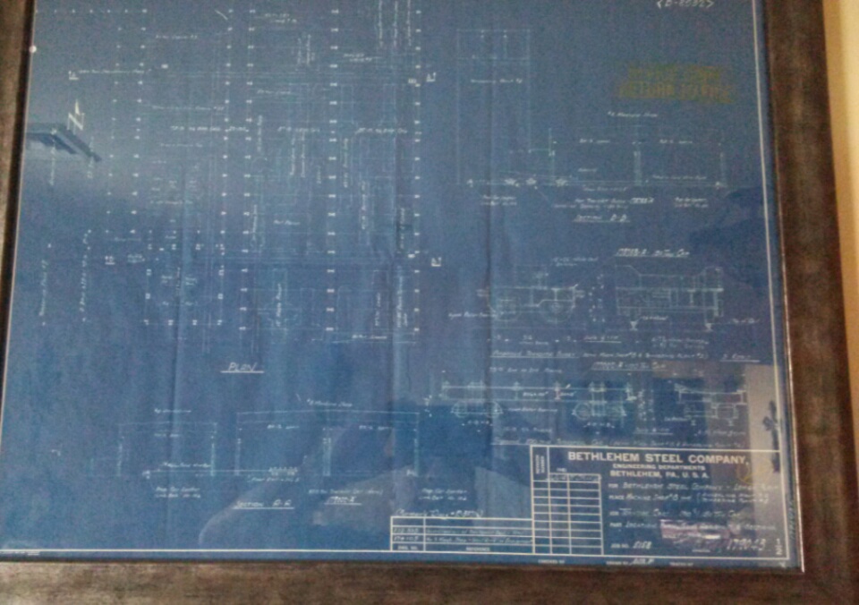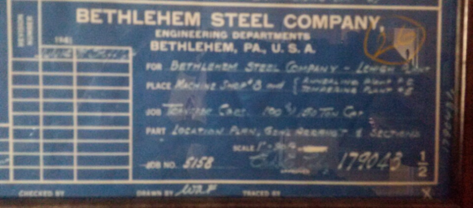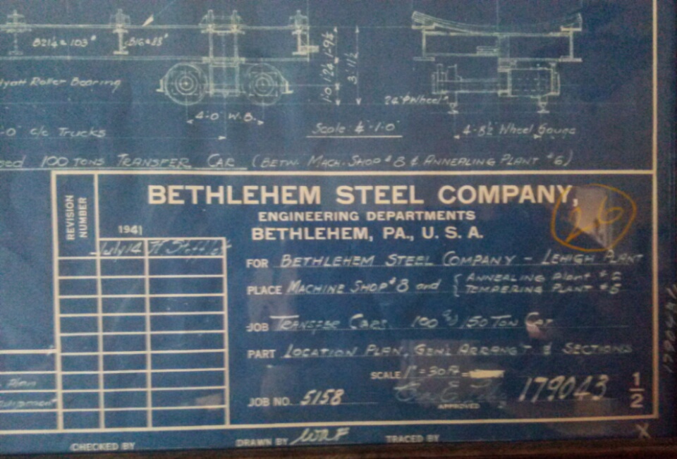 This is a Bethlehem PA Bethlehem Steel Blue Print. The date on it it July 14th 1941. It is marked Office Copy Return to Office. This sheet is for the transfer cars used on the Bethlehem Steel train sytem. It is in Excellent Condition all original. We framed it in a steel frame with Museum Quality Glass. This is the only Blueprint left of the train cars that we know of.