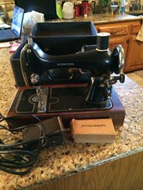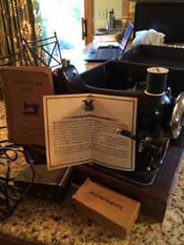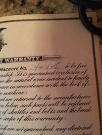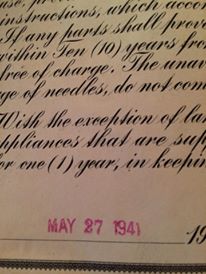 1941 International Reversew Electric Sewing Machine along with all the certified papers that are dated. This also includes a carrying/storage hard case, the powercord and feedfoot, along with a box of all hardware accessories. There is a "certificate of warranty" that has a hand entered (calligraphy) machine id# along with the warranty being dated stamped in bottom left corner. The date stamp is May 27, 1941. the "Instruction Book" is also included. This contains multiple pages of not only instructions but the prices for parts, along with the shipping costs.