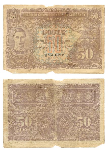 This banknote of Malaya 50 cent 1941 in good condition has a price 65 euro's