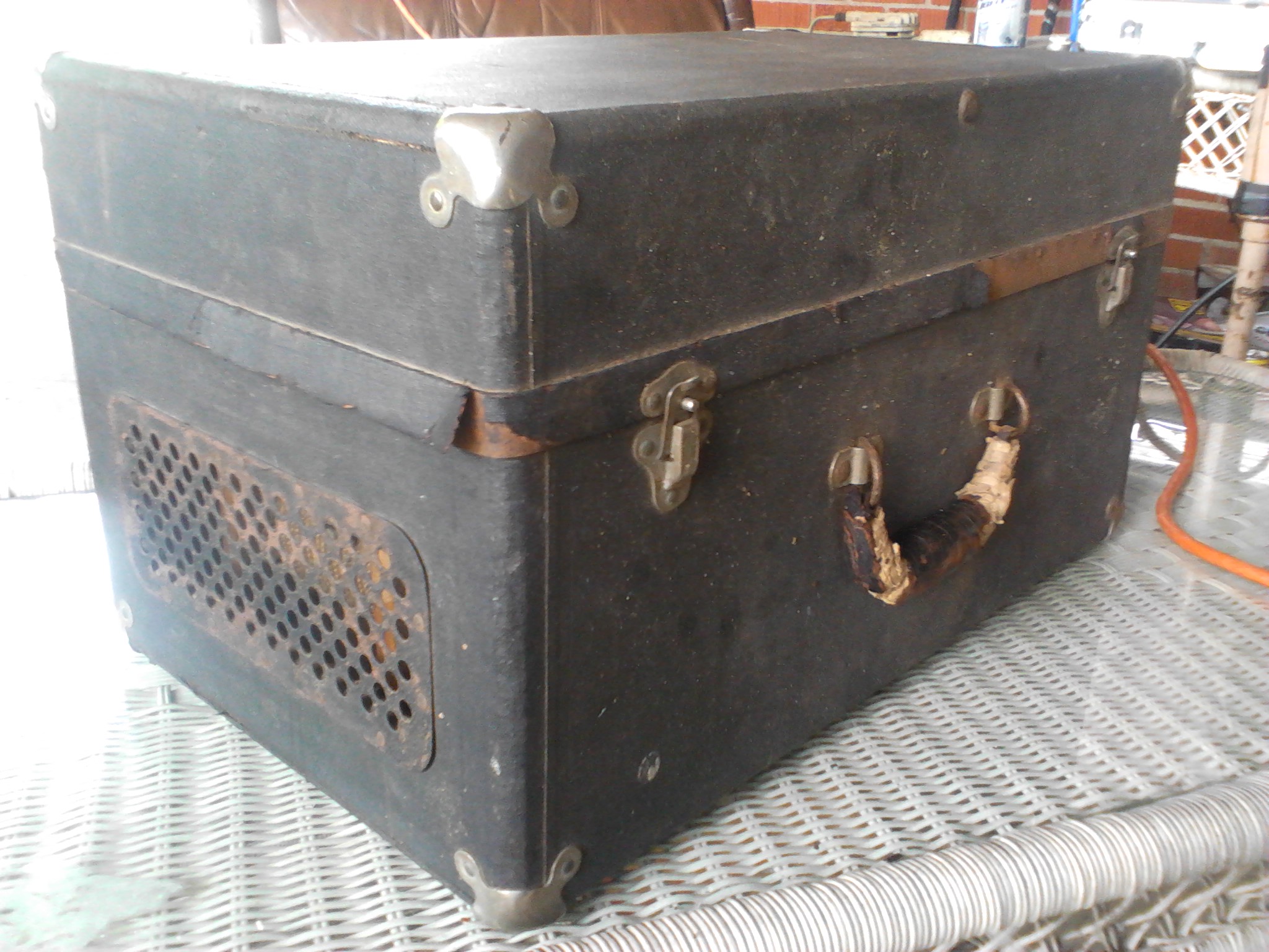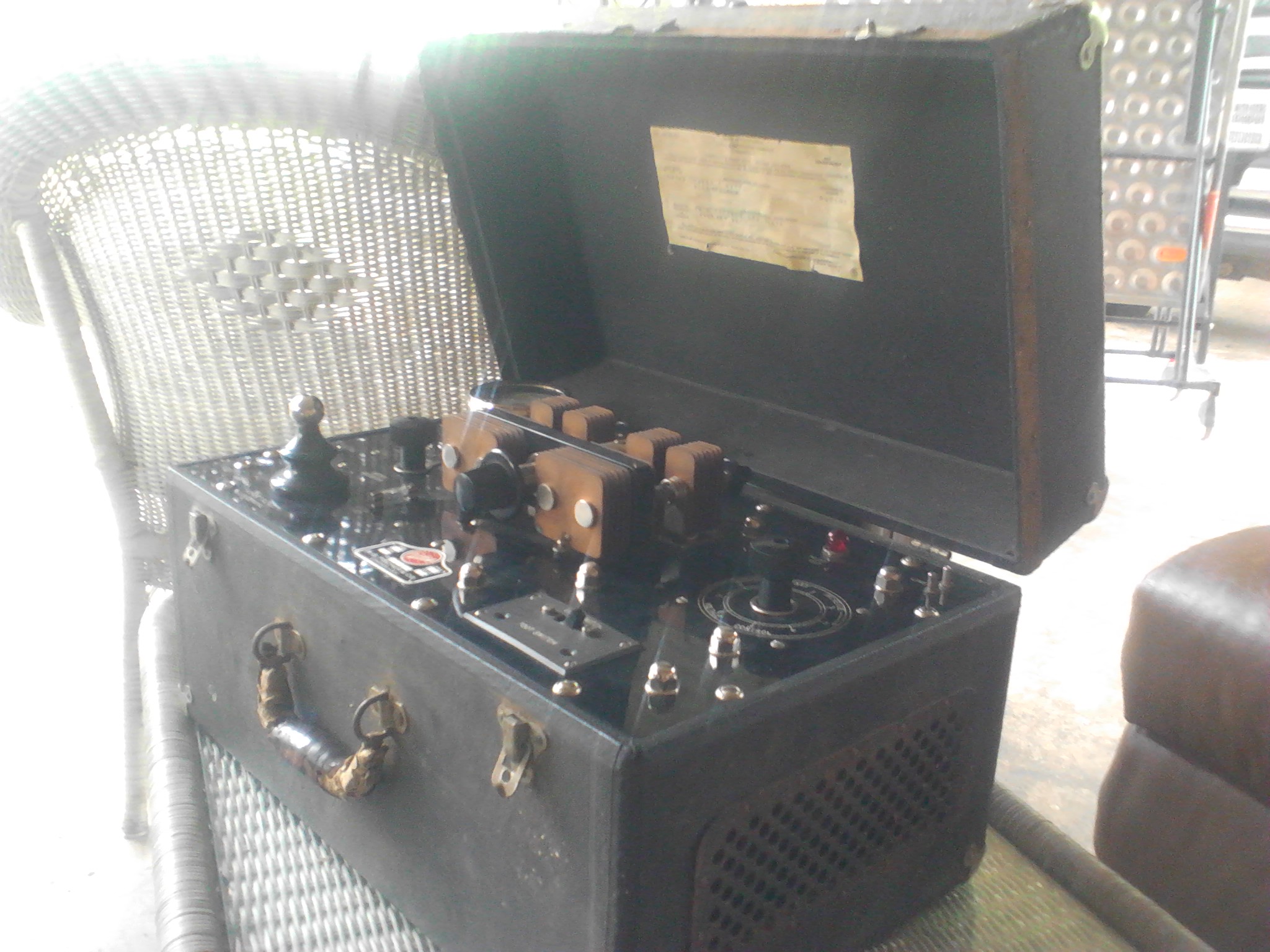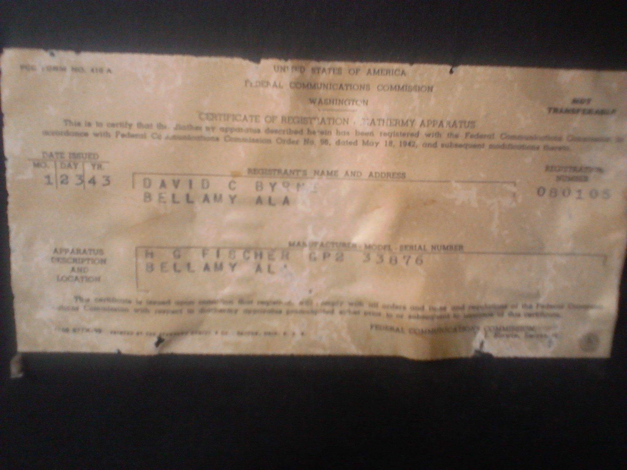 The HG Fischer 4 spark gap diathermy apparatus is a medical device that delivers electro shock treatment at variable frequencies to a patient. This unit is fully functionable. Its case's exterior has signs of aging but can be restored as the flaws are minor. The control panel is in mint condition. You can see your own reflection off of the surface. All switches, knobs, contacts, and meter function proper and crisp. All mounting scews are stainless and flawless. On the underside of the cases lid is FCC form id 410a Certificate issued by the United States Federal Communications Commision in Jan 1943.