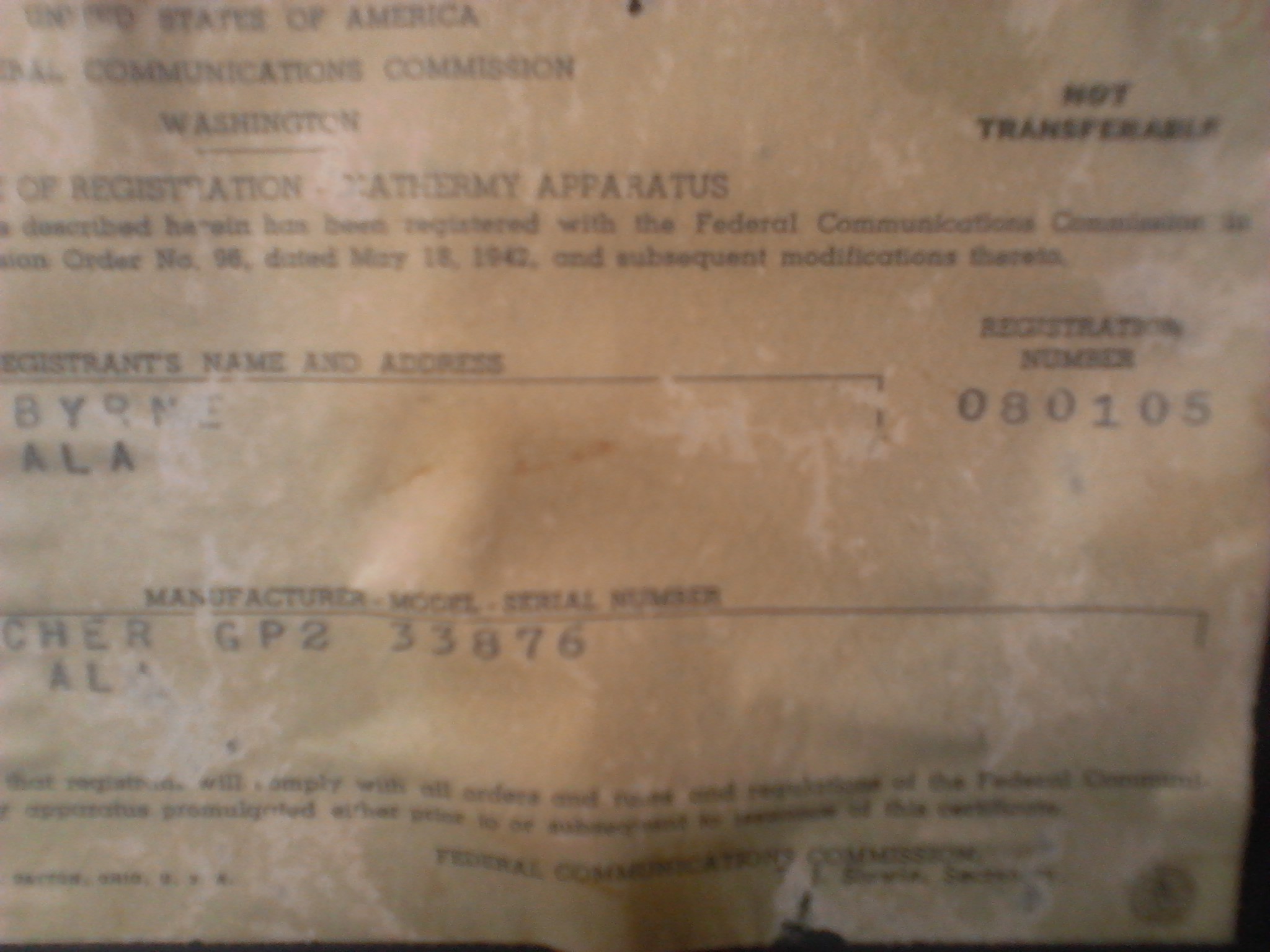 Re: 1943 GP-2 HG Fischer Diathermy Apparatus 4 spark gap