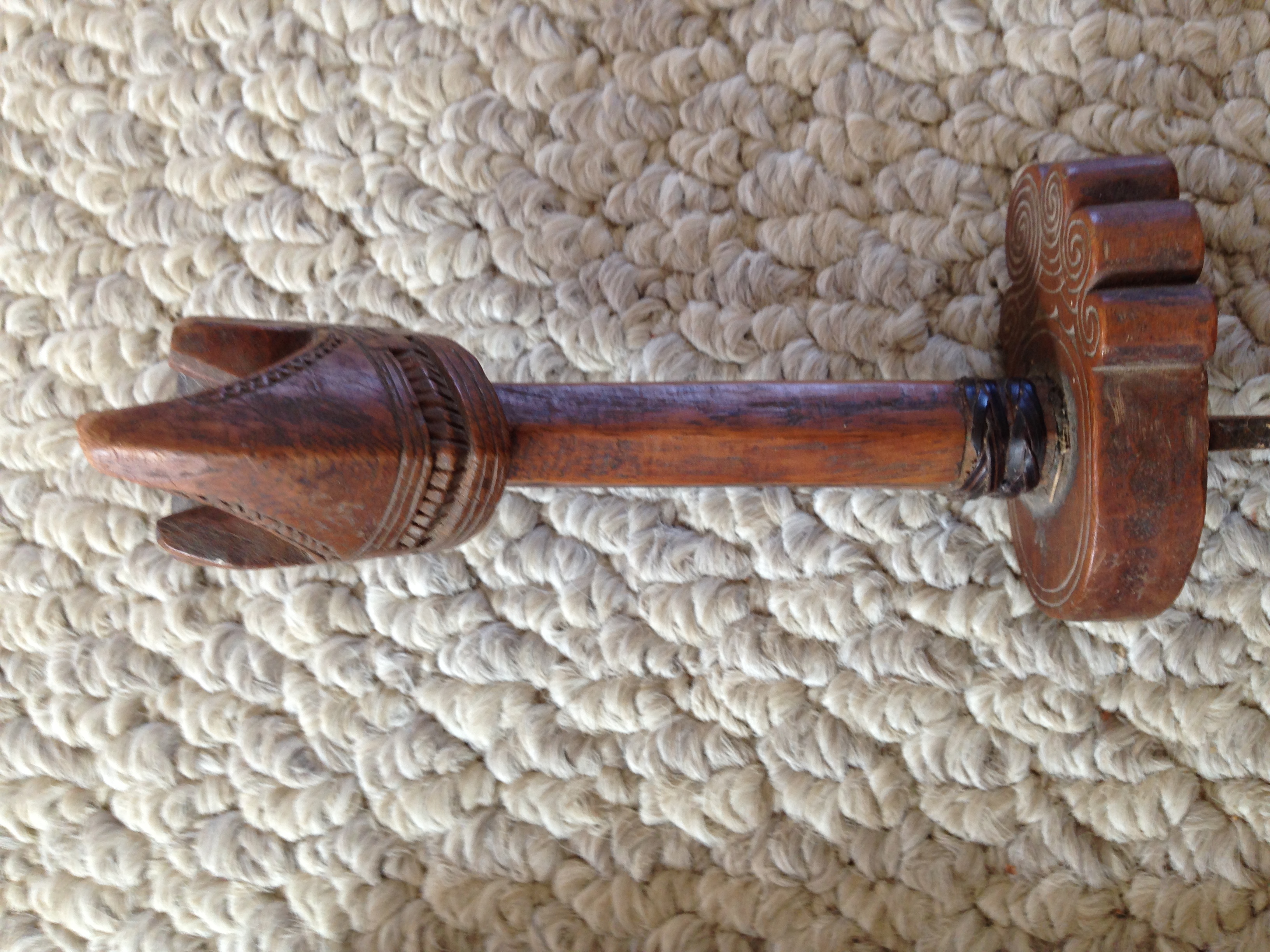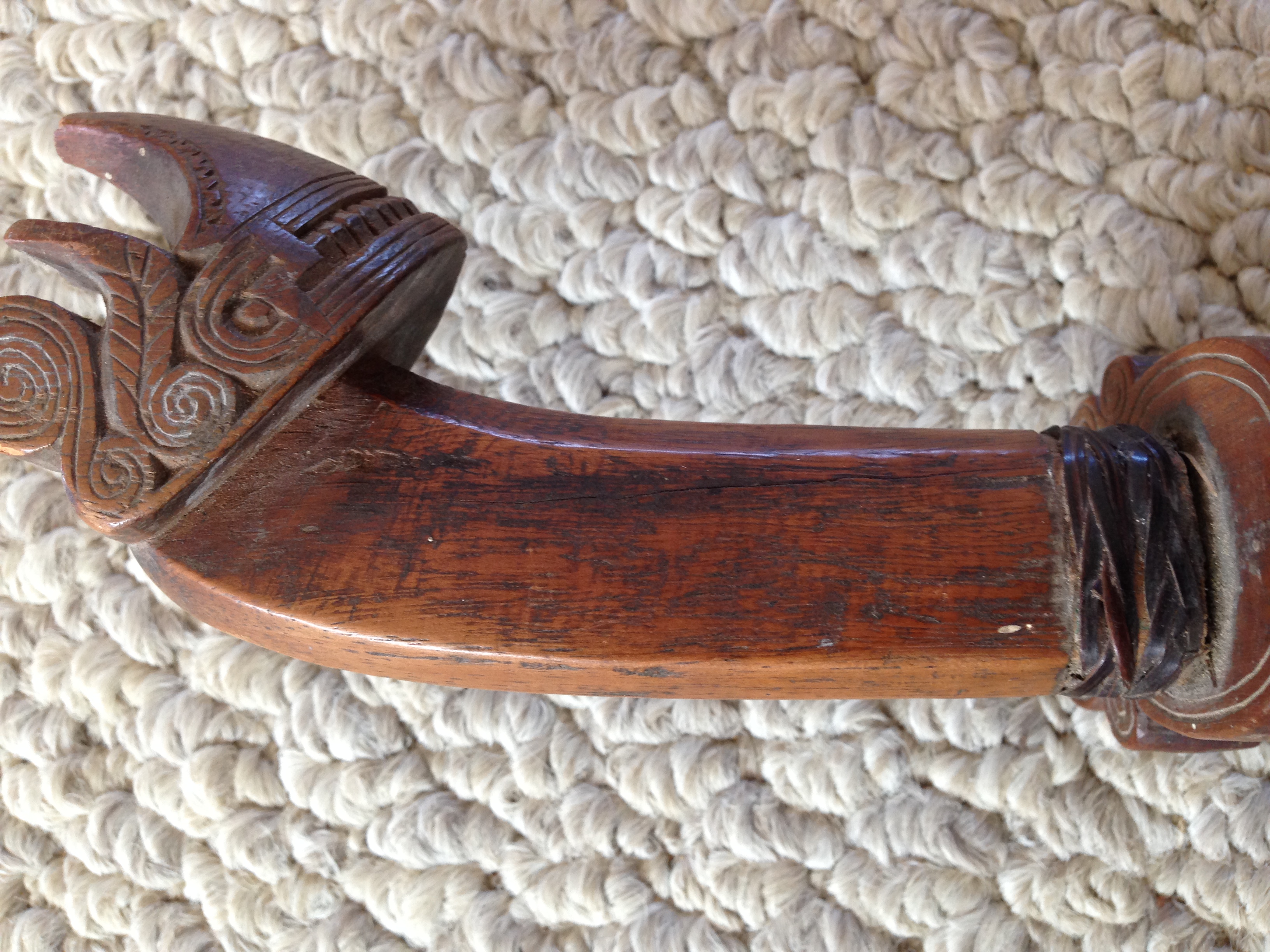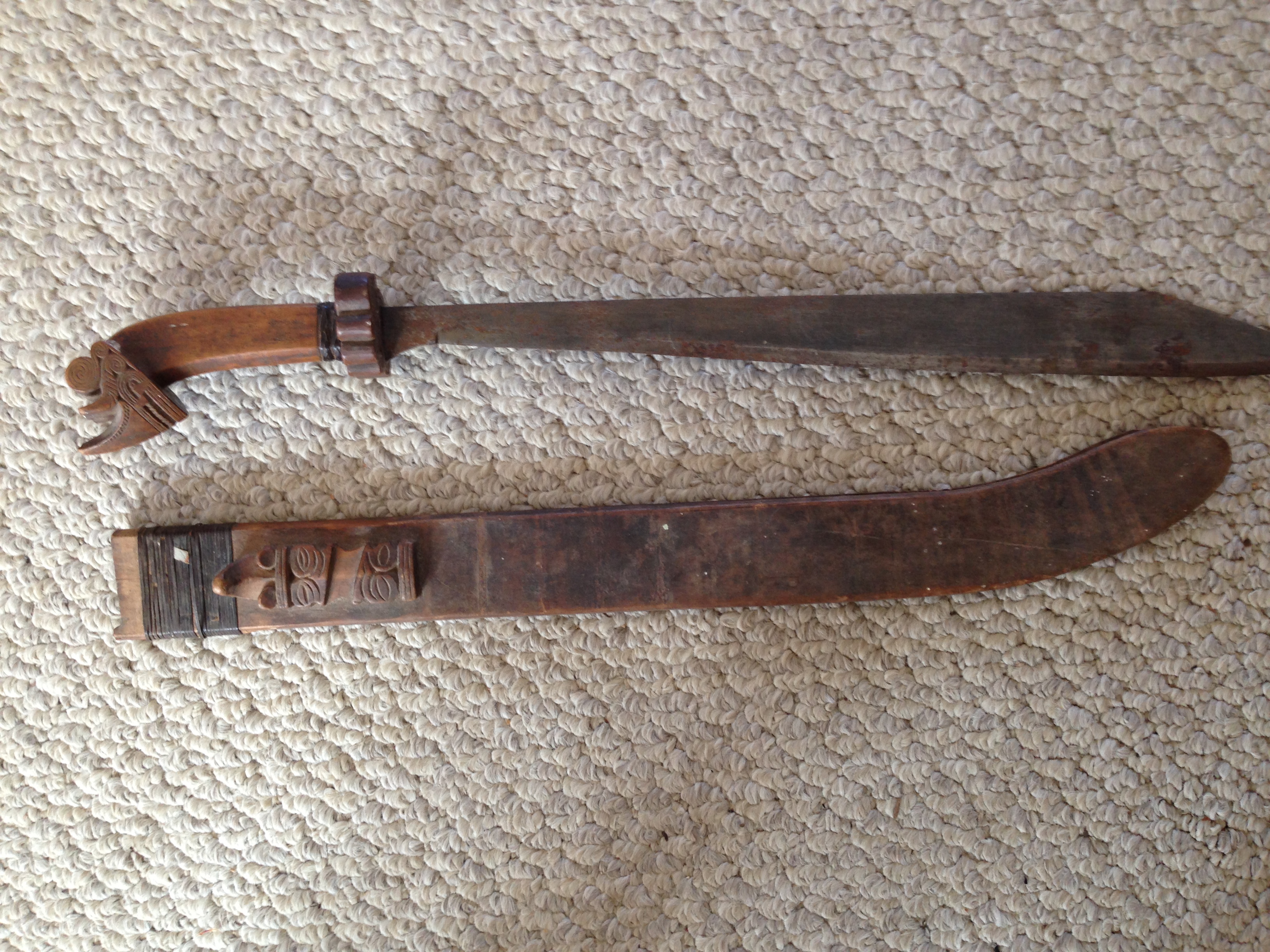 It has a hand carved handle and wooden sheath. I have not cleaned it up, so it is in original condition as given to me.