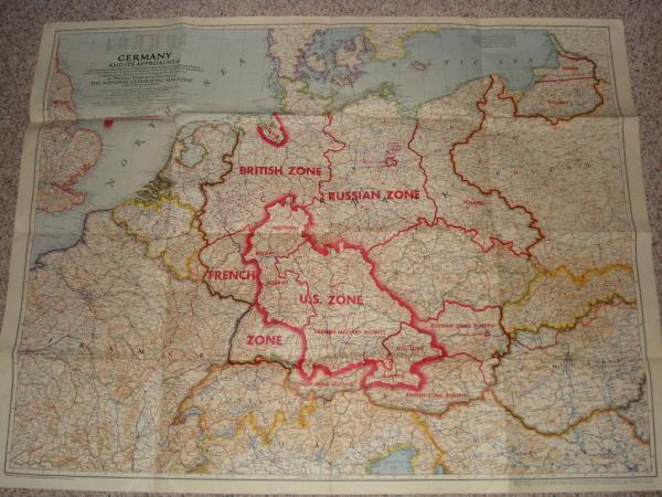 I was given this map as a gift. It was part of my wife's great uncle's WWII belongings. He passed away in 1994, and this was given to my mother-in-law, along with a belt buckle bearing "Sixth Armored Division" and the respective logo on it. From what I know, he fought in the Battle of the Bulge with the United States army. The map was originally printed in National Geographic, but this particular map was printed with occupational zones on it for the military. This particular map has the description, "This edition for use by War and Navy Department Agencies only - Not for sale or distribution." I am not interested in selling this map as I am just now getting started with collecting WWII-related militaria. What I am interested in is the story behind this map and a potential value it may have. Thank you in advance for any help that can be provided.