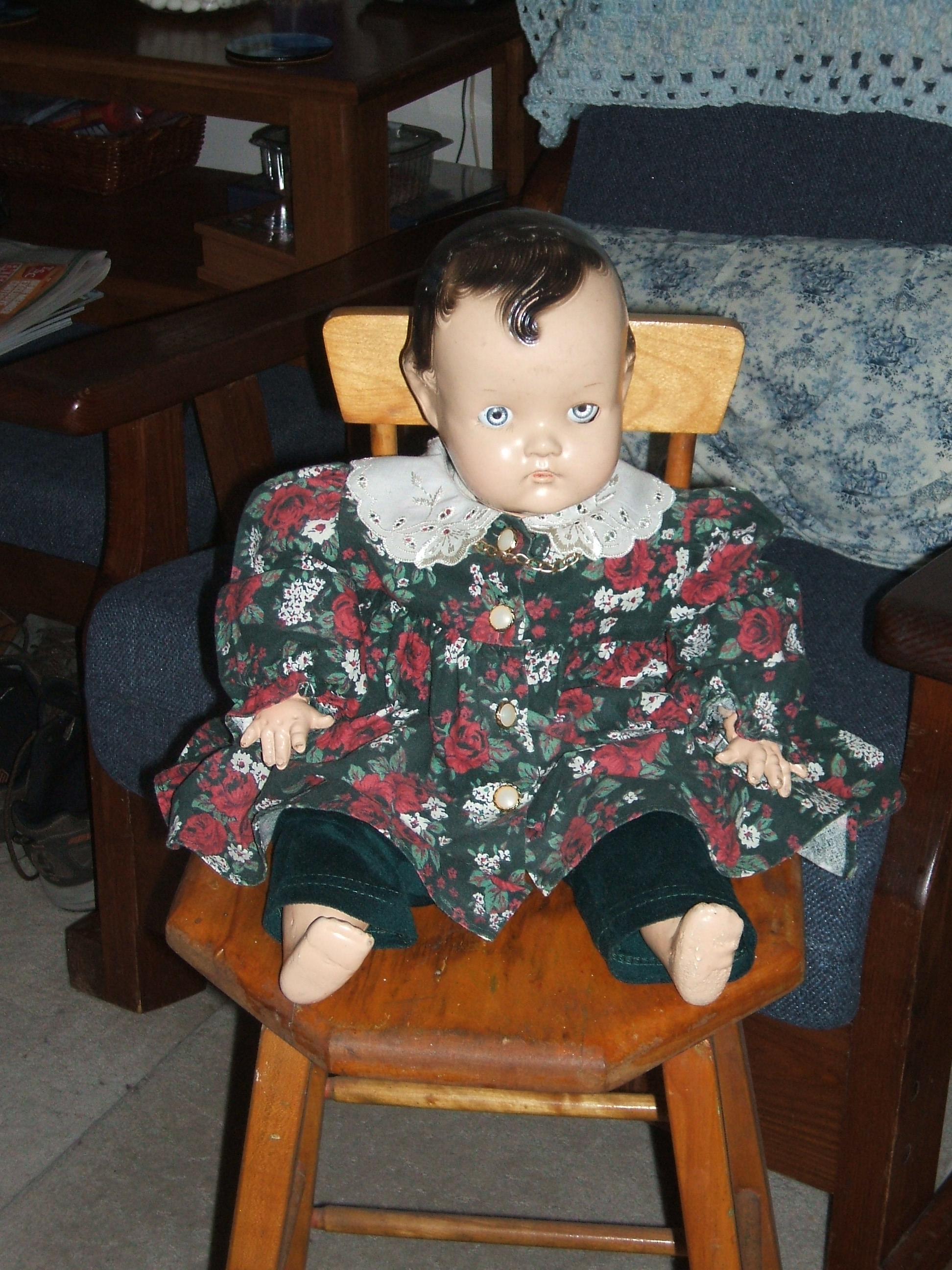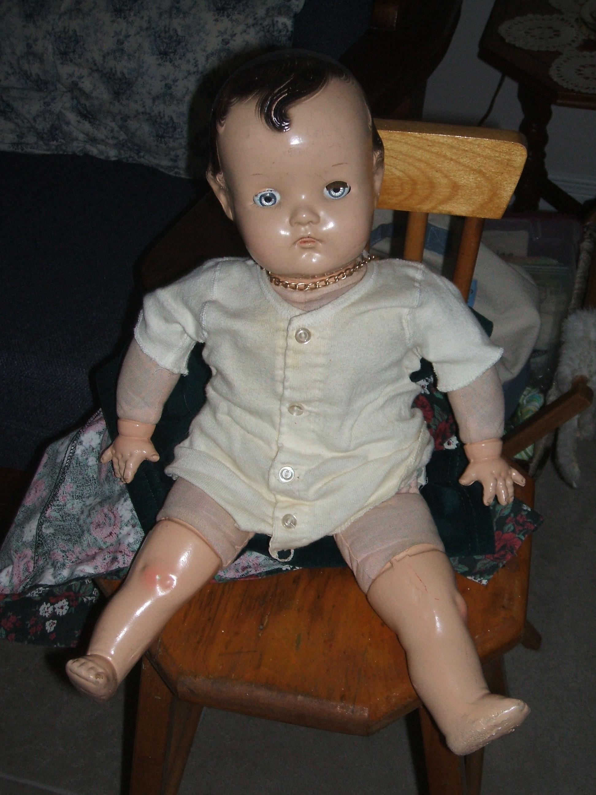1945-given as Birthday present -eyelids close and open-composite doll-rt eye missing eyelashes, otherwise in great shape. Clothes not original-approximately 16" long. body soft arms, legs and head-not sure if it is wood or not