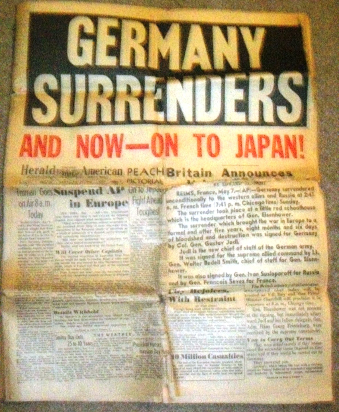 Chicago Herald American, 'An American paper for the American people'. Headlines=Germany Surrenders!" issued on Tuesday, May 8, 1945
