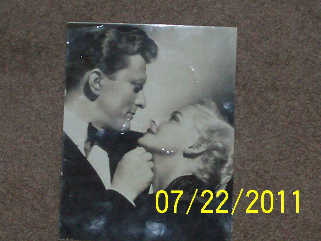 It's an old black and white photograph of Kirk Douglas and Laraine Day posing romantically in the film "My Dear Secretary".It's also got a Hollywood approved advertising code administration stamp dated jul'13 1948.