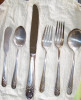 Holmes & Edwards, 1949, Spring Garden Flatware; 8 knives, 8 ice tea spoons, 16 teaspoon, 8 Tables spoon, 8 salad fork, 8 dinner fork, 1 serving spoon, 1 slotted serving spoon, 1 butter knife, 1 sugar spoon.