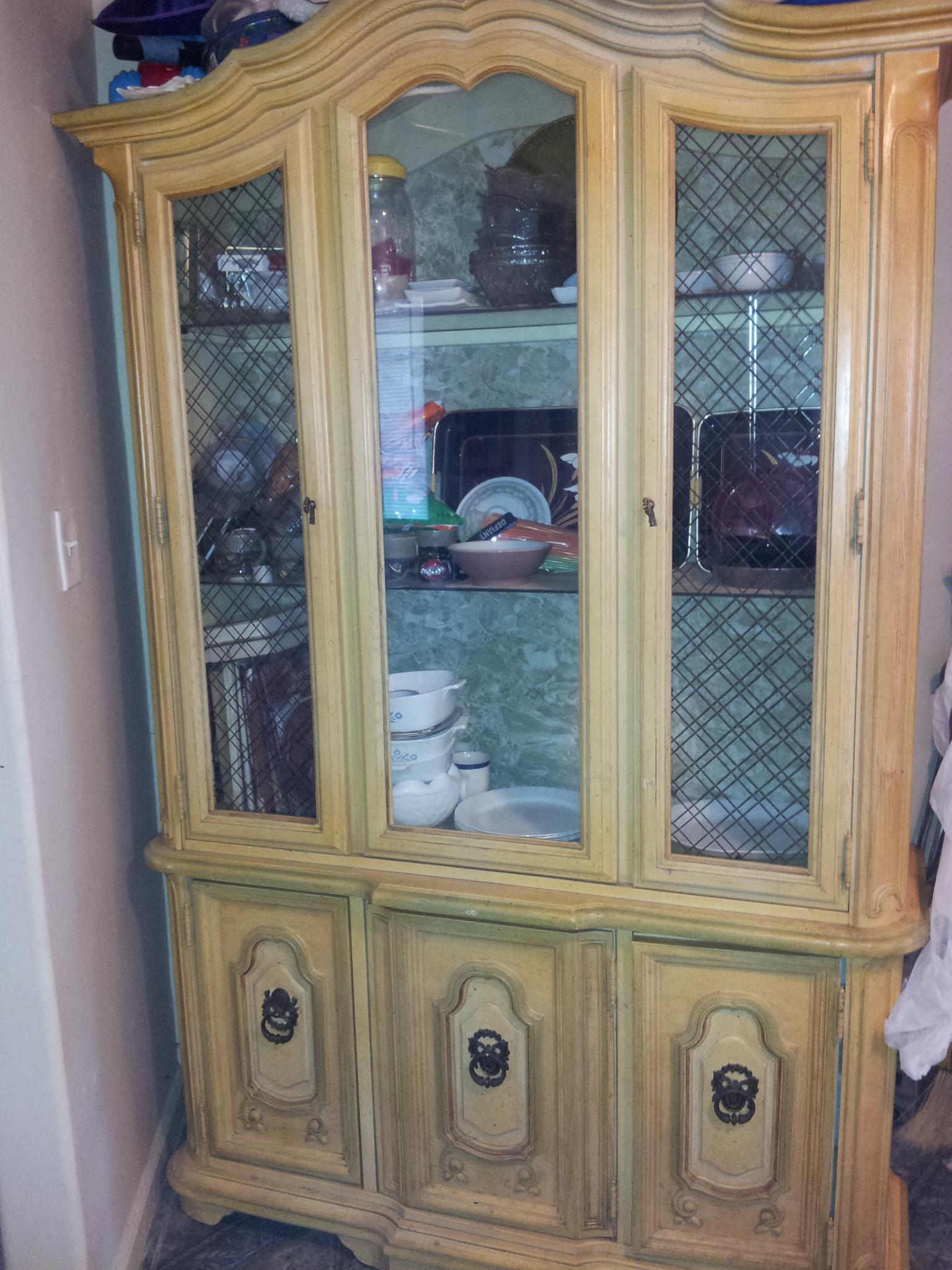 This is an old china hutch & side bar . It's got original glass doors & shelving, with all the original knobs. It's a pair with a side/buffet bar.