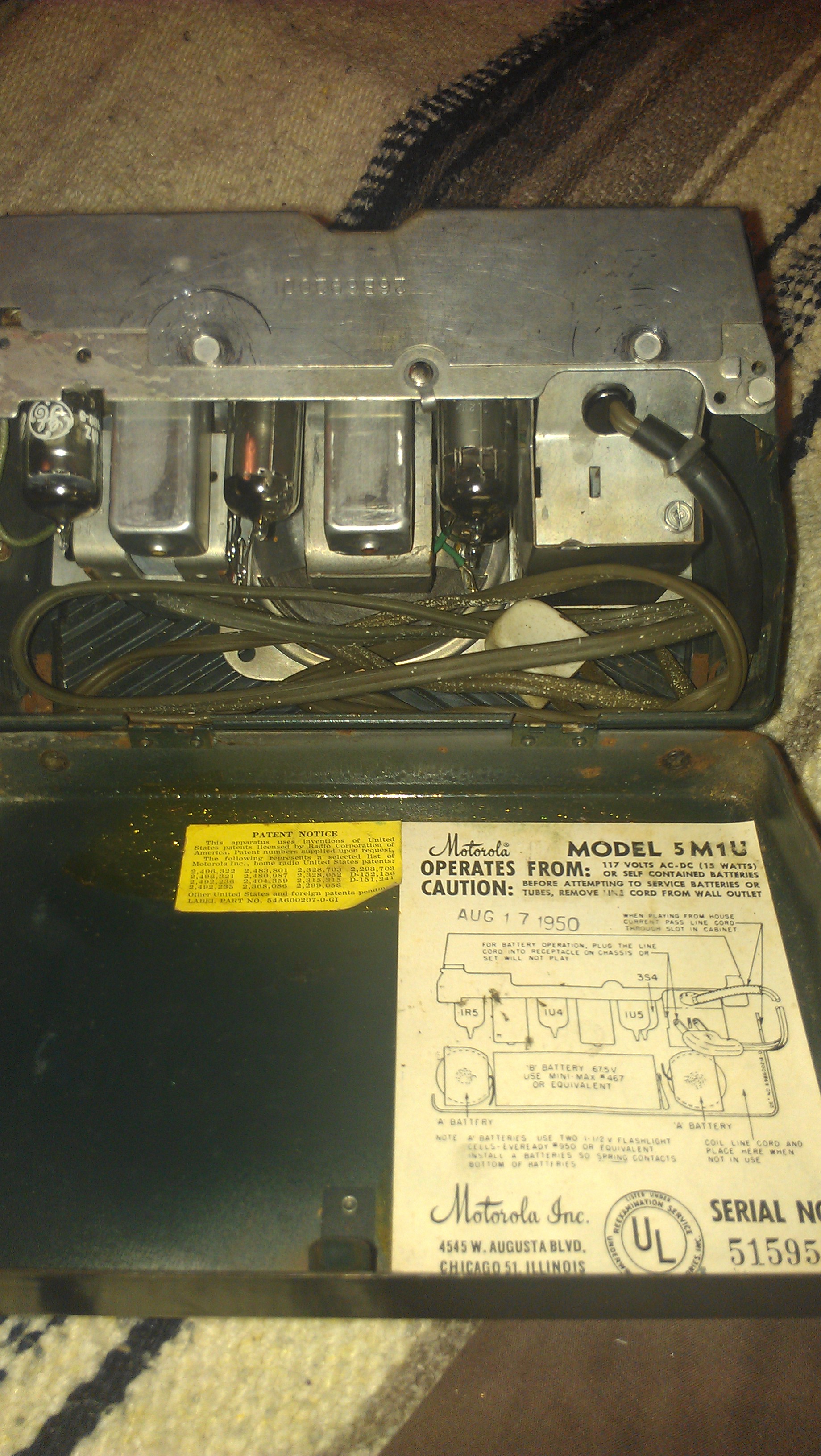 Fri.green metal body, two tone, front lid lifts & closes over dials. Model 5M1U, 117 ac/dc, 15 watts or self cont.batt. Have never come across or seen one like this til now. Almost mint cond..all orig.2 dials, the orig.papers are still in back & stamped Aug.27th, 1950. I do have knowledge on radios, have quit e a collection, that I would liketo start selling. Would consider selling this one fair & reasonably.