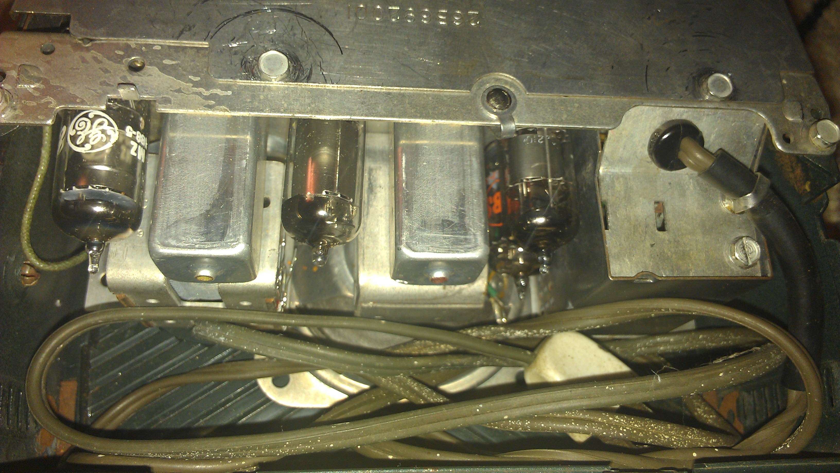 Metal body, handle on top w snap shut front, dark green,4 tube, looks as if cord was changed.