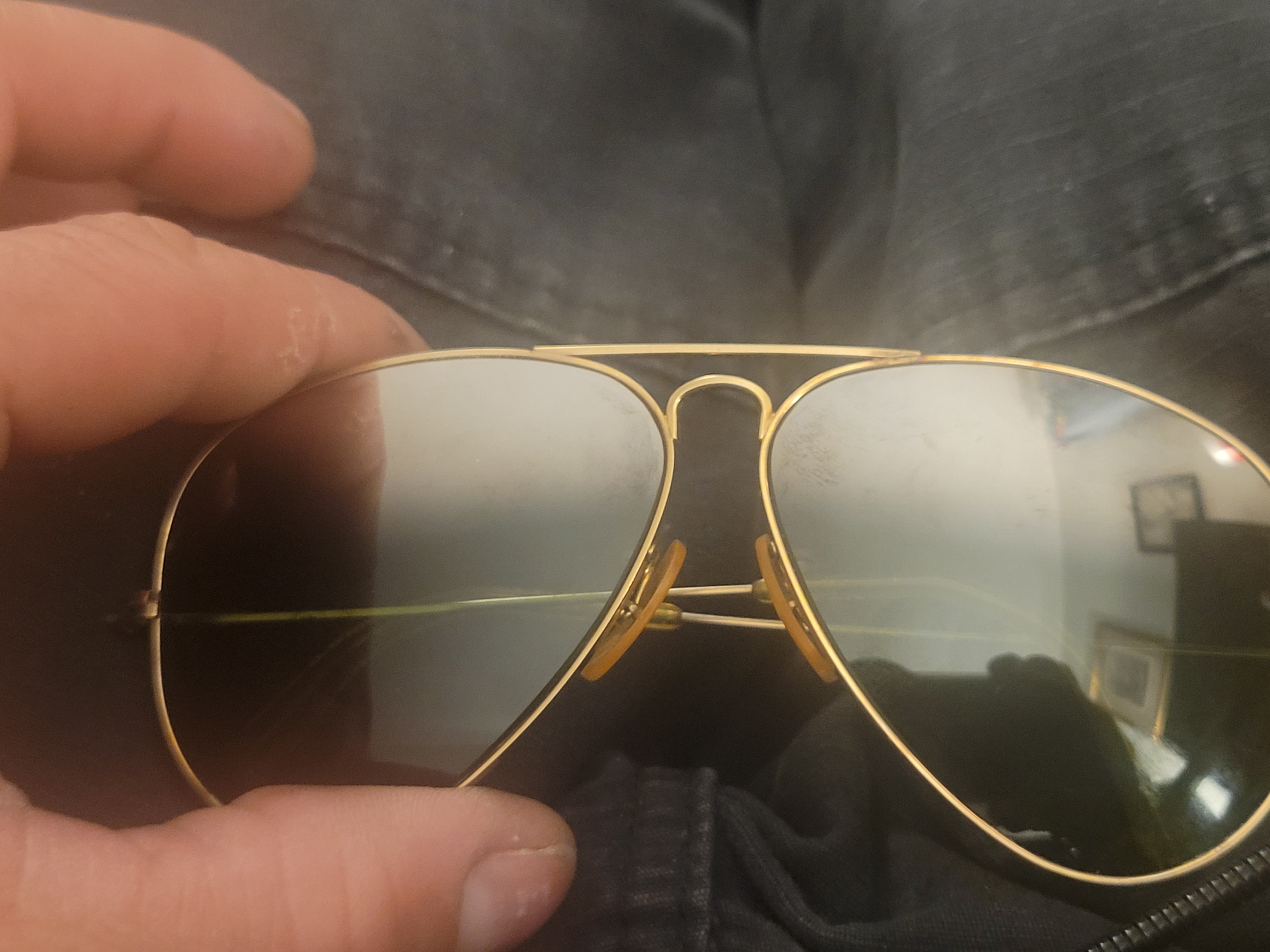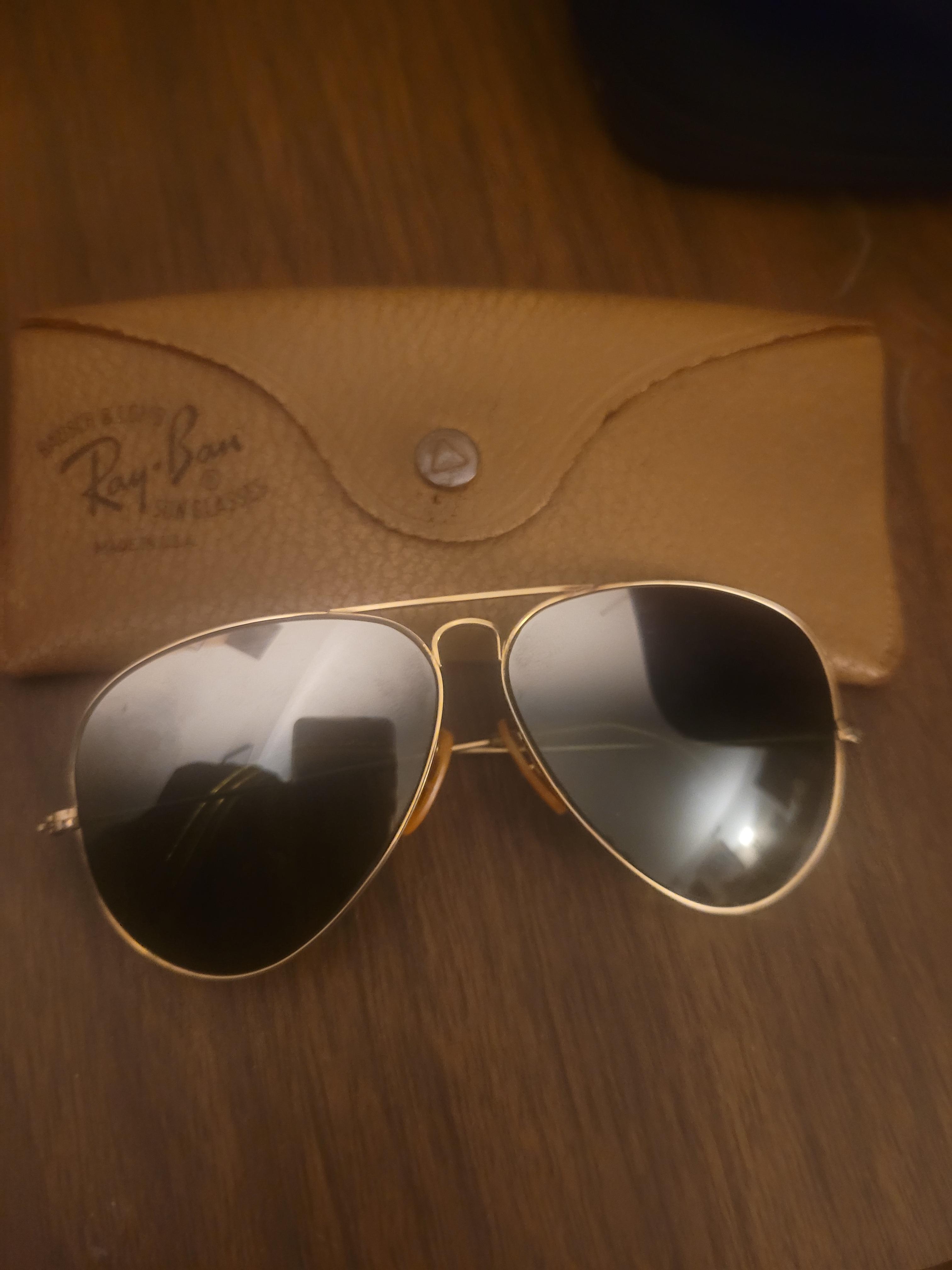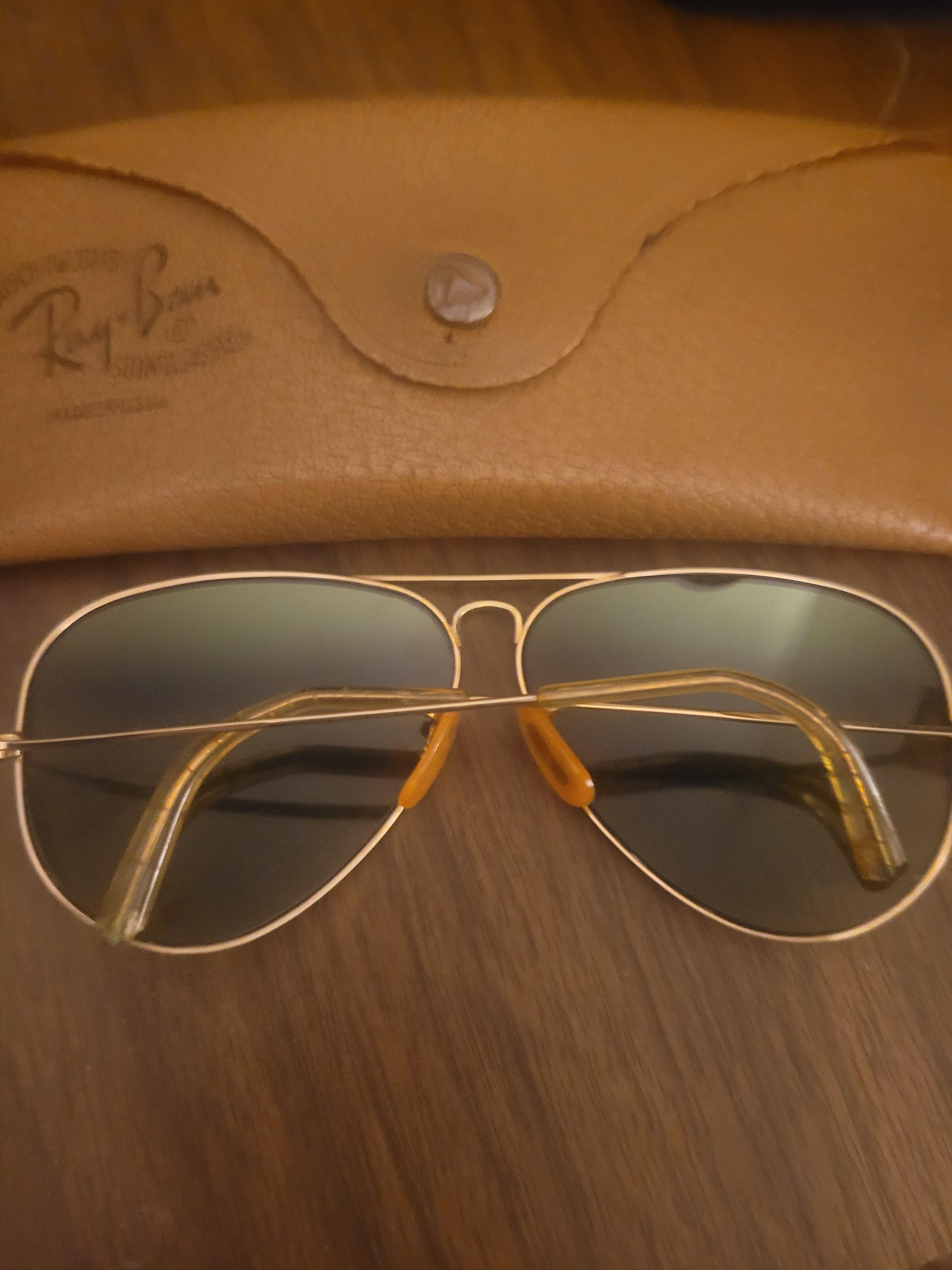 1950's dual shaded ray ban sunglasses aviators ear pieces are cracked and worn in broken original knows pizza's markings on the Bridge of the nose of the glasses green lenses with silver starting at the top to the middle of the lens Original case Good condition accordingly their age