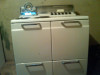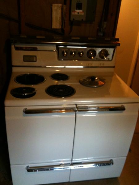 Working order 1950's Hotpoint Stove with a work surface, 4 burners. Right side has Full Bake/Broil Oven and Left side has warming drawer. 2 Storage drawers.