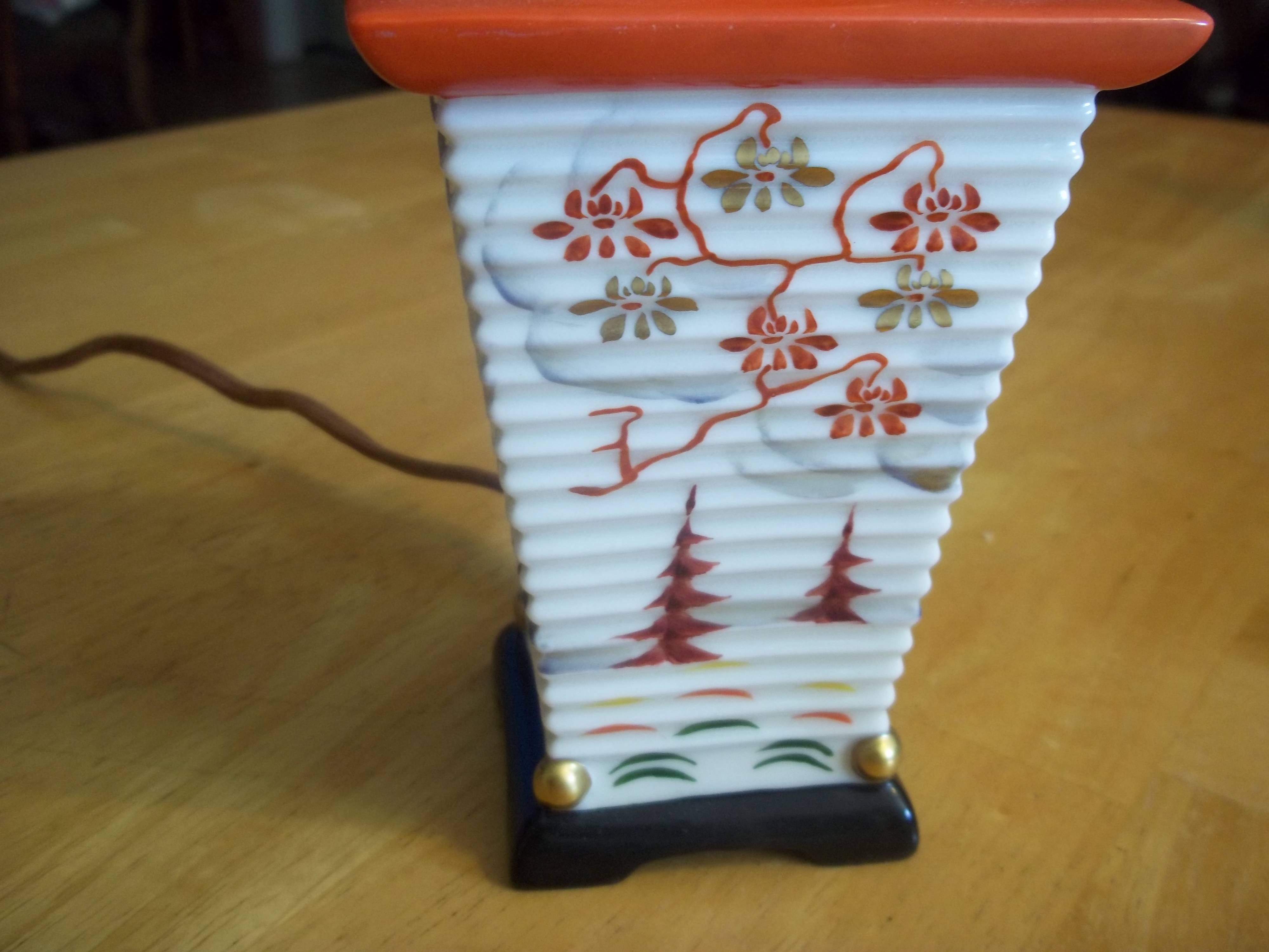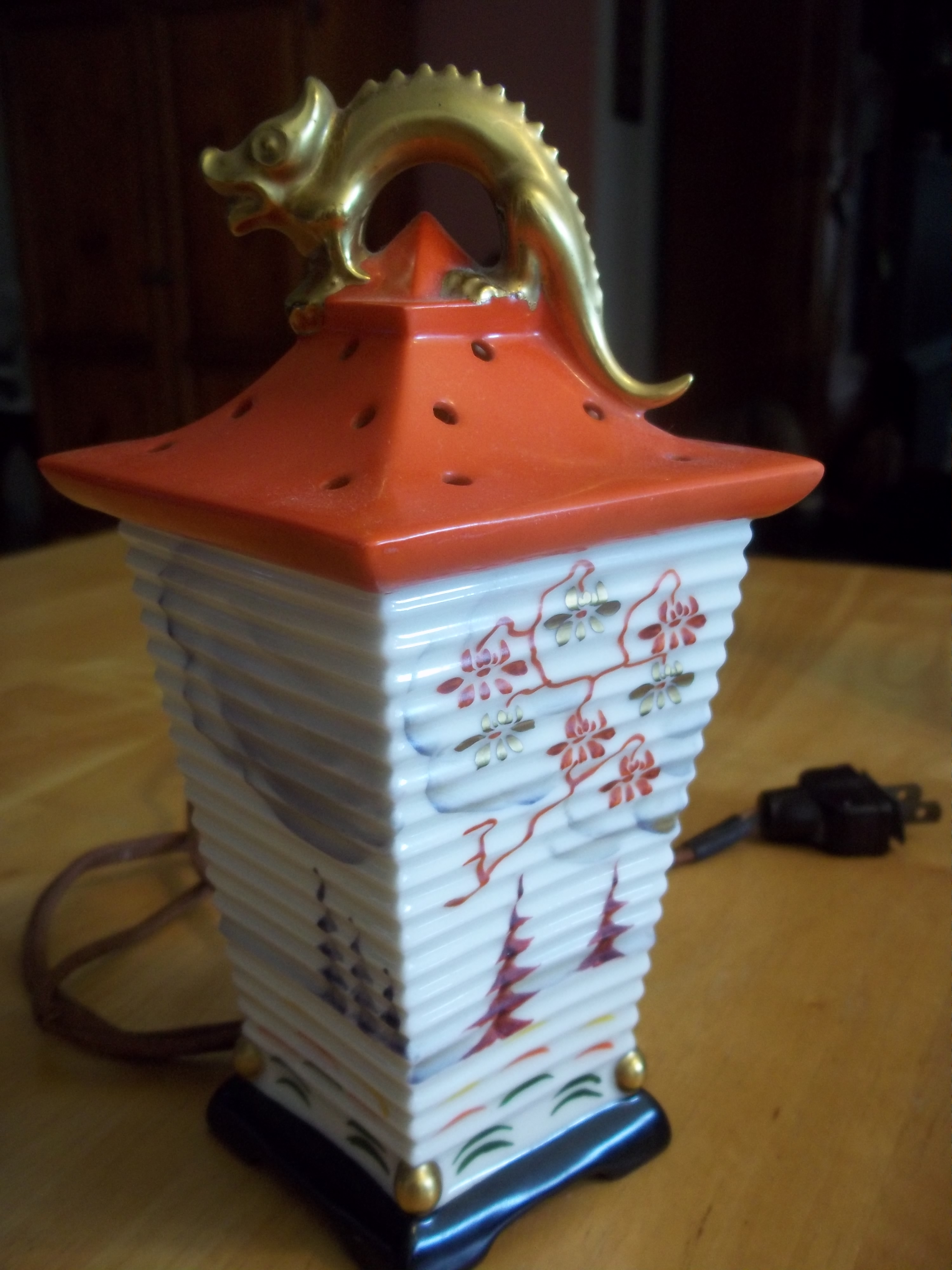 This is a light from the 50s I believe. It was my Grandmother's. It looks like a Japanese lantern or Japanese type building. there is a well for perfume in the top. When lit the light warms the perfume and you smell the scent. There is a gold dragon on the top, trees and blossoms on the sides. I would say it is probably a night light since the bulb is the kind you use in a nightlight. It has the original cord and plug and the lamp is in perfect condition. There are o chips, cracks or scrtches on it. It does still work. On the bottom there is a symbol and I think it may be Hummel but not sure.